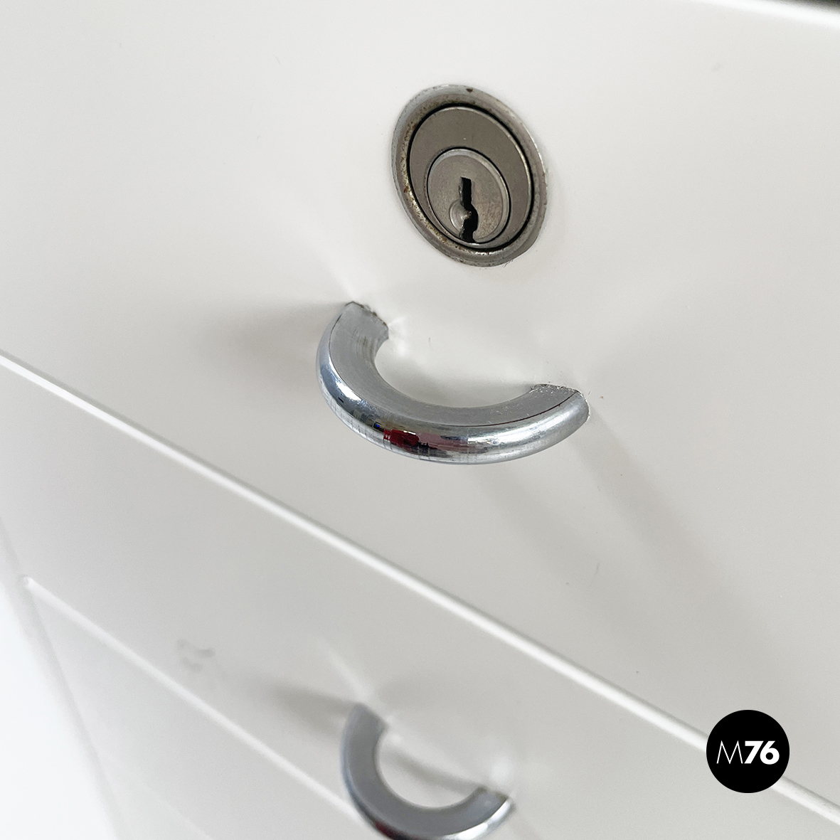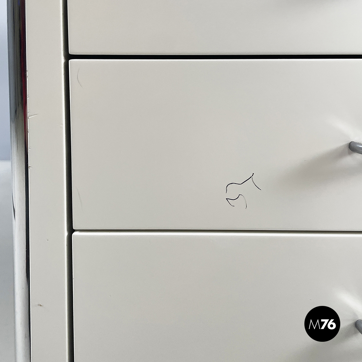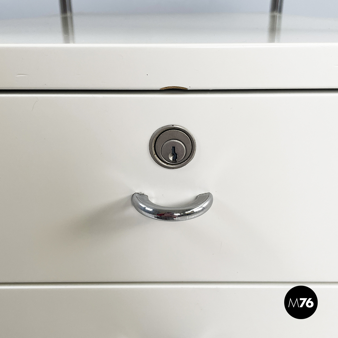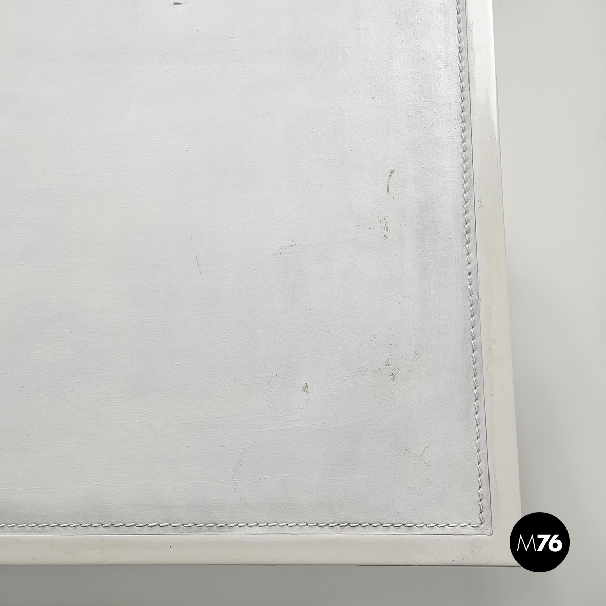 Scrivania modello Comacina con piano rettangolare in legno ed inserto rettangolare in pelle bianca. Sul lato è presente una cassettiera in legno verniciato bianco, la quale ha quattro cassetti con maniglie a semicerchio in metallo. La struttura è in tubolare di acciaio inox curvato. I cassetti possono essere posizionati sia sulla destra che sulla sinistra della seduta. Presenti in quattro piedini in gomma nera. Appartenente allo stile Bauhaus.