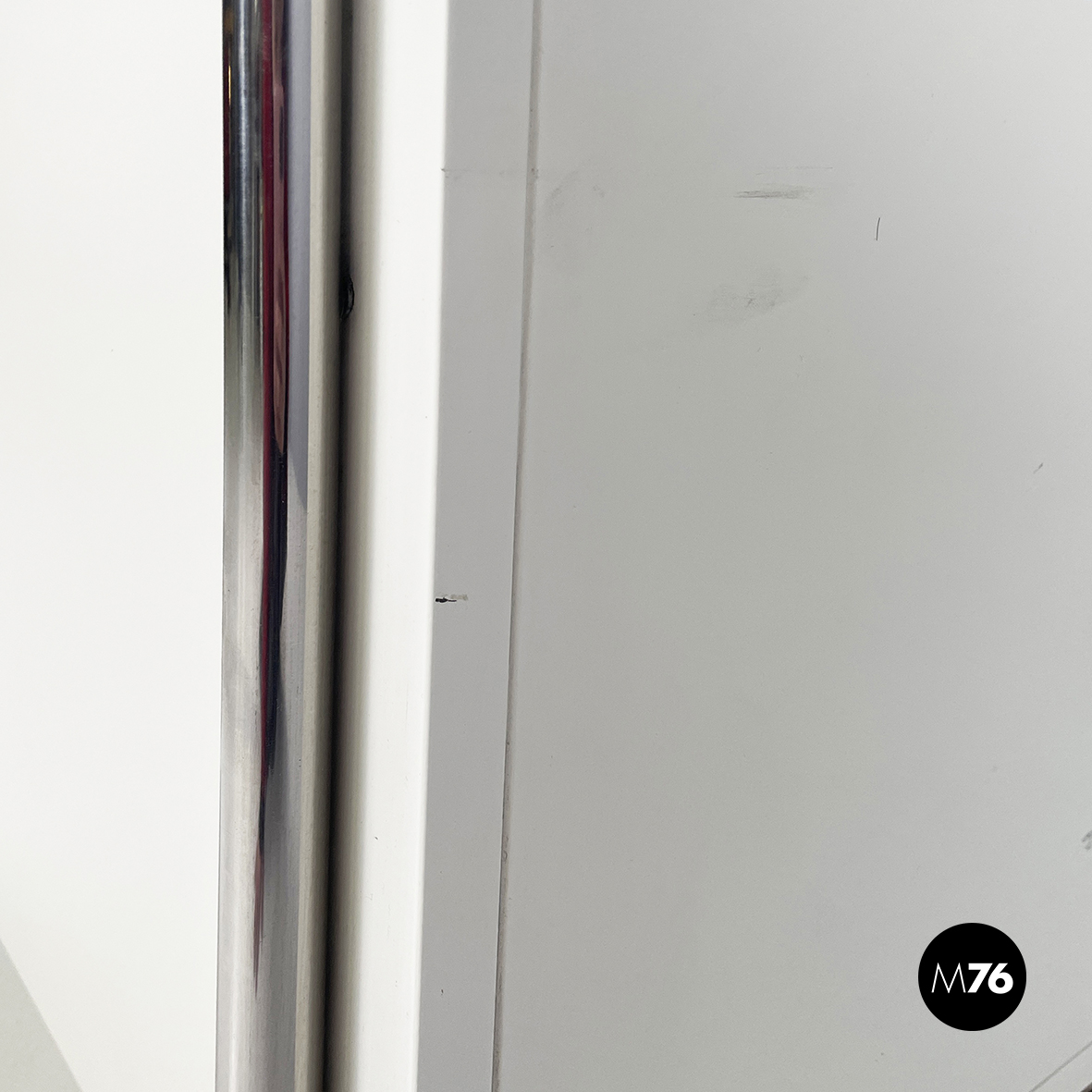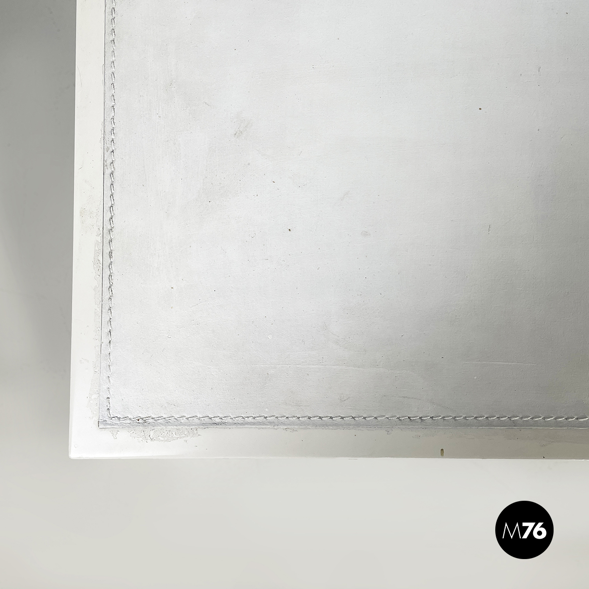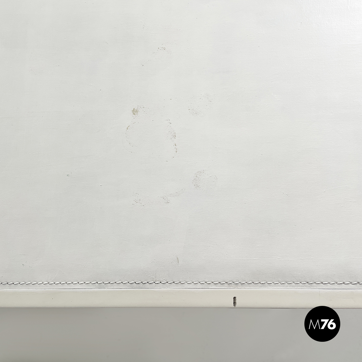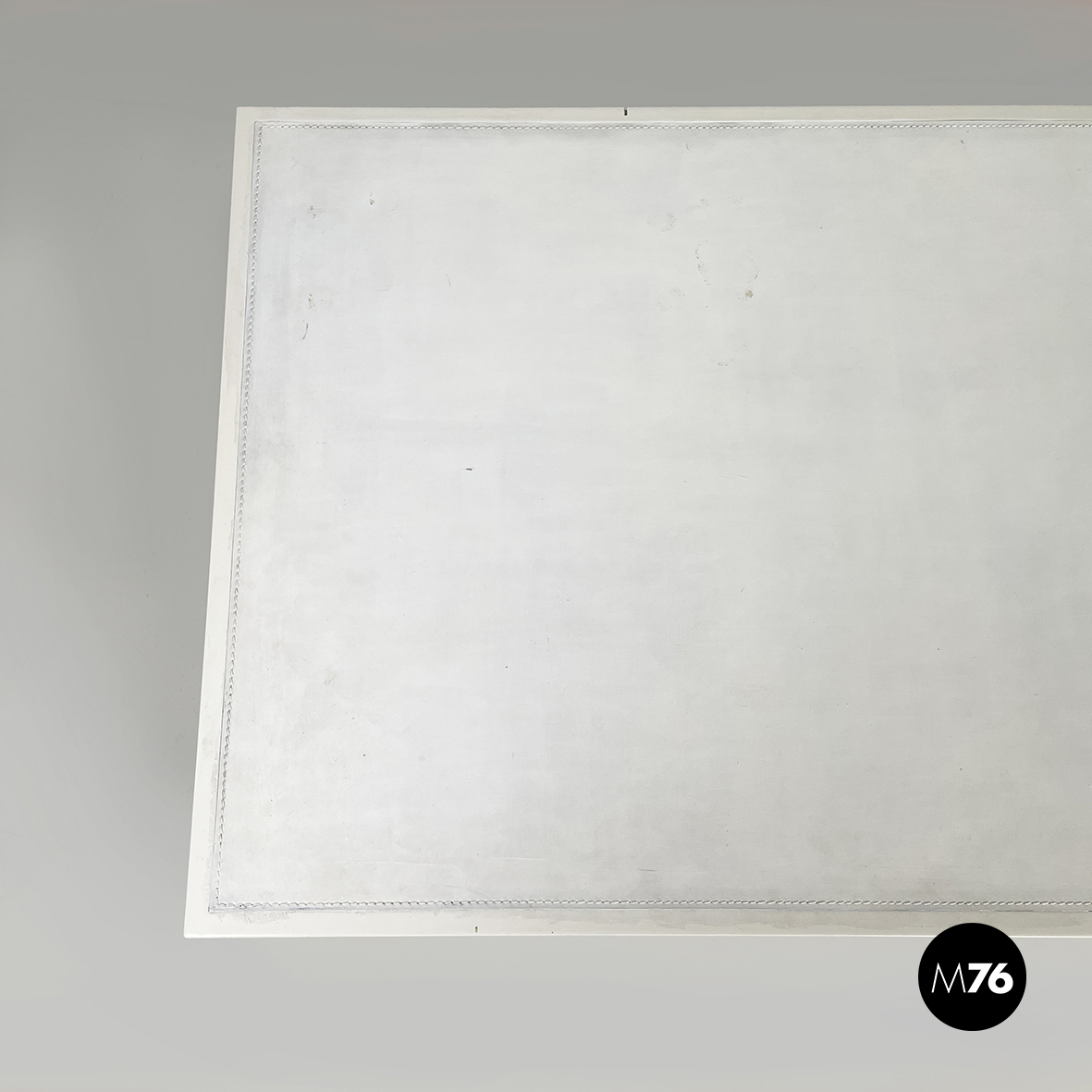 Scrivania modello Comacina con piano rettangolare in legno ed inserto rettangolare in pelle bianca. Sul lato è presente una cassettiera in legno verniciato bianco, la quale ha quattro cassetti con maniglie a semicerchio in metallo. La struttura è in tubolare di acciaio inox curvato. I cassetti possono essere posizionati sia sulla destra che sulla sinistra della seduta. Presenti in quattro piedini in gomma nera. Appartenente allo stile Bauhaus.