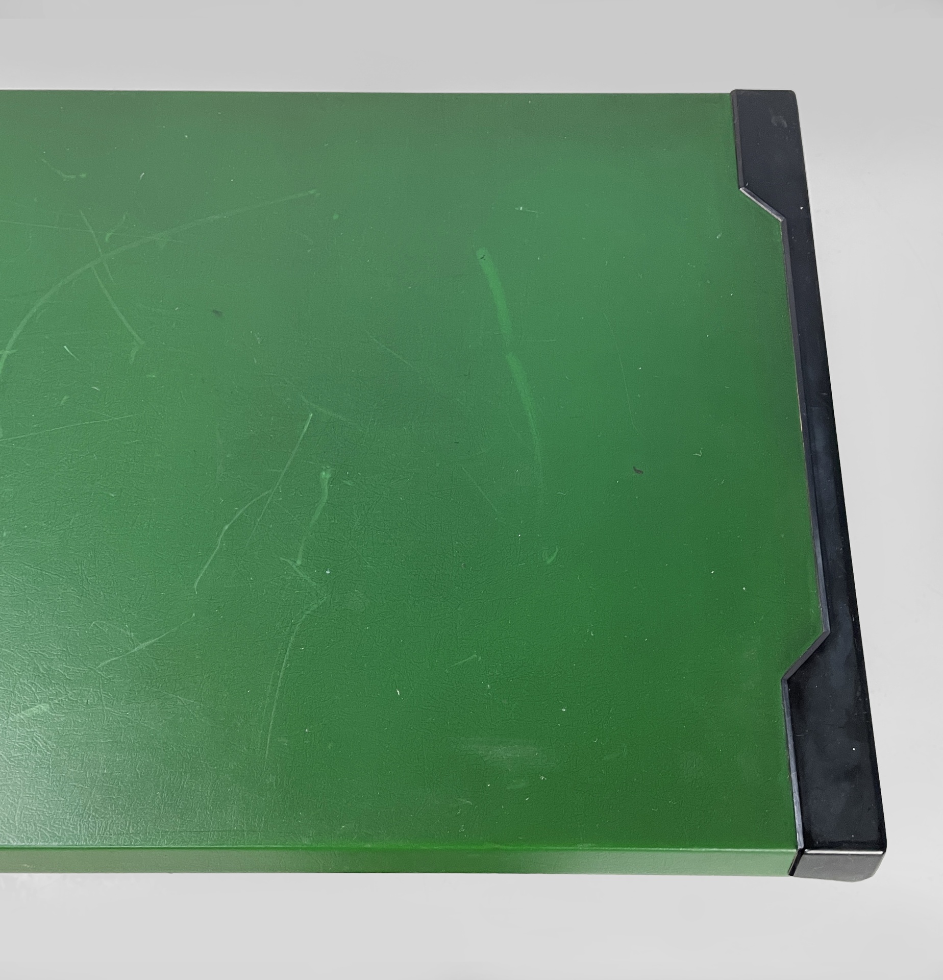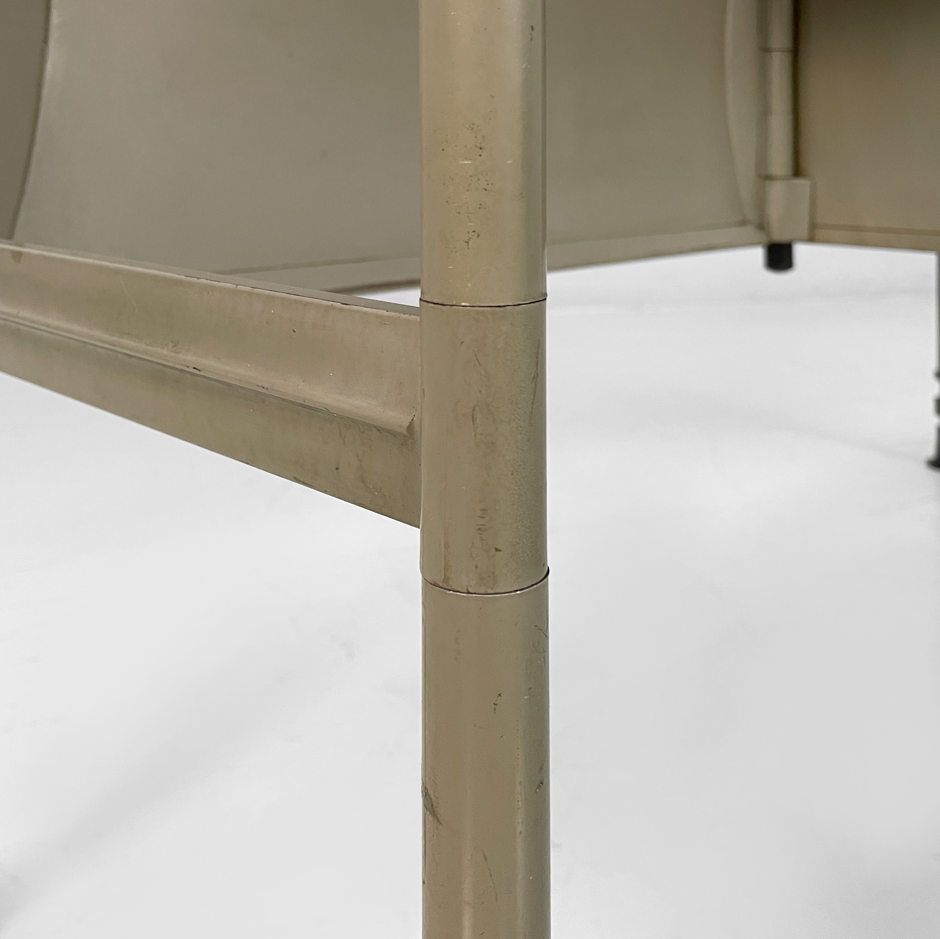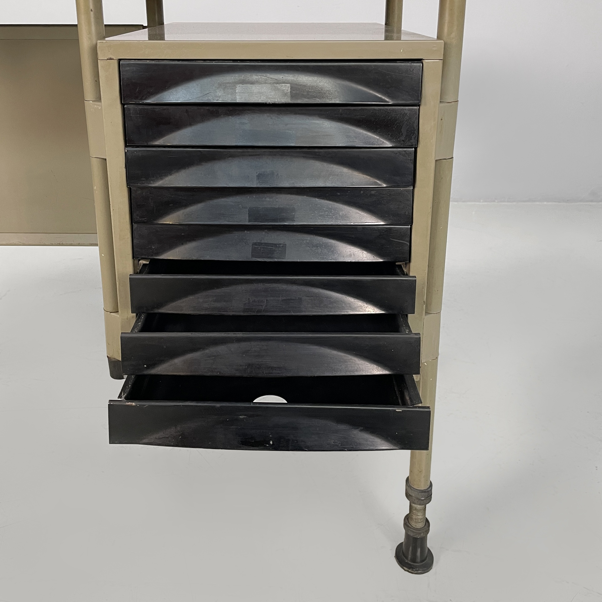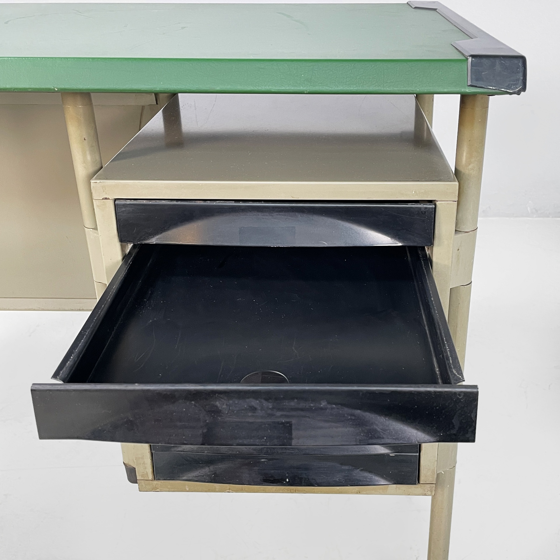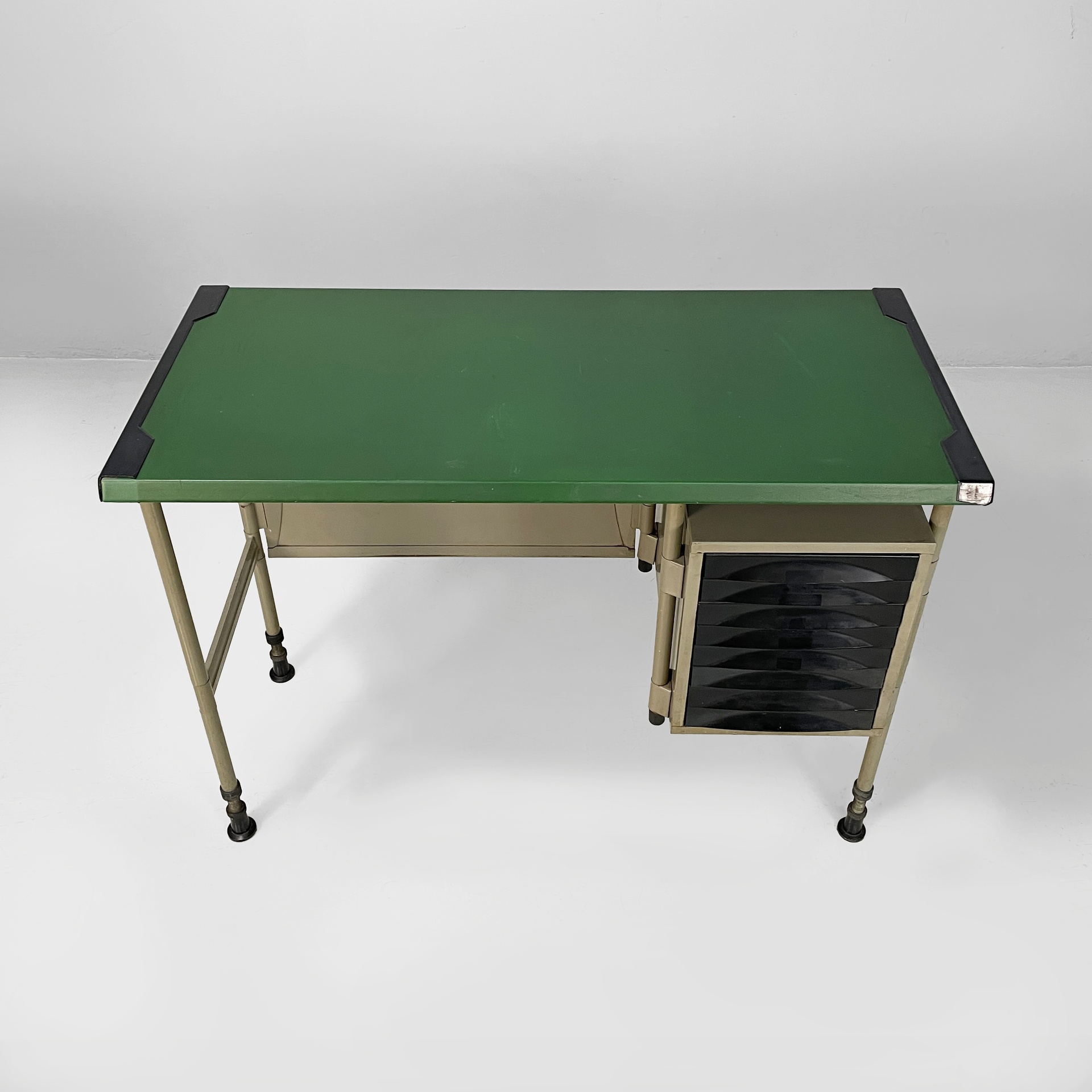 Scrivania con piano rettangolare in metallo rivestito in pelle verde ed angoli in plastica nera. Sotto il piano è presente una colonna di otto cassetti in metallo nero con struttura in metallo beige. Le zampe a sezione tonda in metallo beige hanno i piedini in plastica nera. Le zampe sono unite su un lato da una lamiera di metallo beige.