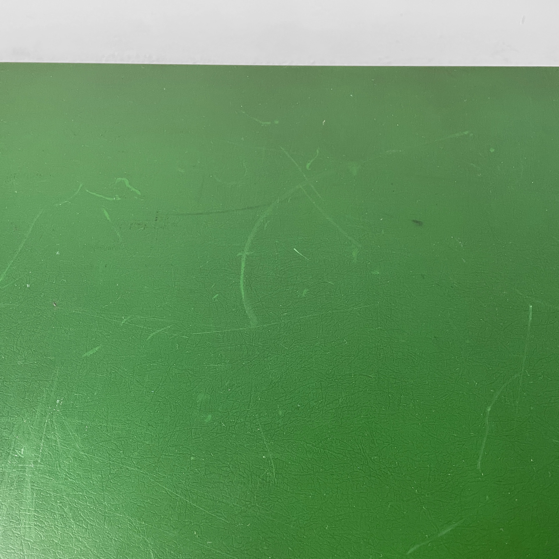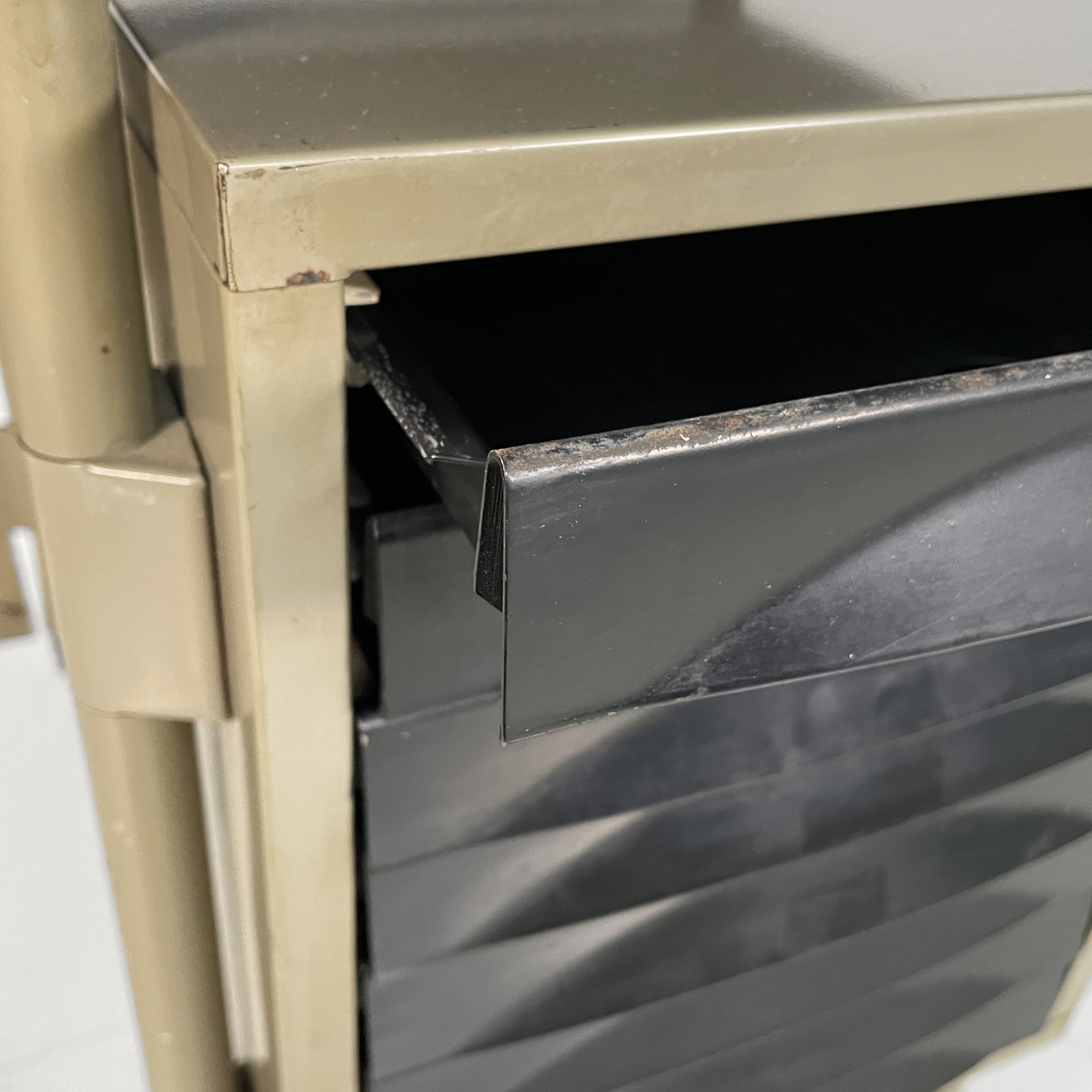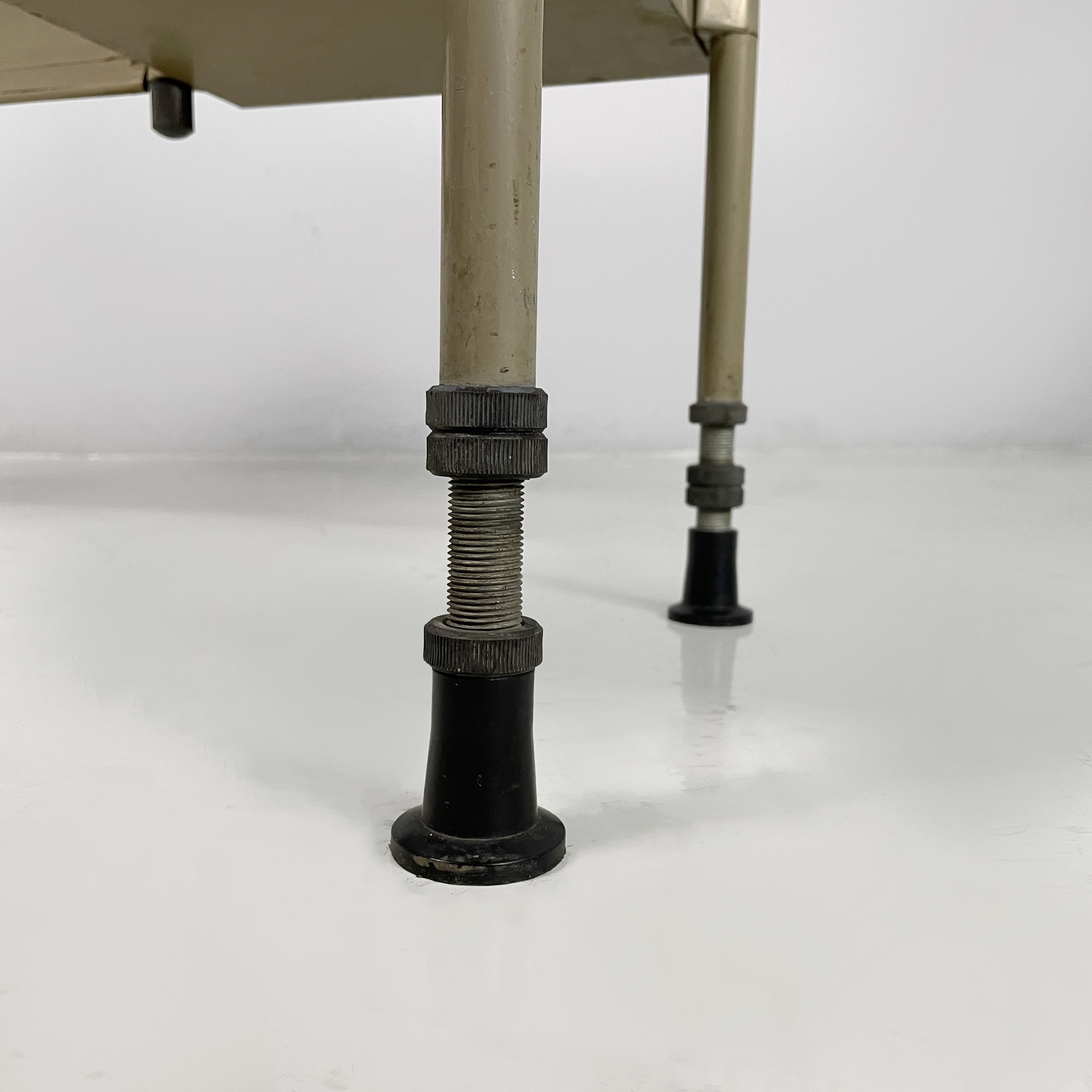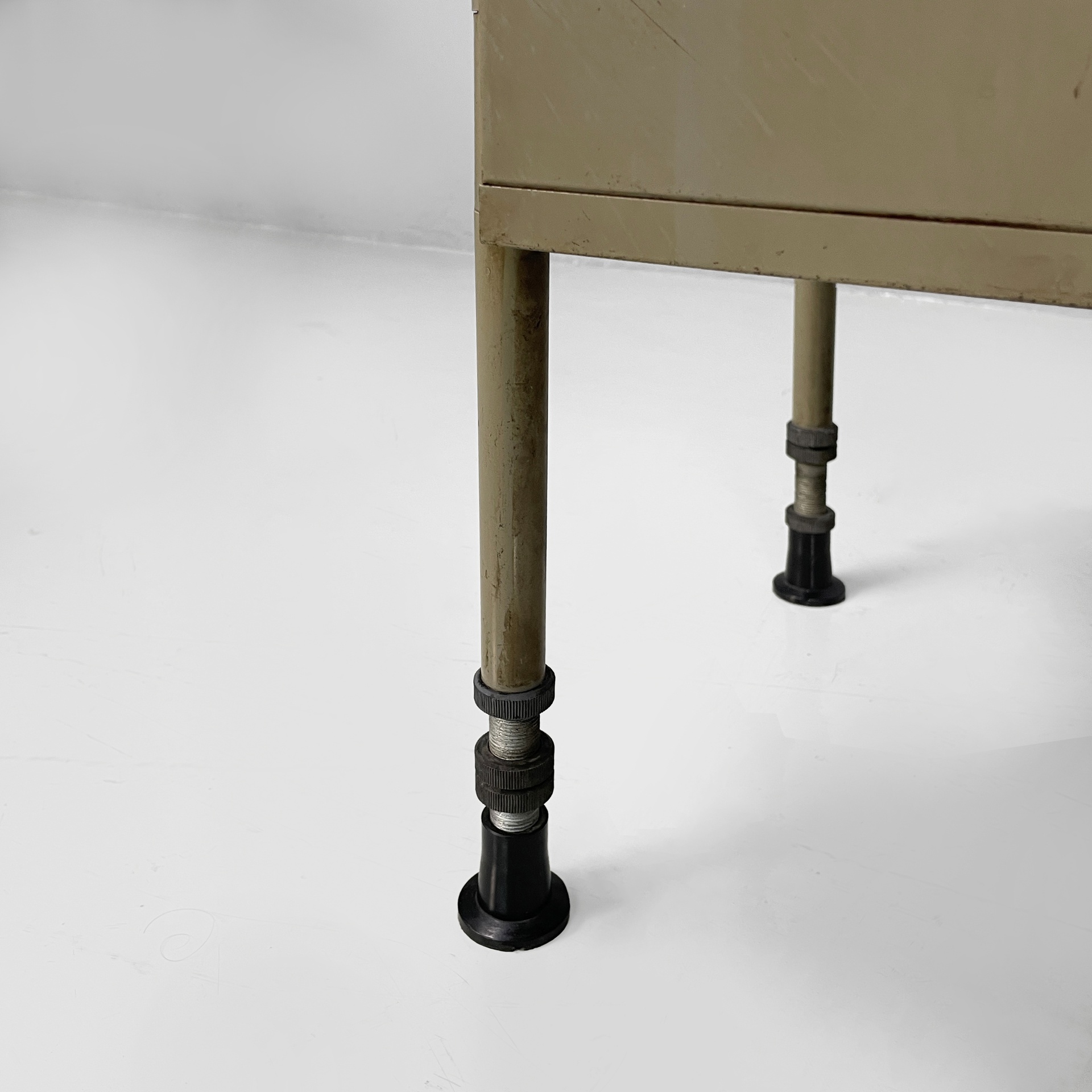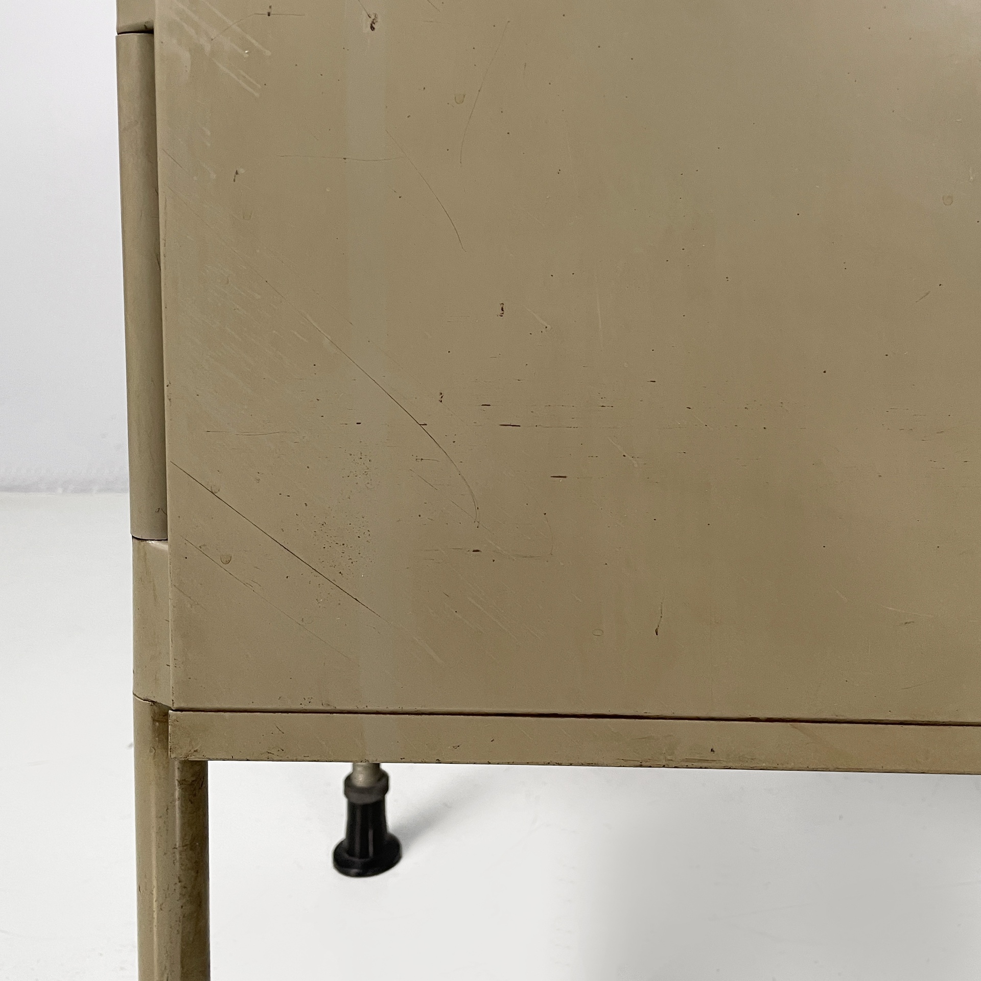 Scrivania con piano rettangolare in metallo rivestito in pelle verde ed angoli in plastica nera. Sotto il piano è presente una colonna di otto cassetti in metallo nero con struttura in metallo beige. Le zampe a sezione tonda in metallo beige hanno i piedini in plastica nera. Le zampe sono unite su un lato da una lamiera di metallo beige.