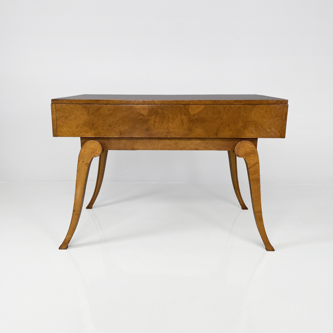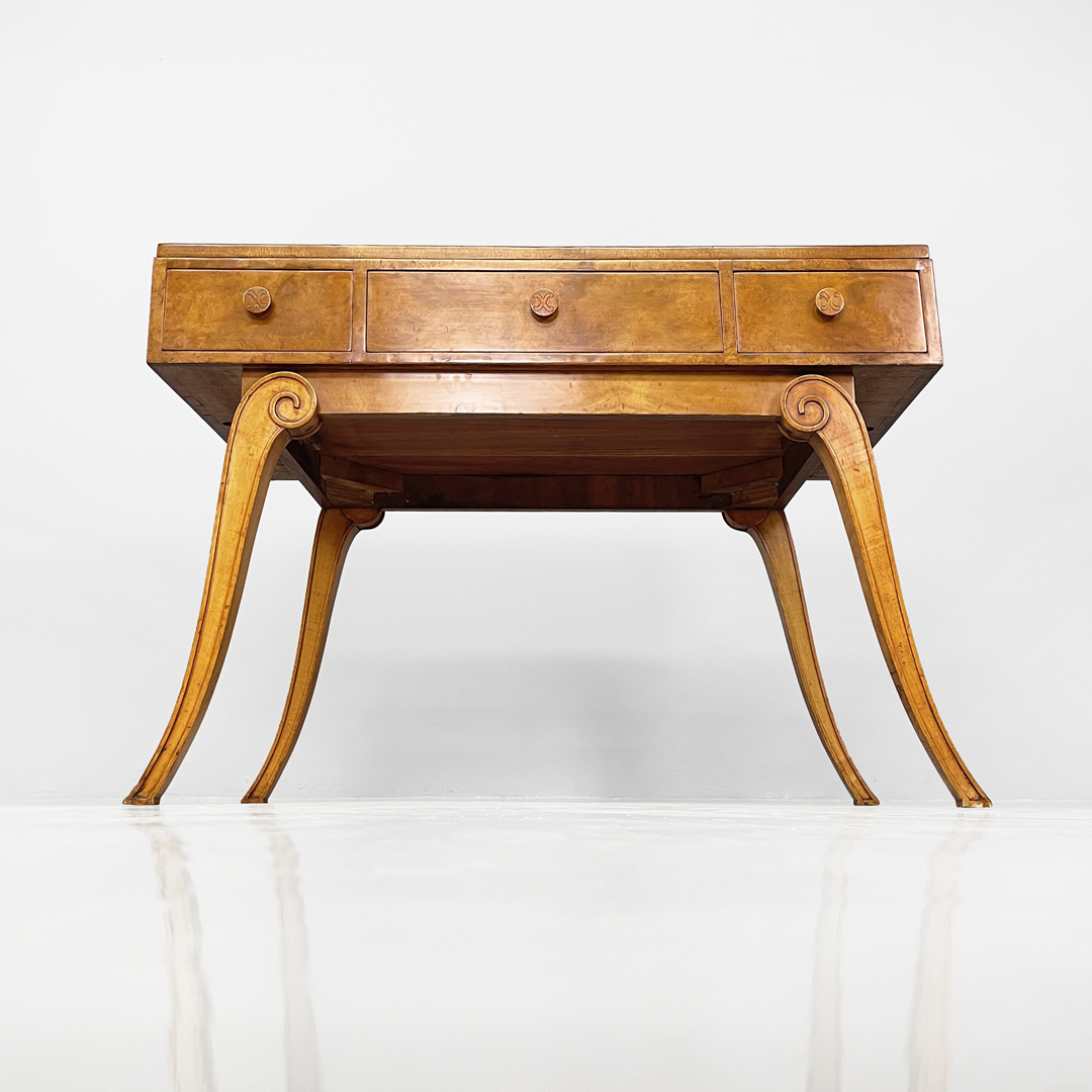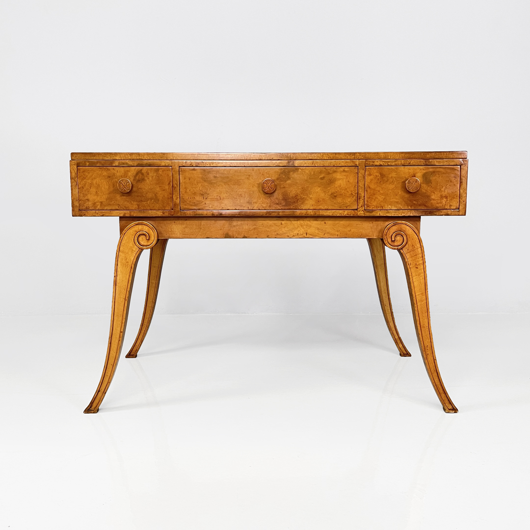Scrivania con piano rettangolare interamente in legno di noce. Sul fronte lo scrittoio presenta tre cassetti a scomparsa.