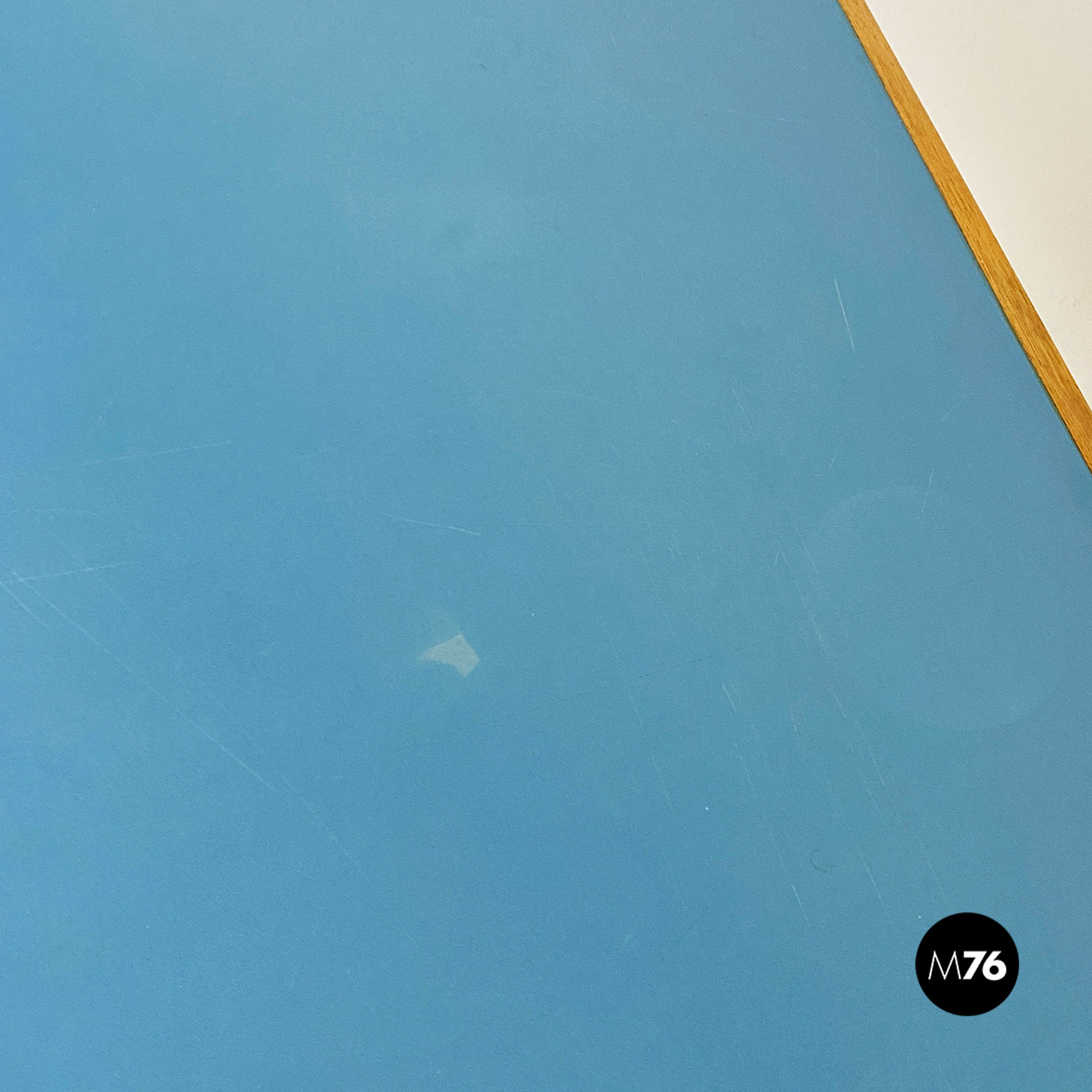 Scrivania con piano rettangolare in formica in blu chiaro, con struttura composta da quattro gambe e un cassetto centrale in legno massello chiaro.