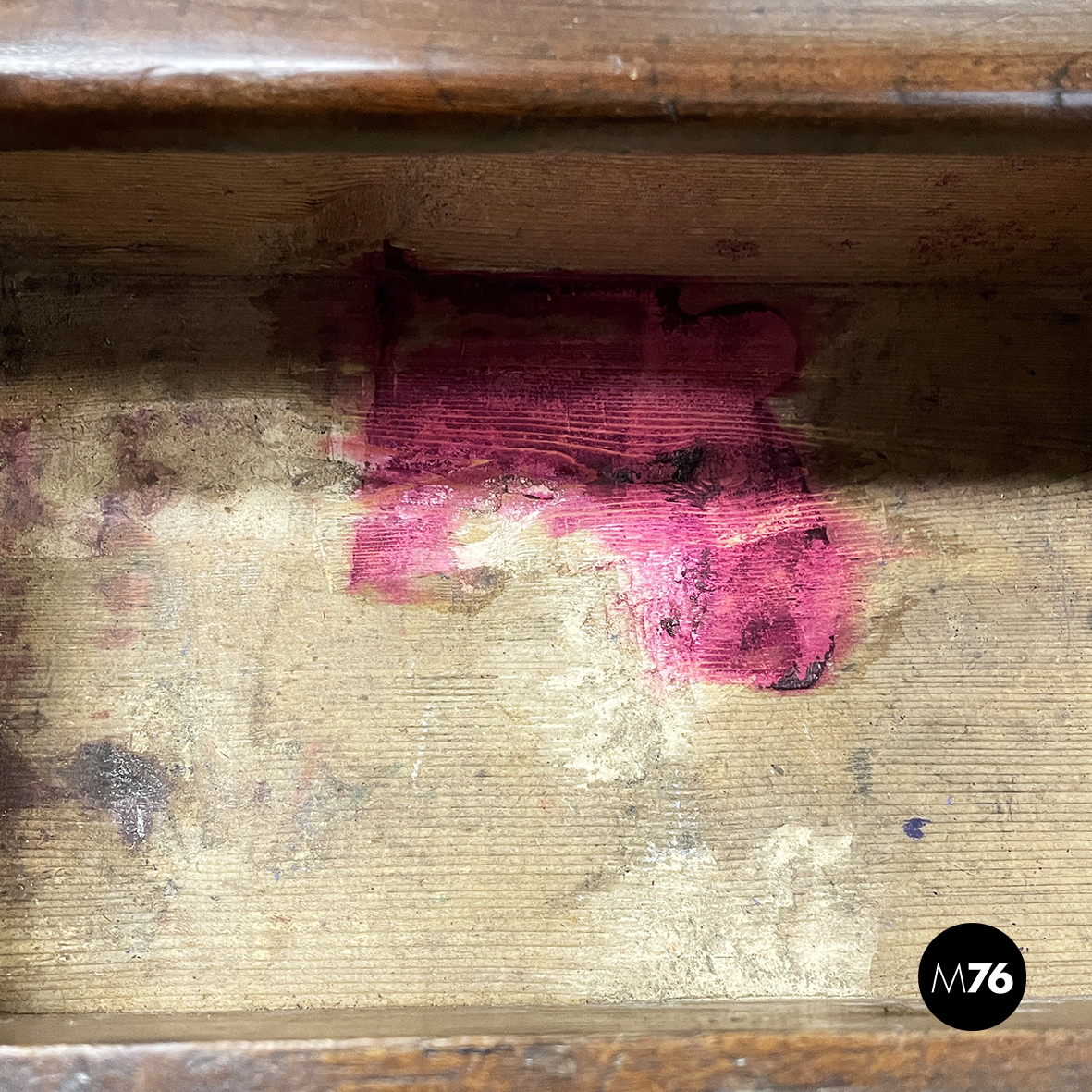 Buone condizioni per il periodo di provenienza. Presenta numerosi segni del tempo, soprattutto sul piano. All’interno di un cassetto del piano è presente una macchia rosa.