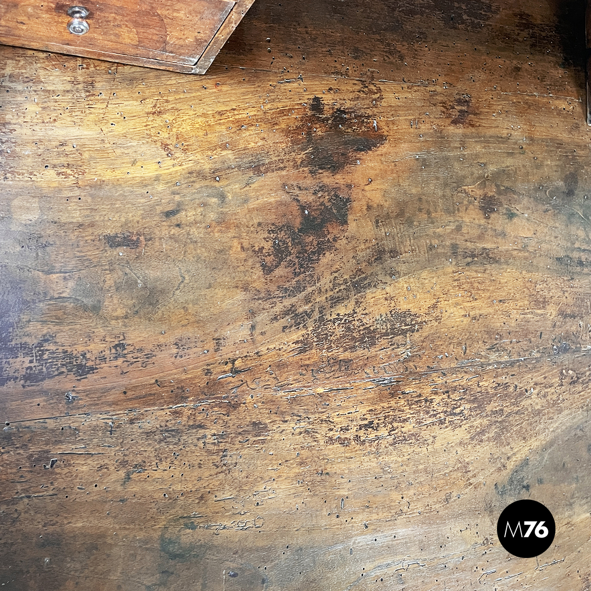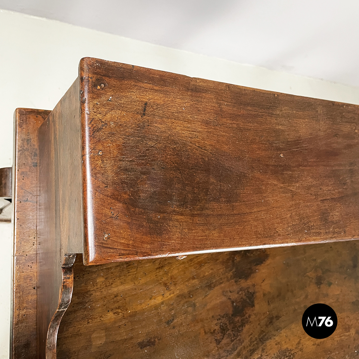Scrivania o scrittoio in legno di noce. Il piano rettangolare presenta una mensola rettangolare con lati decorati, un vano e 4 cassetti rettangolari con maniglie tonde. Sul fronte è presente un cassetto. Le zampe lavorate a sezione quadrata.