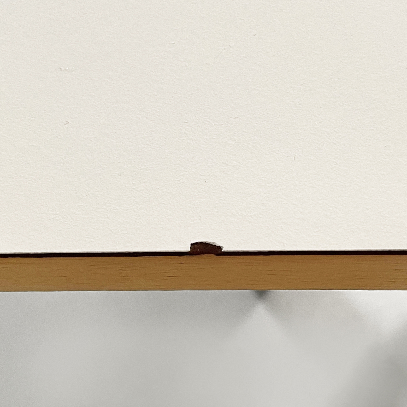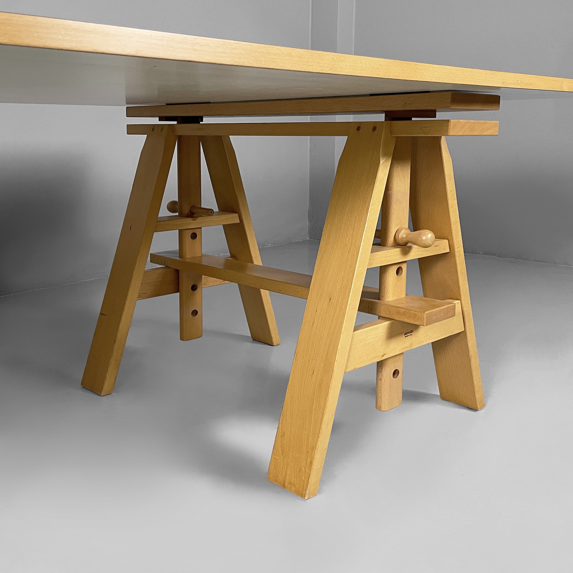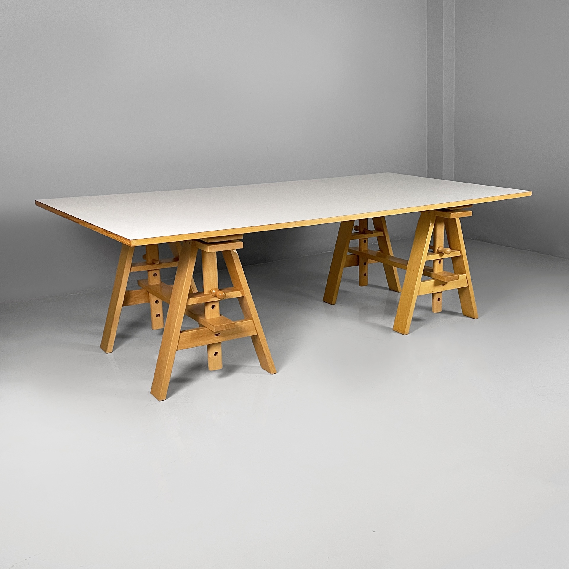 Scrivania modello Leonardo con piano rettangolare in legno con finitura bianca. Le due zampe a forma di cavalletto sono a listelli in legno. Le zampe sono regolabili in altezza. Utilizzabile anche come tavolo da pranzo.