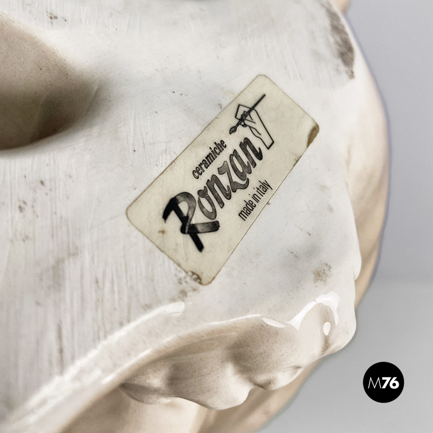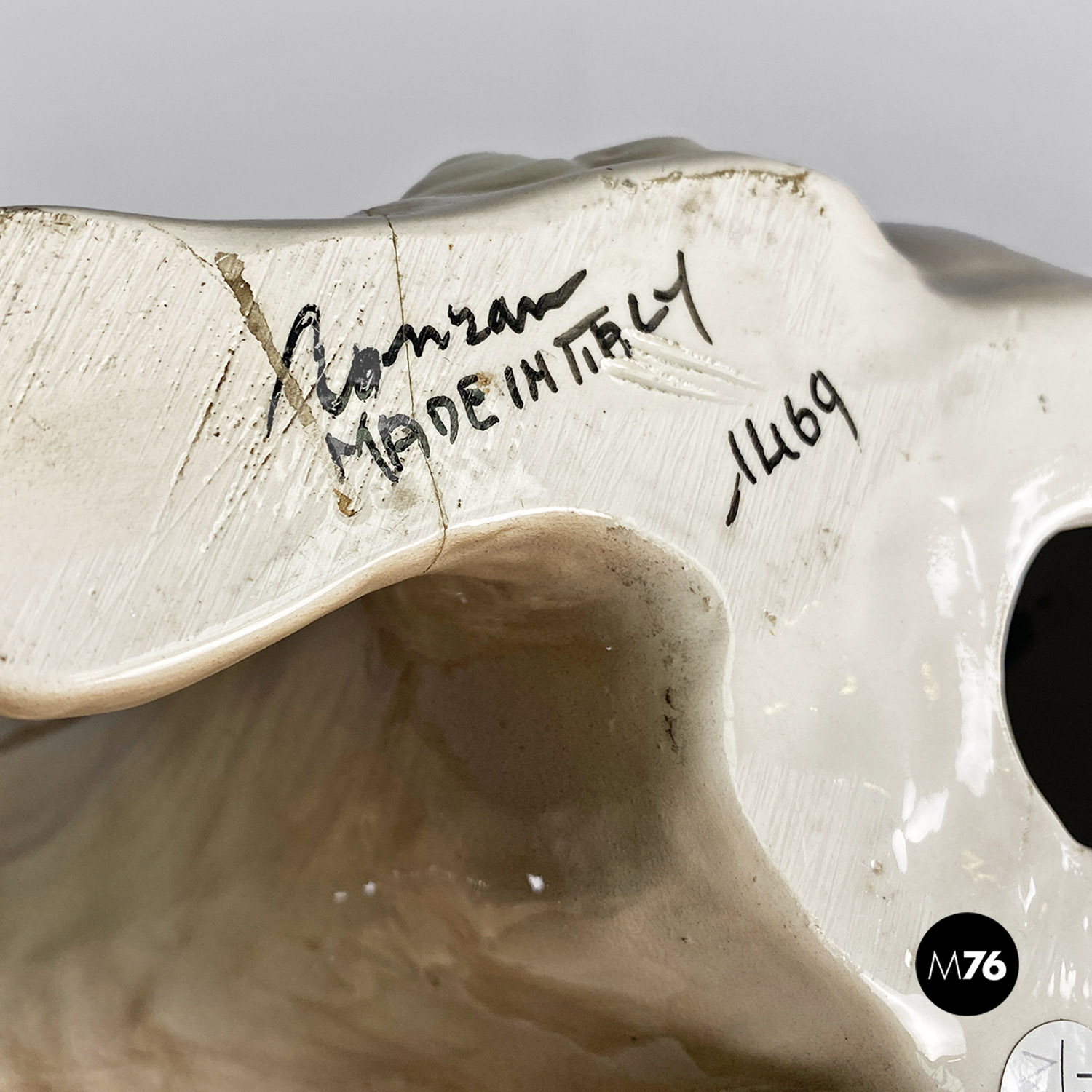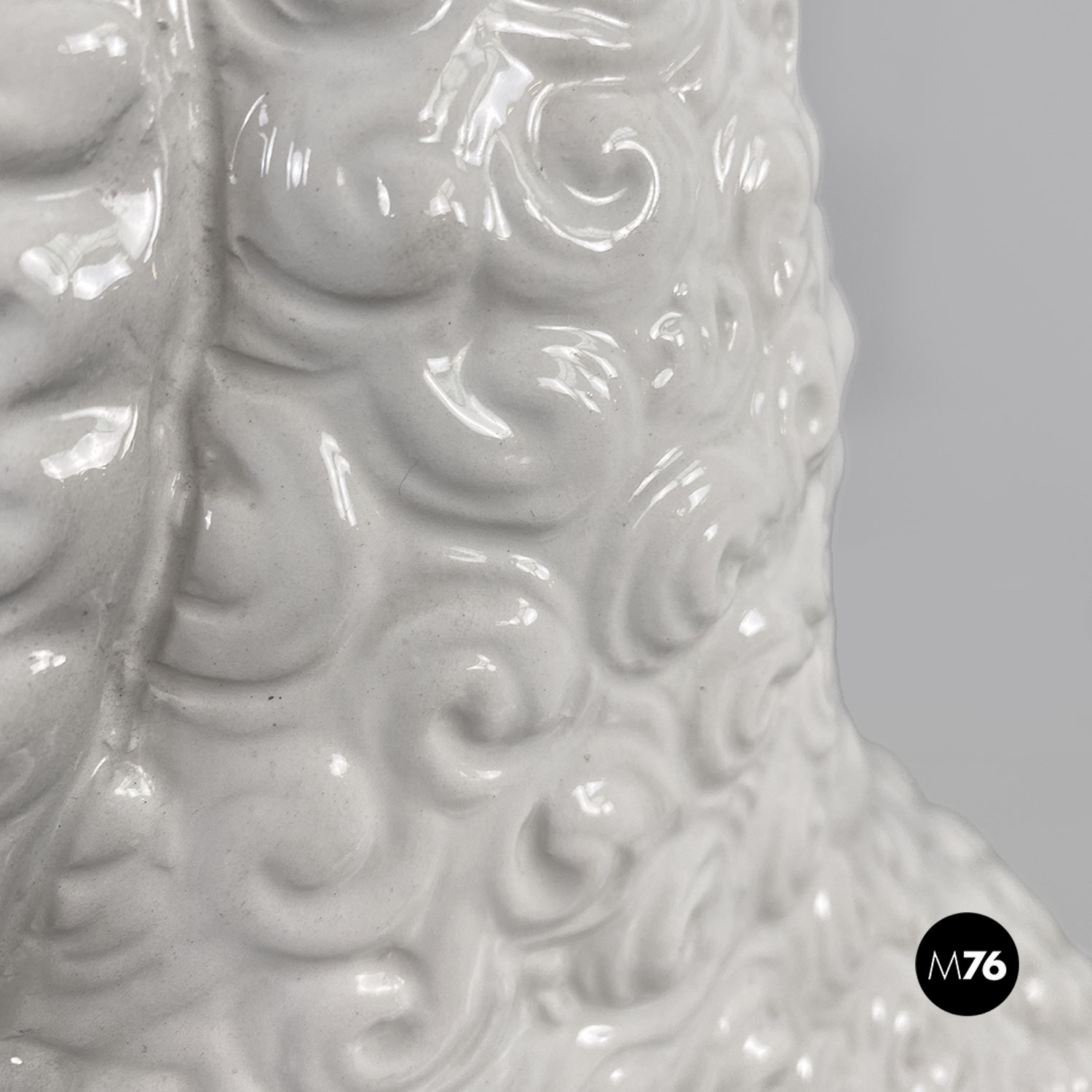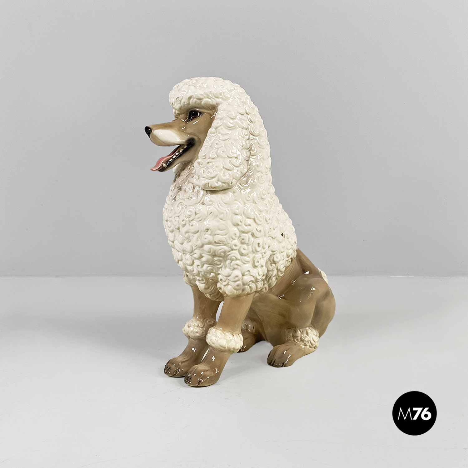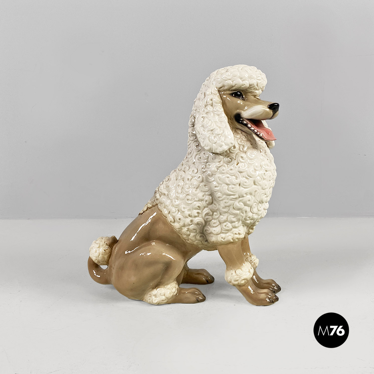 Scultura a forma di cane di razza barboncino in ceramica smaltata sui toni del bianco e grigio.