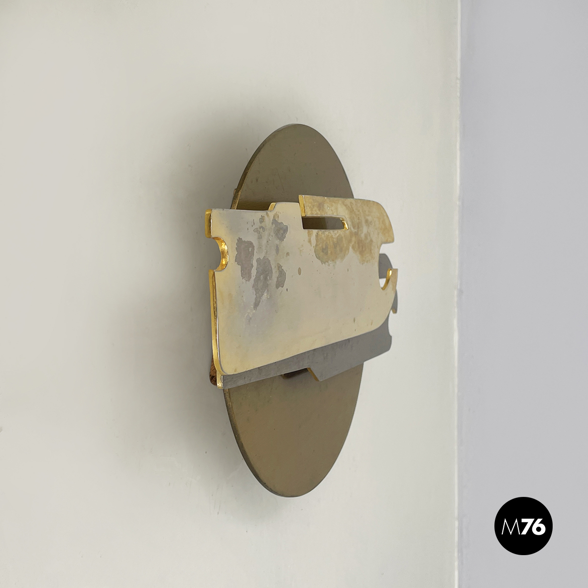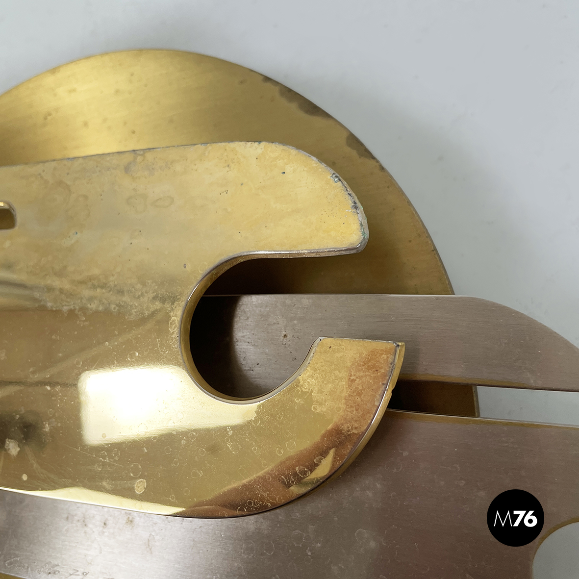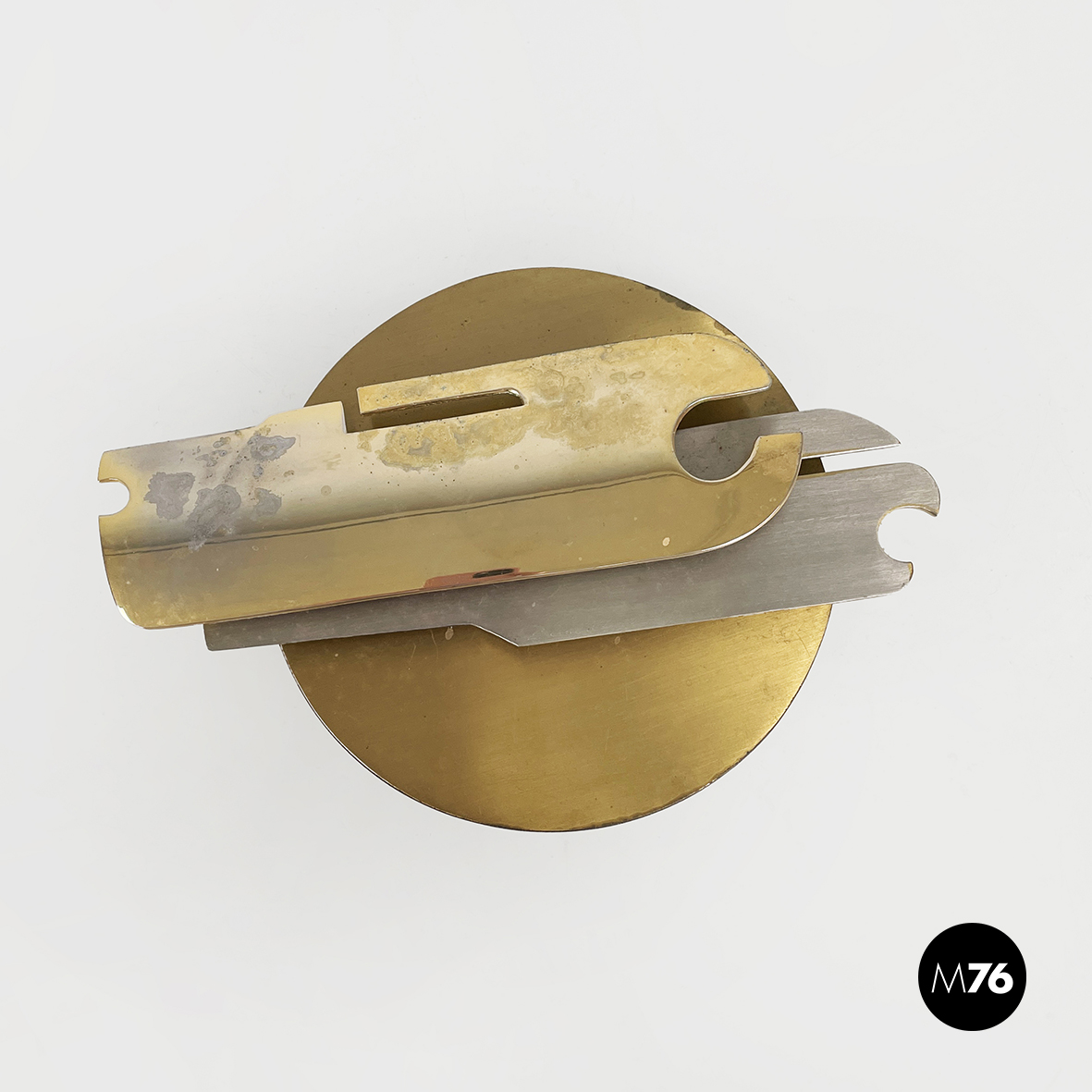 Scultura da parete in ottone e metallo con richiamo allo stile brutalista. La struttura è composta da un lamina tonda e due parti dalle forme irregolari e dinamiche, unite e sovrapposte alternando così spazi vuoti e pieni. La base per l’attacco al muro è quadrata e in legno.