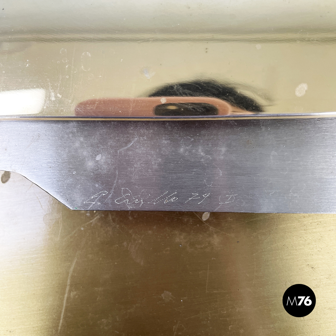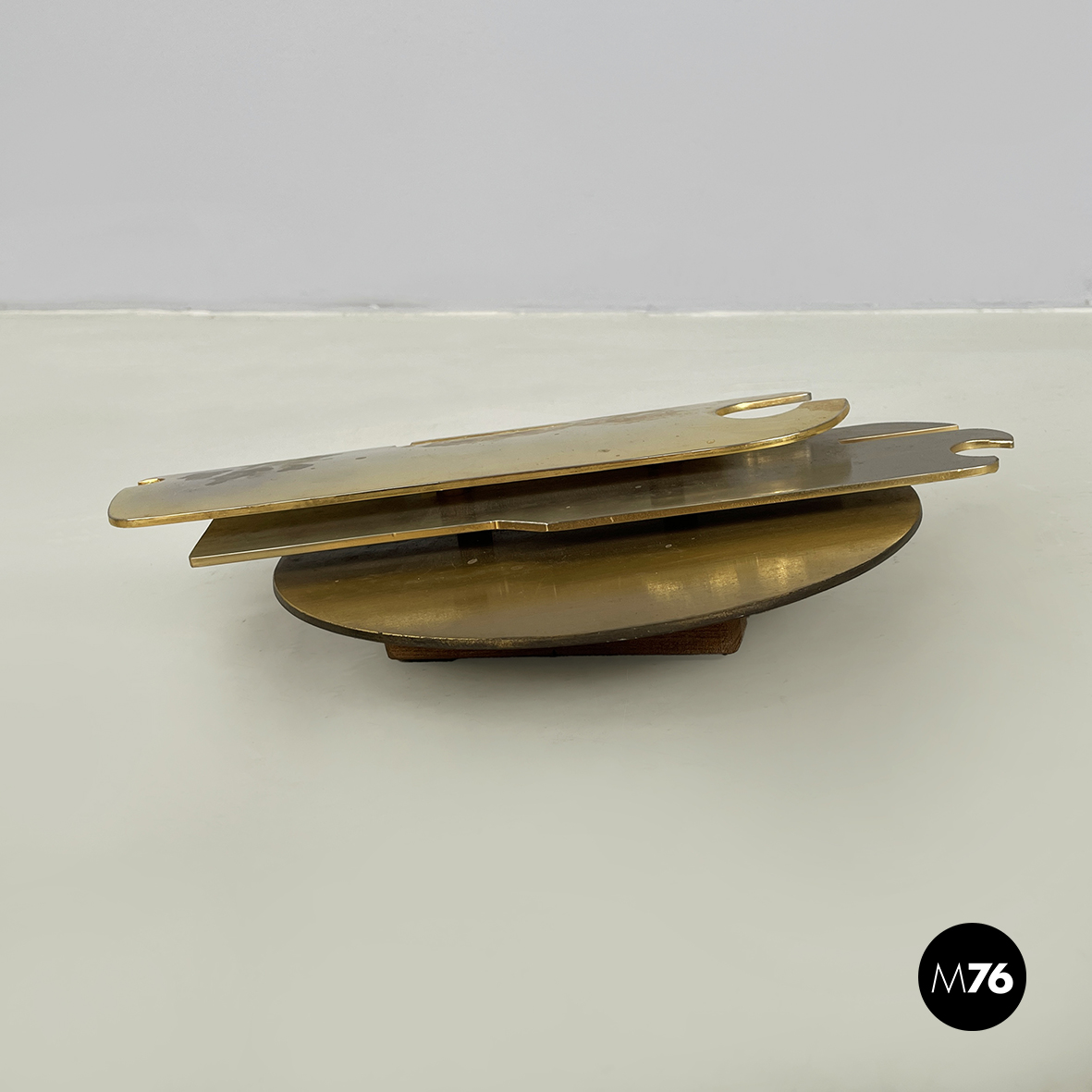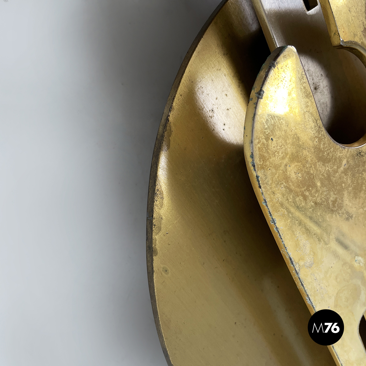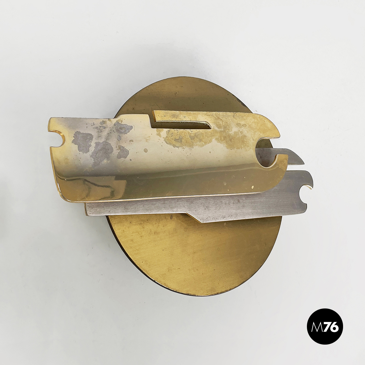 Scultura da parete in ottone e metallo con richiamo allo stile brutalista. La struttura è composta da un lamina tonda e due parti dalle forme irregolari e dinamiche, unite e sovrapposte alternando così spazi vuoti e pieni. La base per l’attacco al muro è quadrata e in legno.