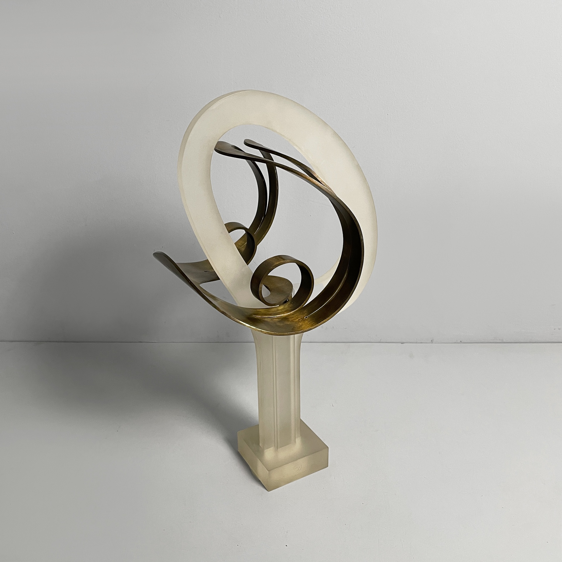 Scultura geometrica organica in plexiglass e ottone. La parte superiore alterna forme tonde e ondulate, forme concave a convesse. La struttura centrale e la base presenta sezione squadrata.