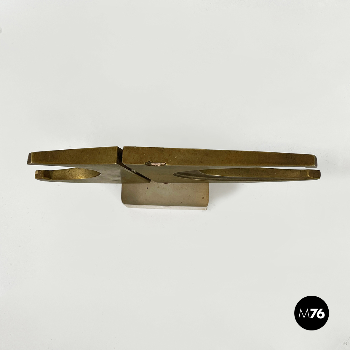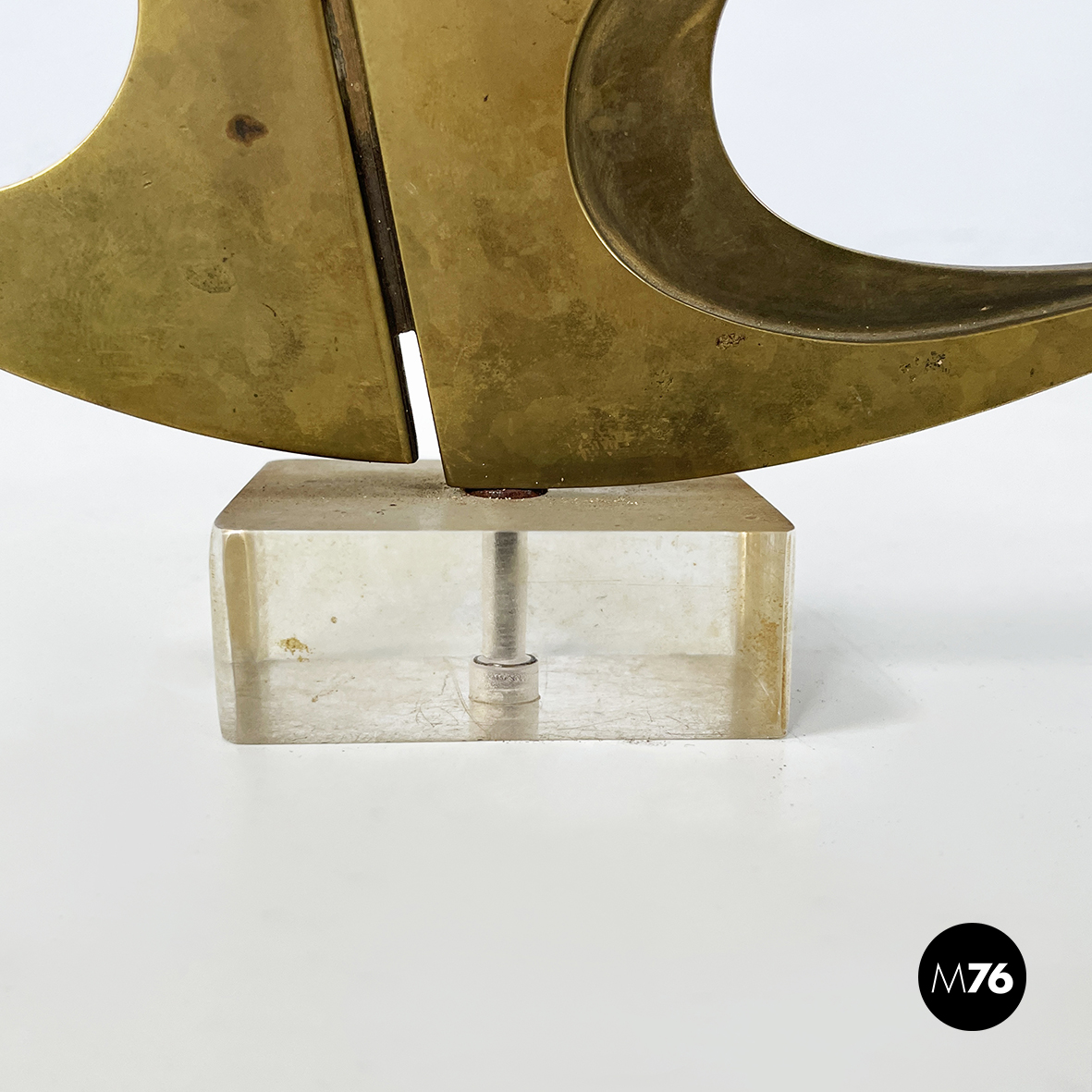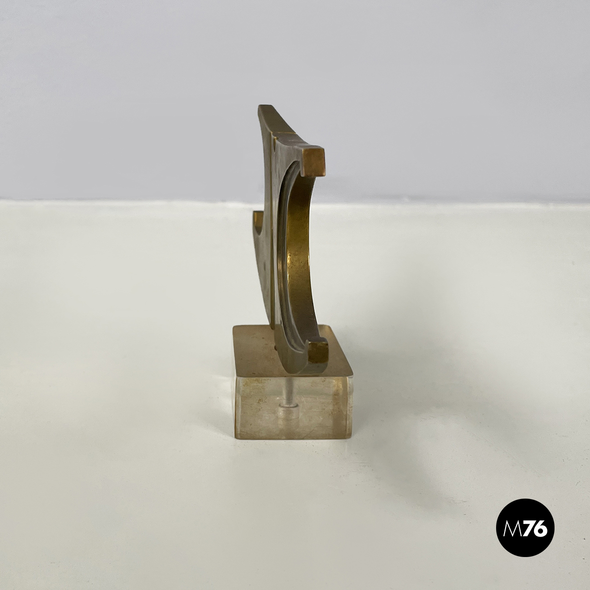 Scultura in bronzo con richiamo allo stile brutalista. La forma alterna parti tonde a parti più squadrate, parti concave e convesse. Sul fronte presenta una scanalatura decorativa. La base su cui è ancorata è un parallelepipedo di plexiglass trasparente.