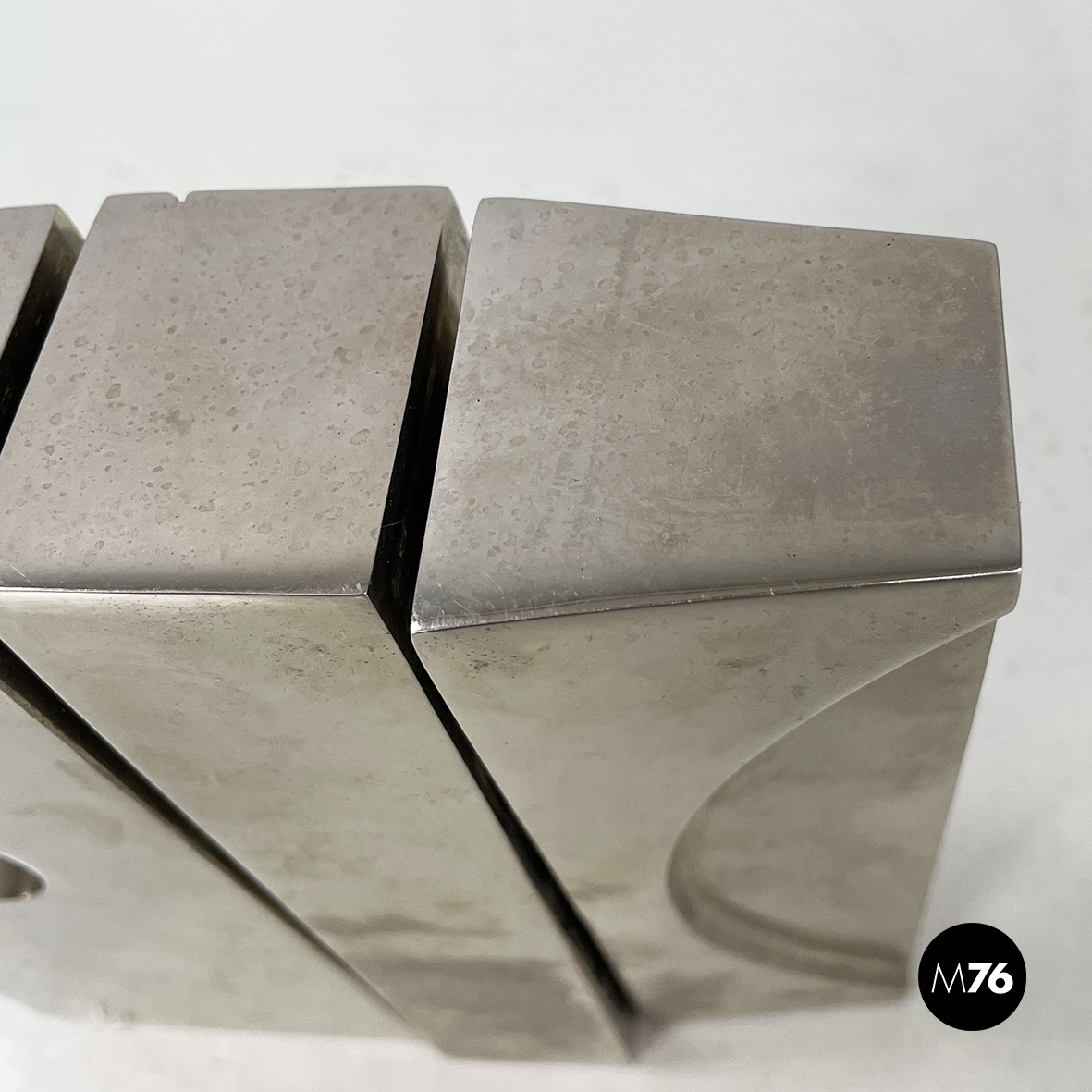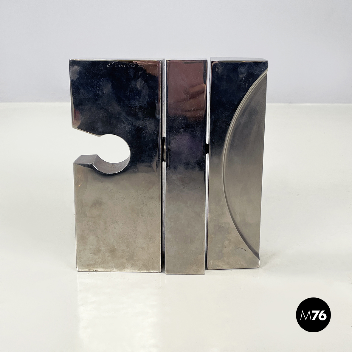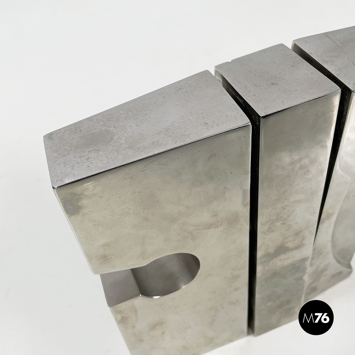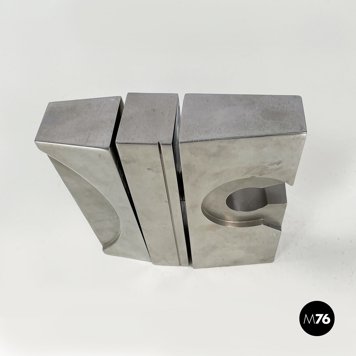Scultura in metallo a base rettangolare con richiamo allo stile brutalista. L’opera è composta da 3 moduli, mobili ma ancorati tra loro. Sul fronte sono presenti dei bassorilievi tondeggianti.
