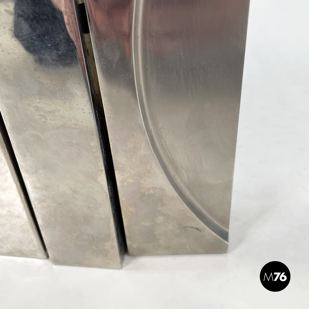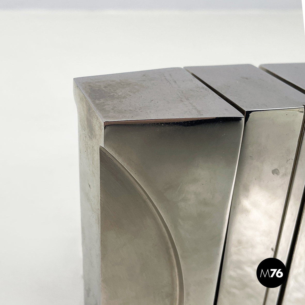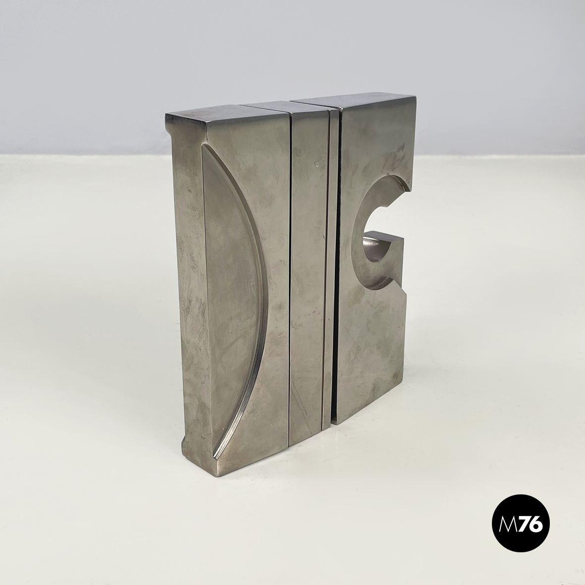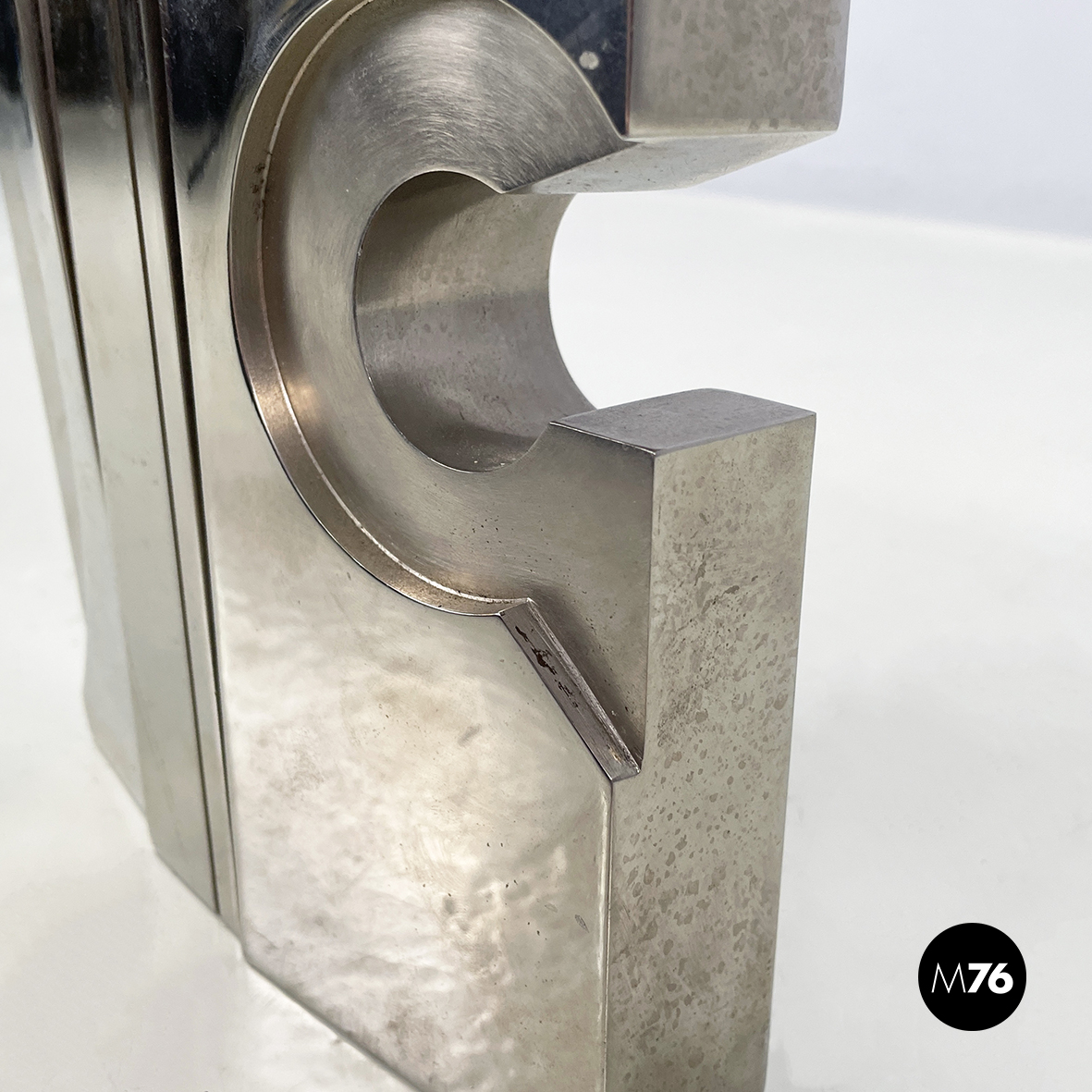 Scultura in metallo a base rettangolare con richiamo allo stile brutalista. L’opera è composta da 3 moduli, mobili ma ancorati tra loro. Sul fronte sono presenti dei bassorilievi tondeggianti.