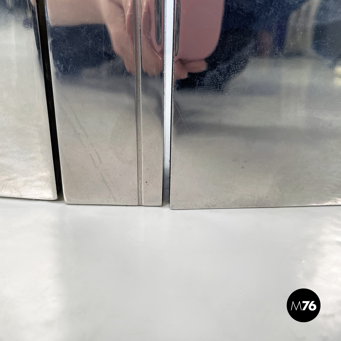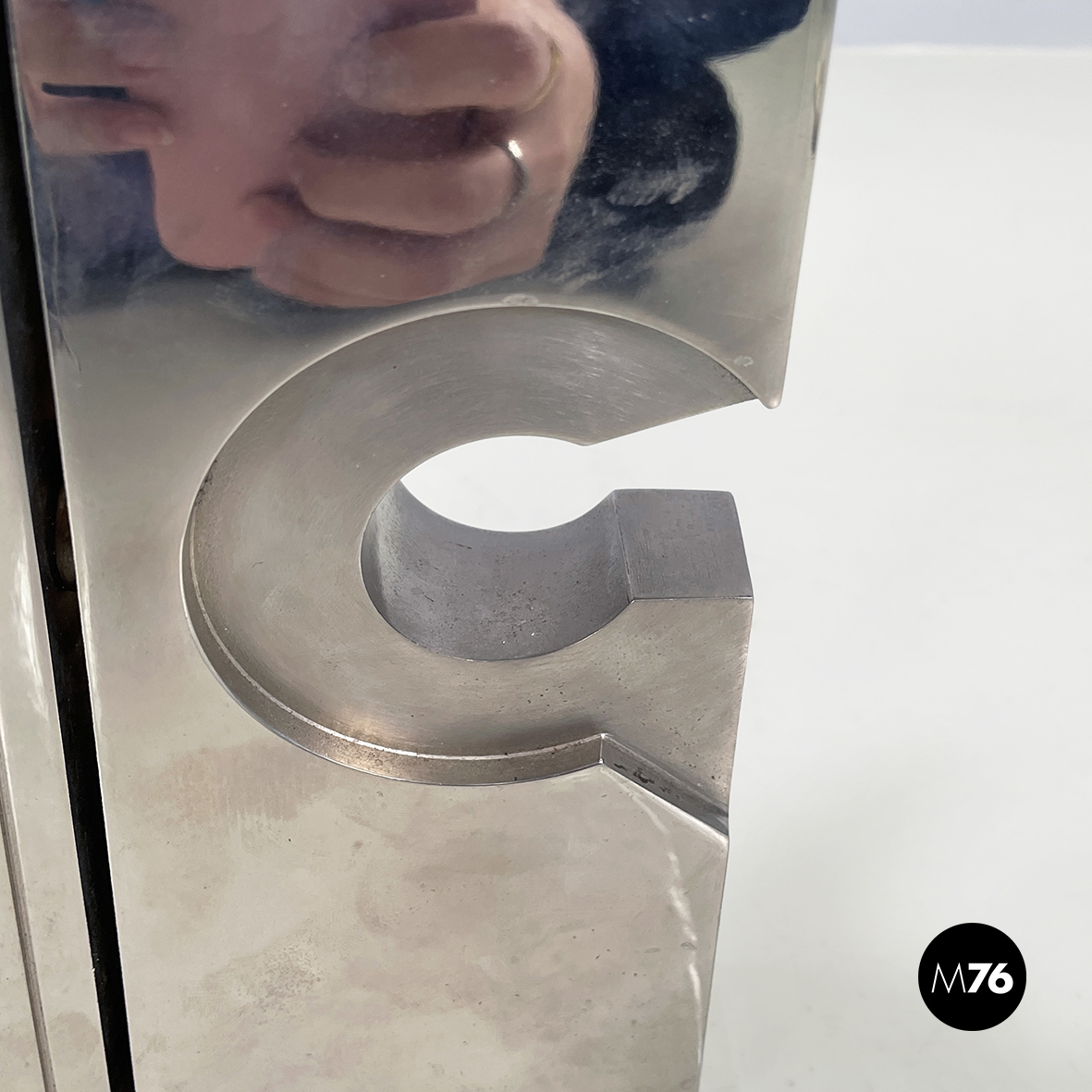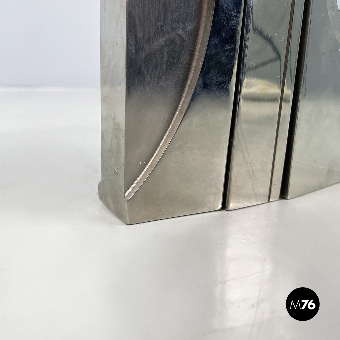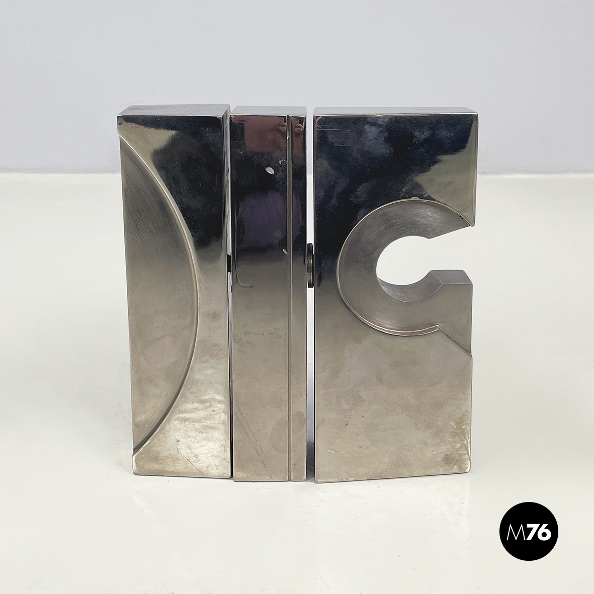 Scultura in metallo a base rettangolare con richiamo allo stile brutalista. L’opera è composta da 3 moduli, mobili ma ancorati tra loro. Sul fronte sono presenti dei bassorilievi tondeggianti.