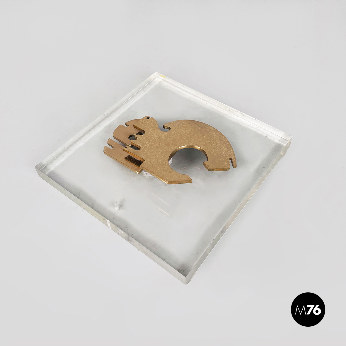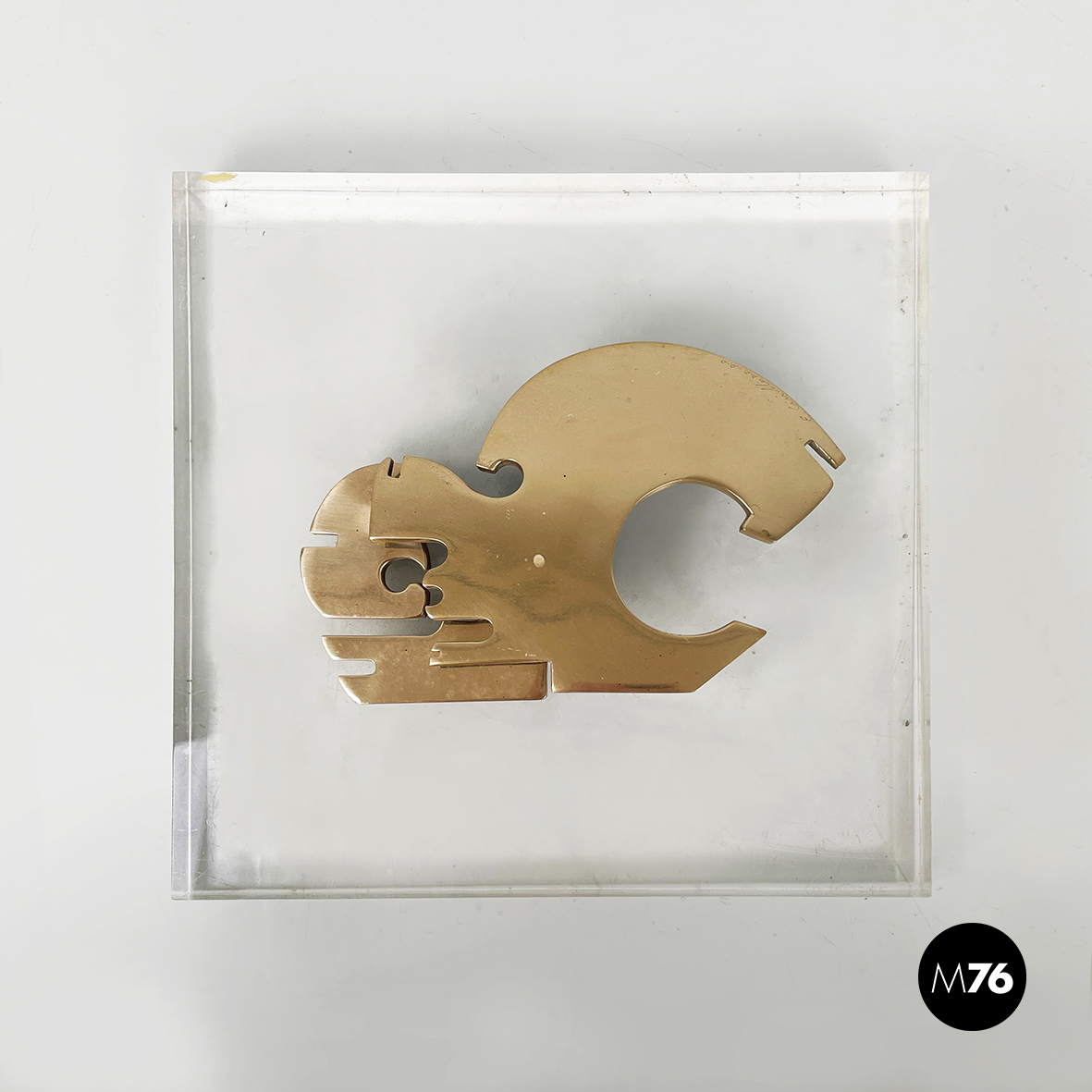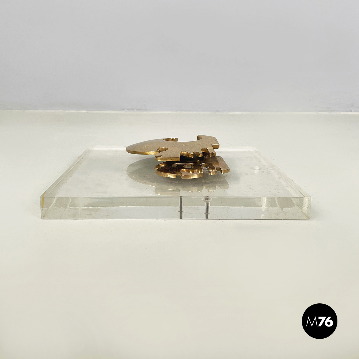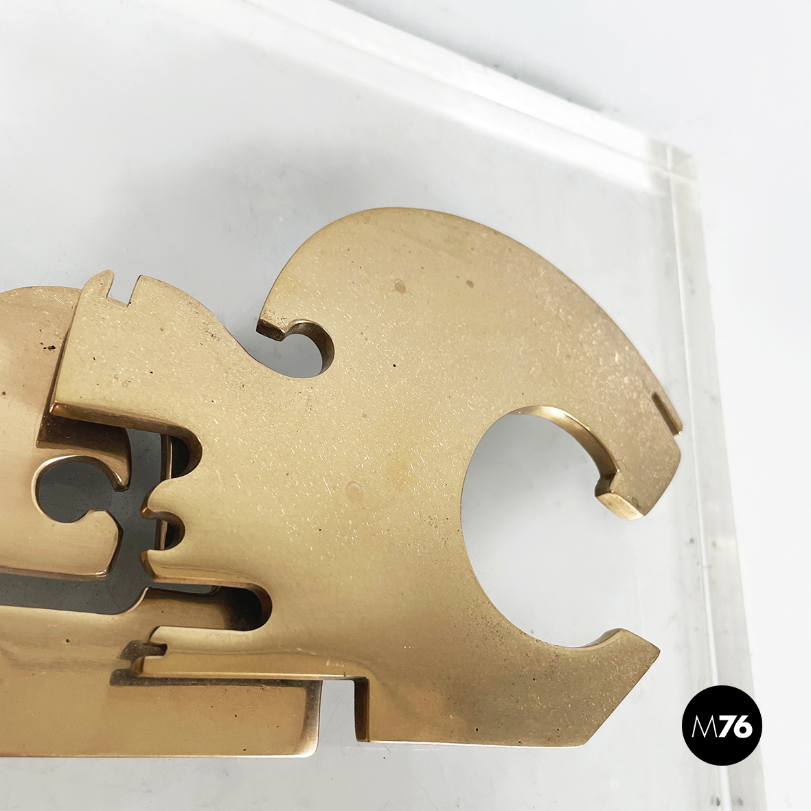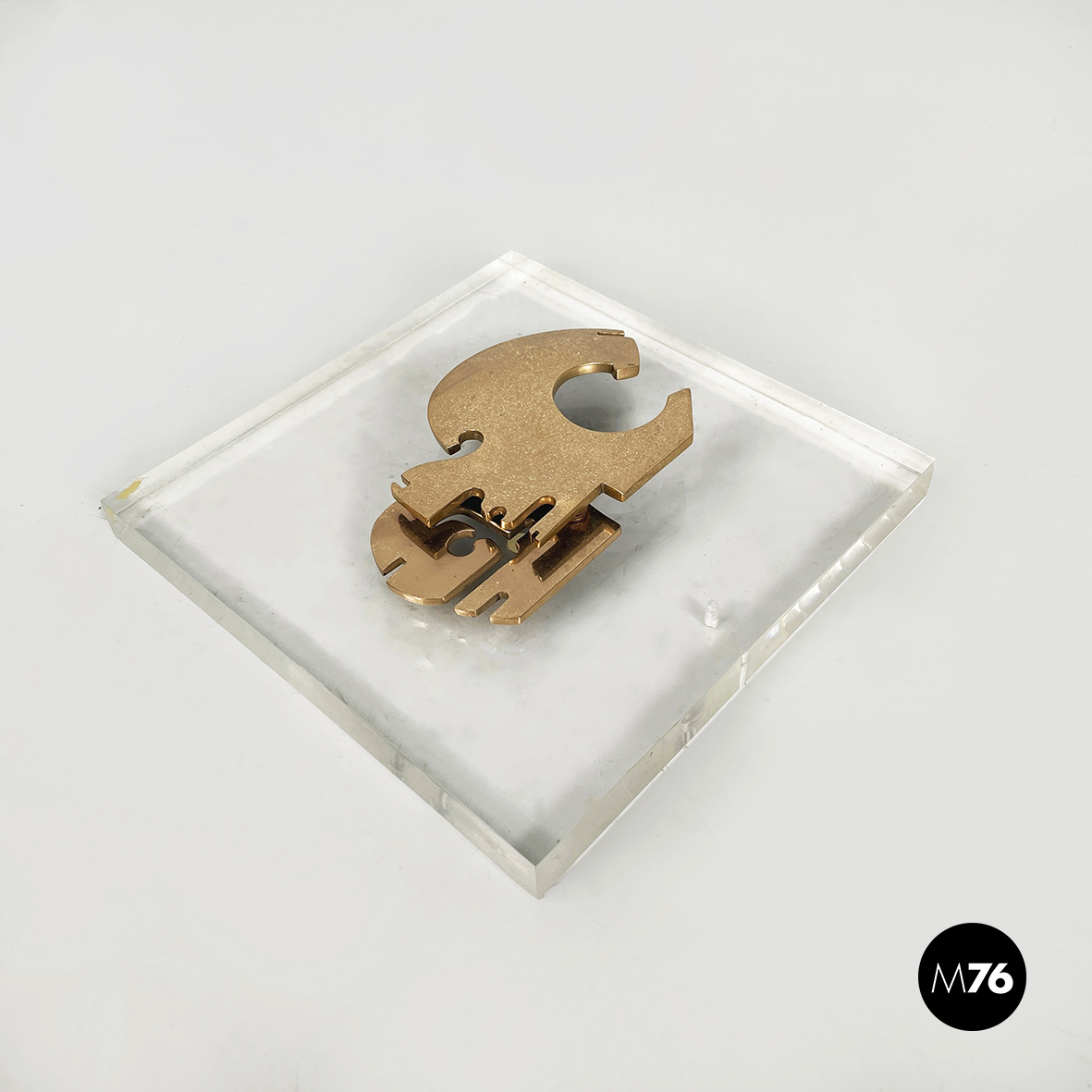 Scultura in bronzo con richiamo allo stile brutalista. La struttura è composta da diverse parti sottili dalle forme irregolari e unite tra loro, alternando così pieni e vuoti. Il piedistallo a cui è ancorata la scultura è a forma di parallelepipedo di plexiglass trasparente.