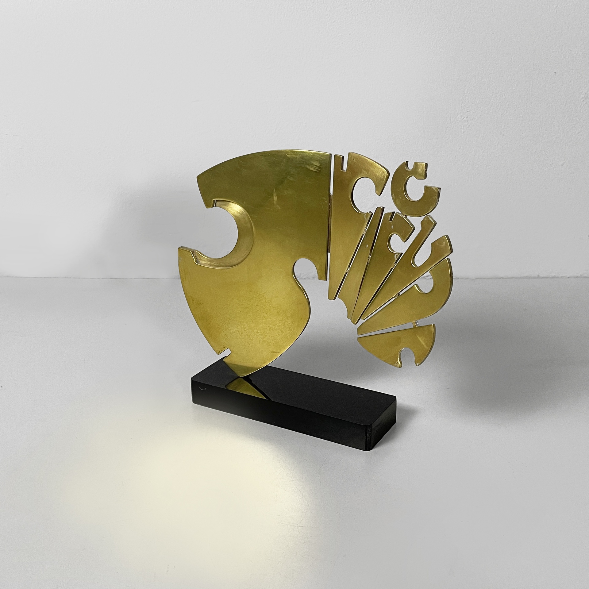 Scultura in metallo dorato con richiamo allo stile brutalista. La forma ad arco alterna parti concave e convesse. La base su cui è ancorata è un parallelepipedo di plexiglass nero.