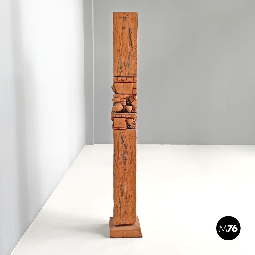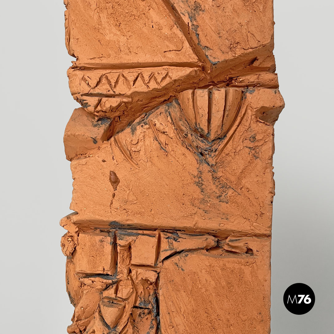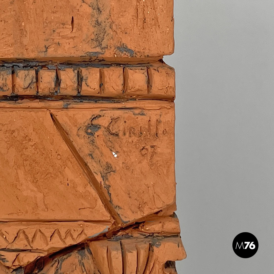 Scultura a base quadrata in terracotta, si sviluppa in altezza e ricorda un totem. La scultura è modellata con forme geometriche e decorative, che in molti punti richiamano i capitelli del classicismo greco. La materia è lavorata in maniera “grezza” ed organica, risultando ricca di profondità e giochi di luci e ombre. La struttura è data da tre componenti uniti internamente da perni in metallo, le tre parti coincidono perfettamente all’esterno.