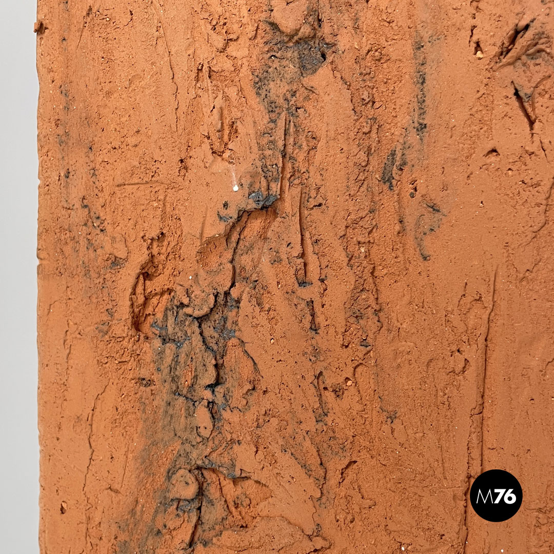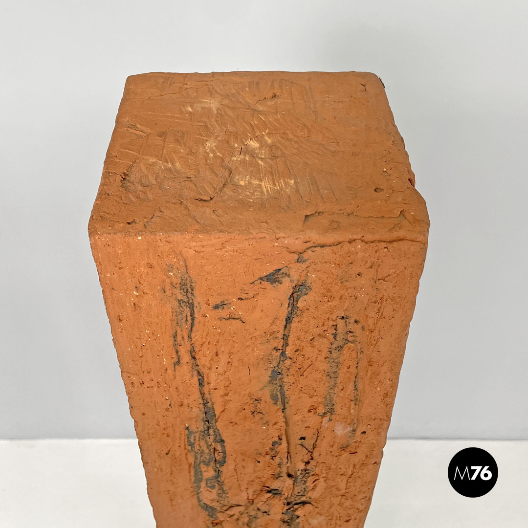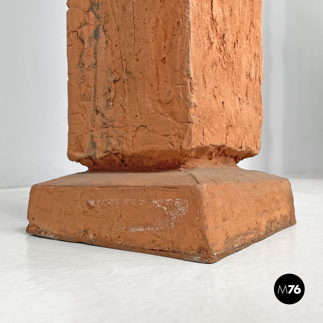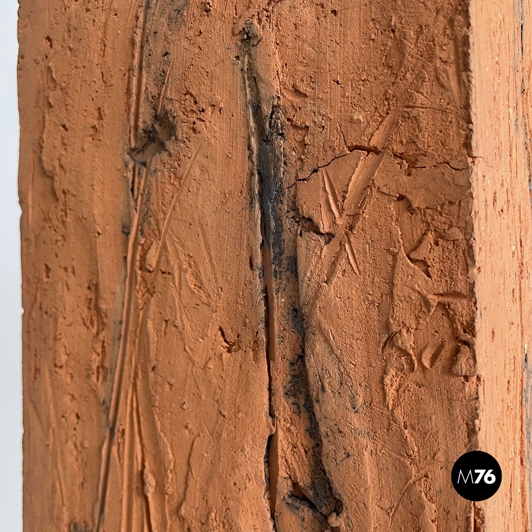Scultura a base quadrata in terracotta, si sviluppa in altezza e ricorda un totem. La scultura è modellata con forme geometriche e decorative, che in molti punti richiamano i capitelli del classicismo greco. La materia è lavorata in maniera “grezza” ed organica, risultando ricca di profondità e giochi di luci e ombre. La struttura è data da tre componenti uniti internamente da perni in metallo, le tre parti coincidono perfettamente all’esterno.