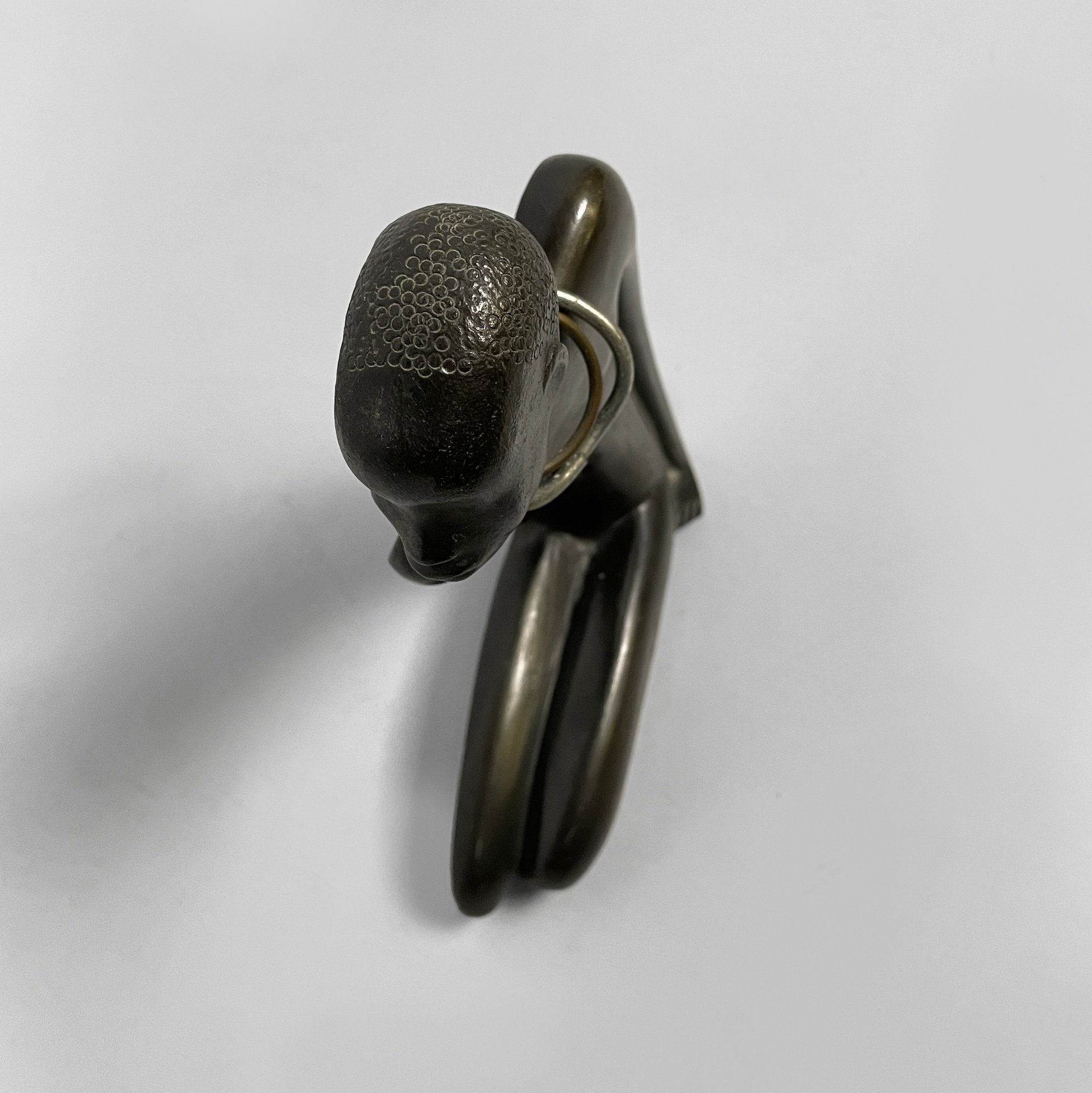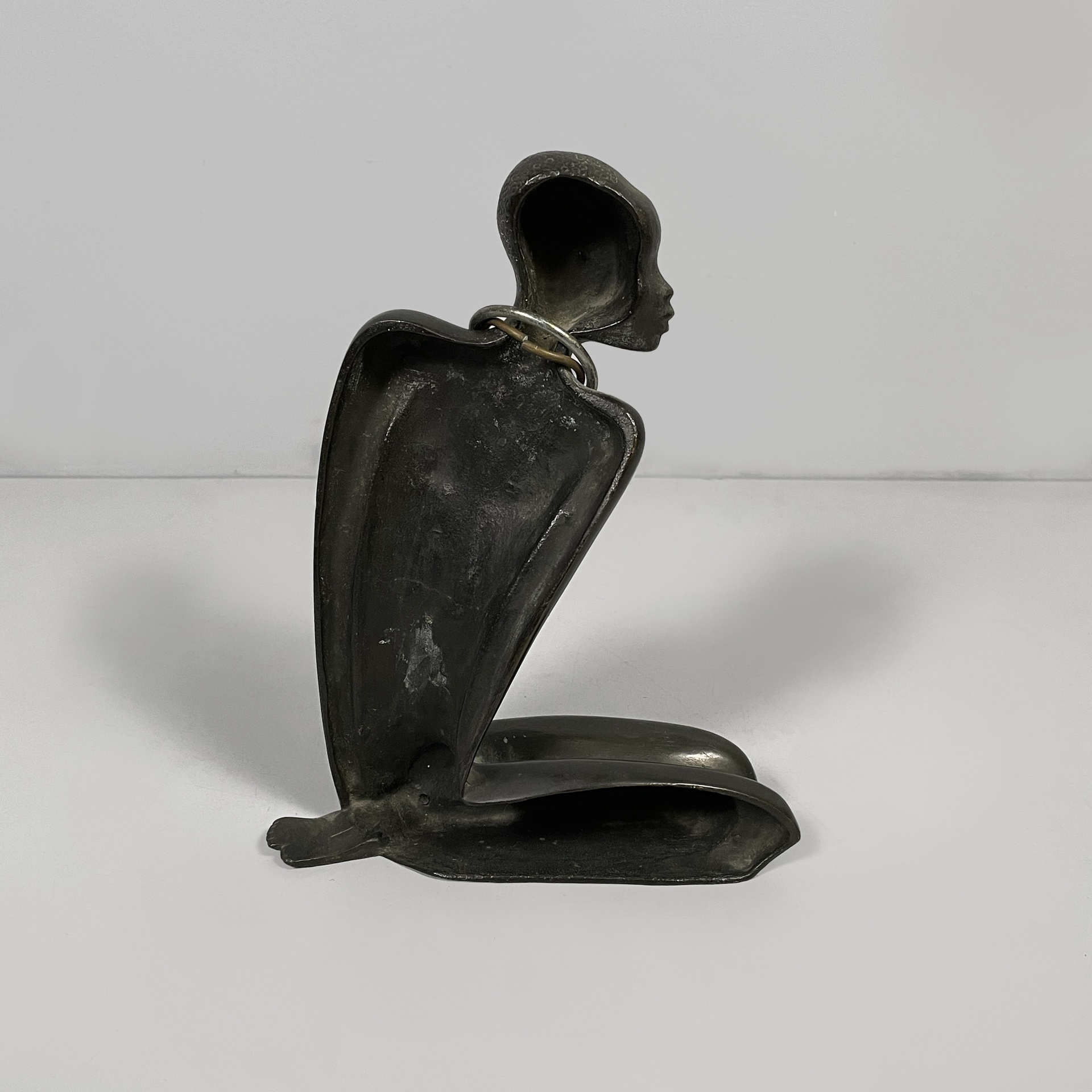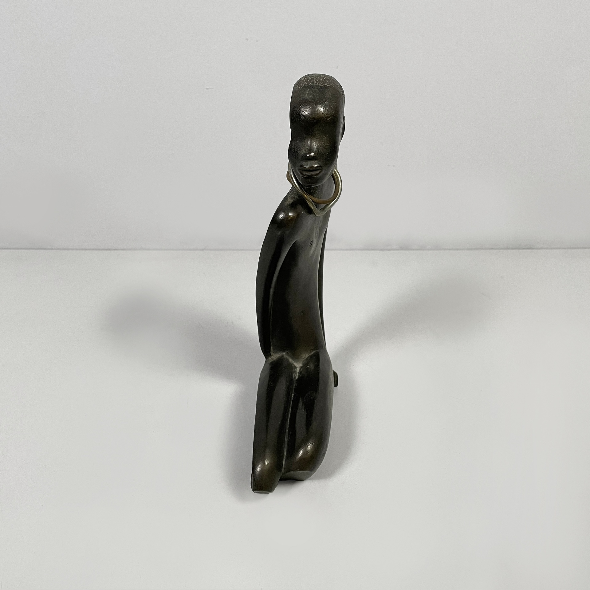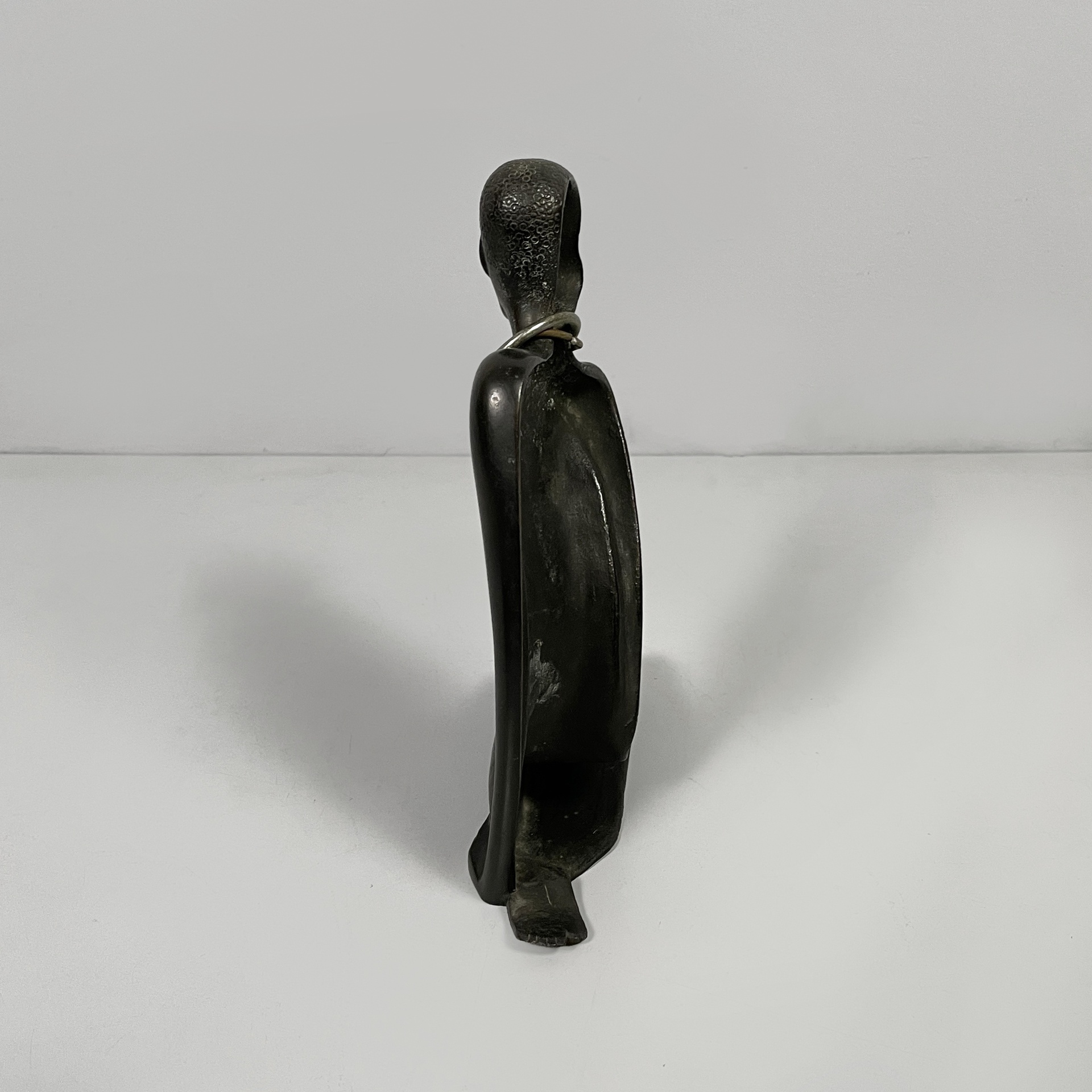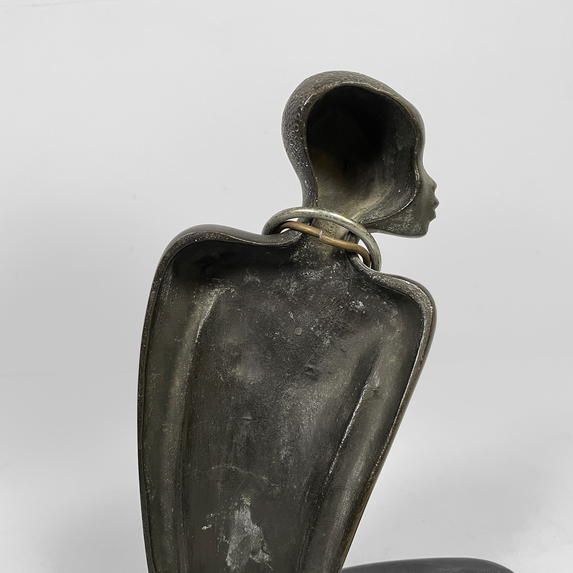 Scultura interamente in bronzo. Il soggetto è un uomo seduto con delle collane tonde al collo. Il retro è cavo