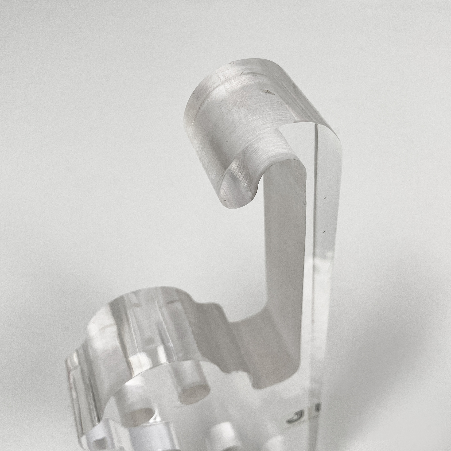 Scultura a forma di scimmia stilizzata a quattro zampe, in lucite trasparente. Gli occhi dell’animale sono due fori. La coda è dritta con una leggera curvatura verso la punta.