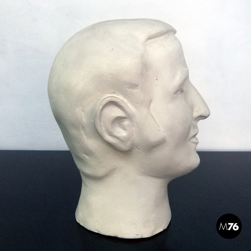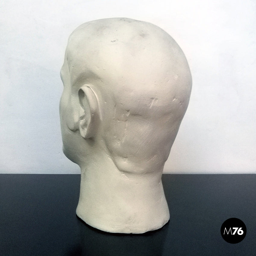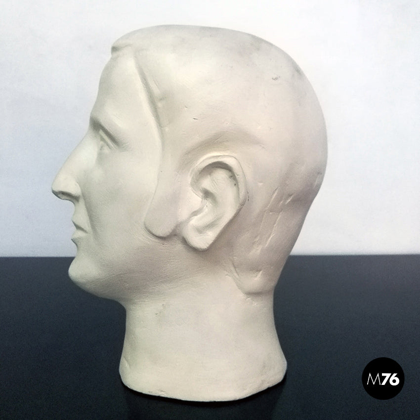 Scultura in gesso raffigurante la testa di un uomo, con dettagli del viso.