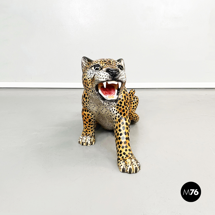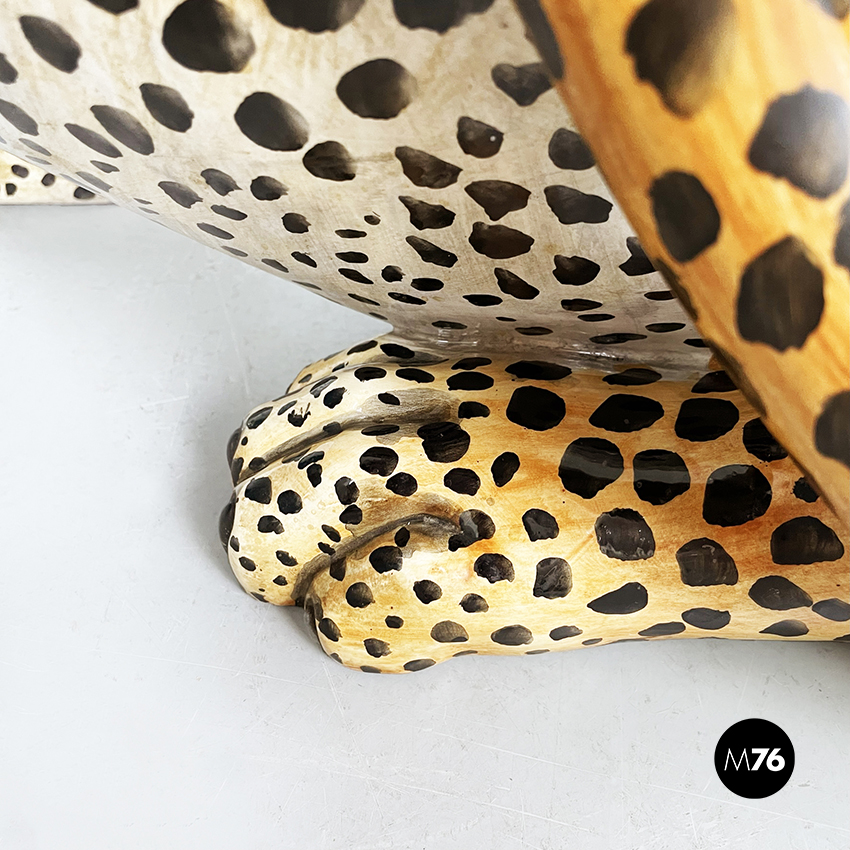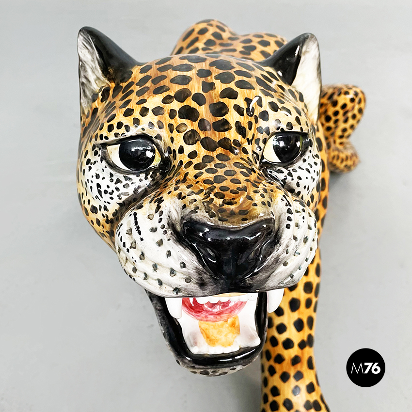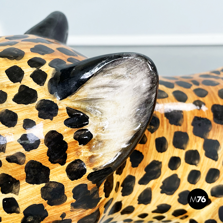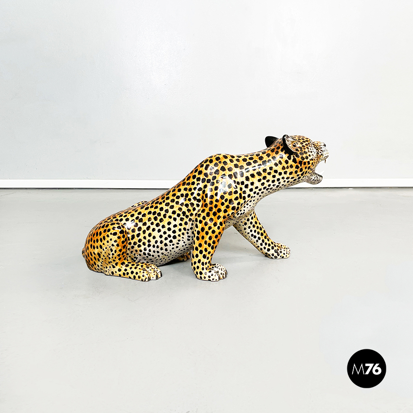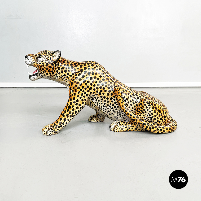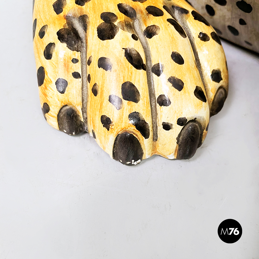 Statua di ceramica a forma di ghepardo in posizione di difesa. L’animale presenta bocca e occhi spalancati, finemente lavorato e dipinto.