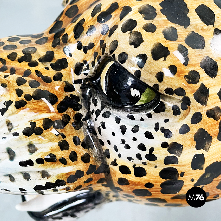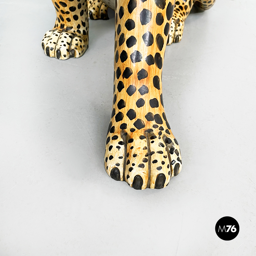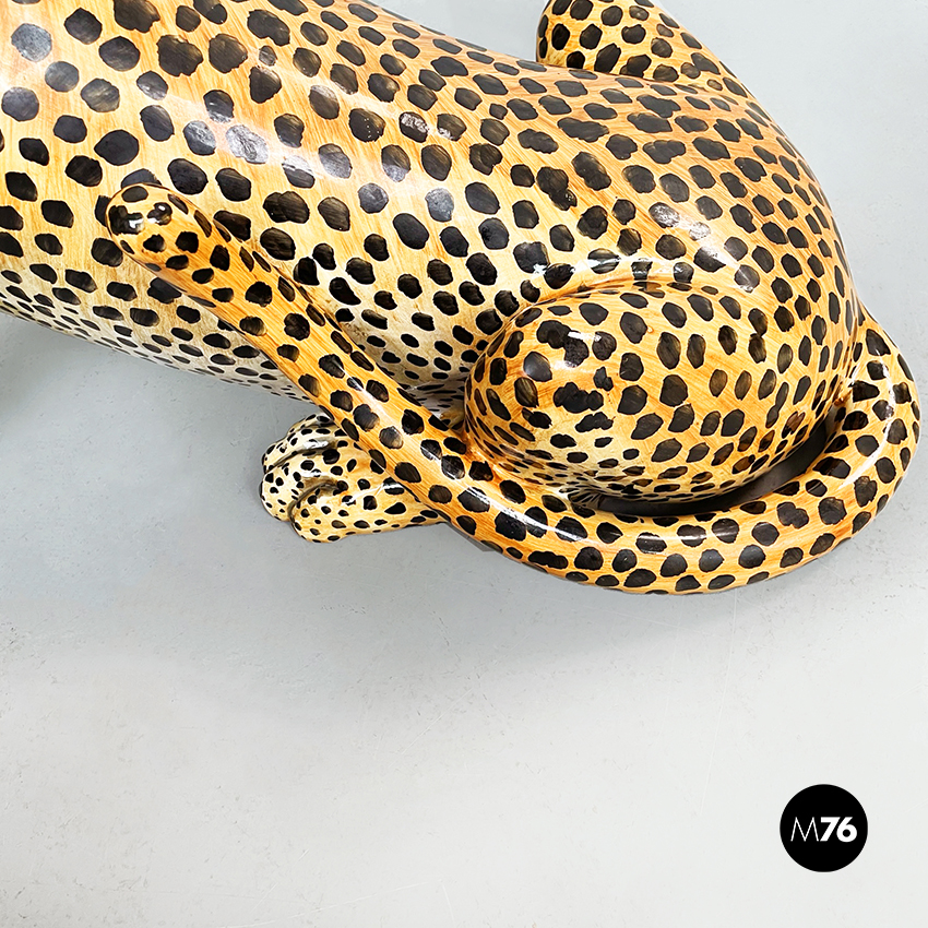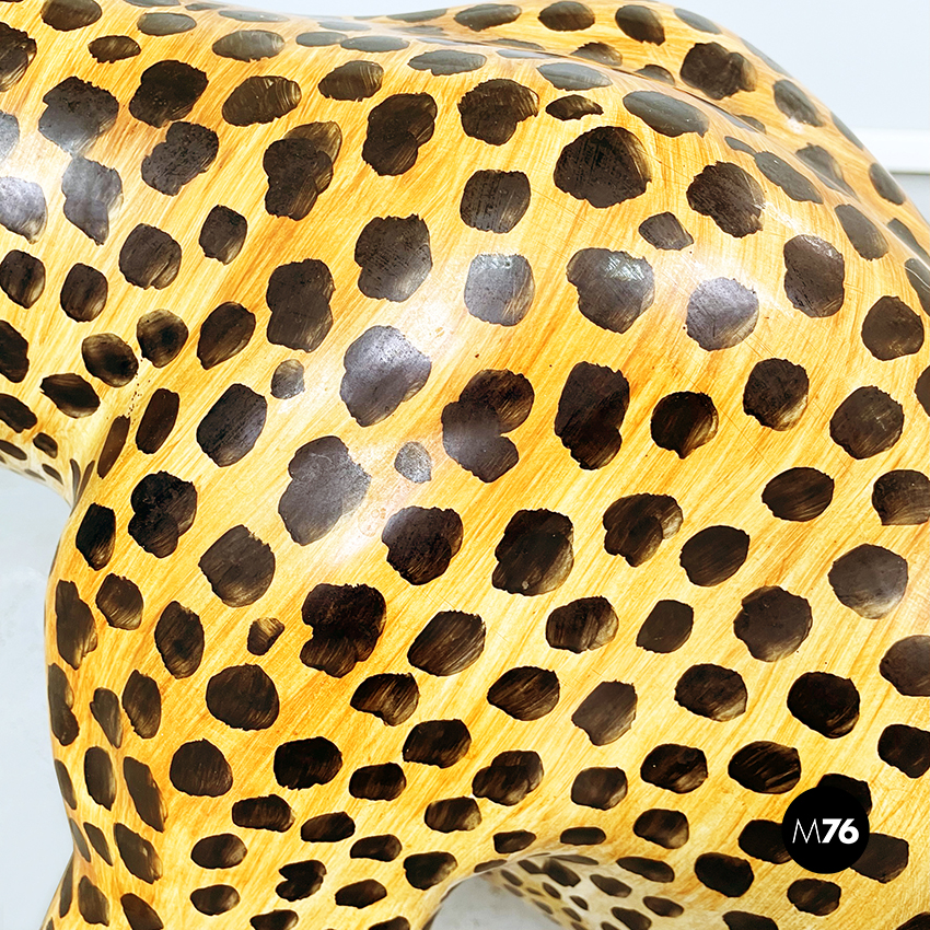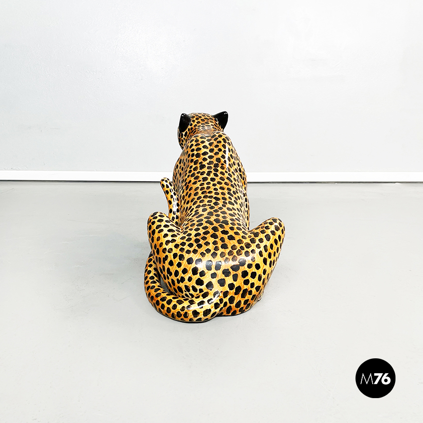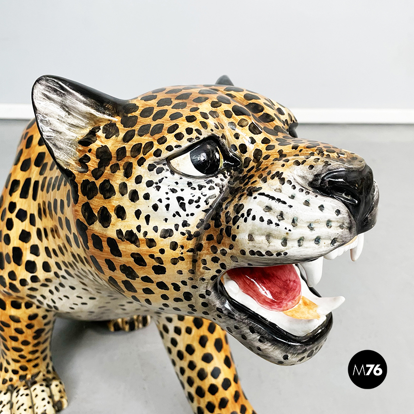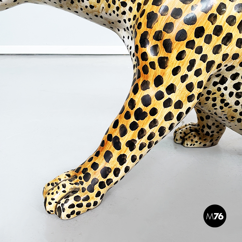 Statua di ceramica a forma di ghepardo in posizione di difesa. L’animale presenta bocca e occhi spalancati, finemente lavorato e dipinto.