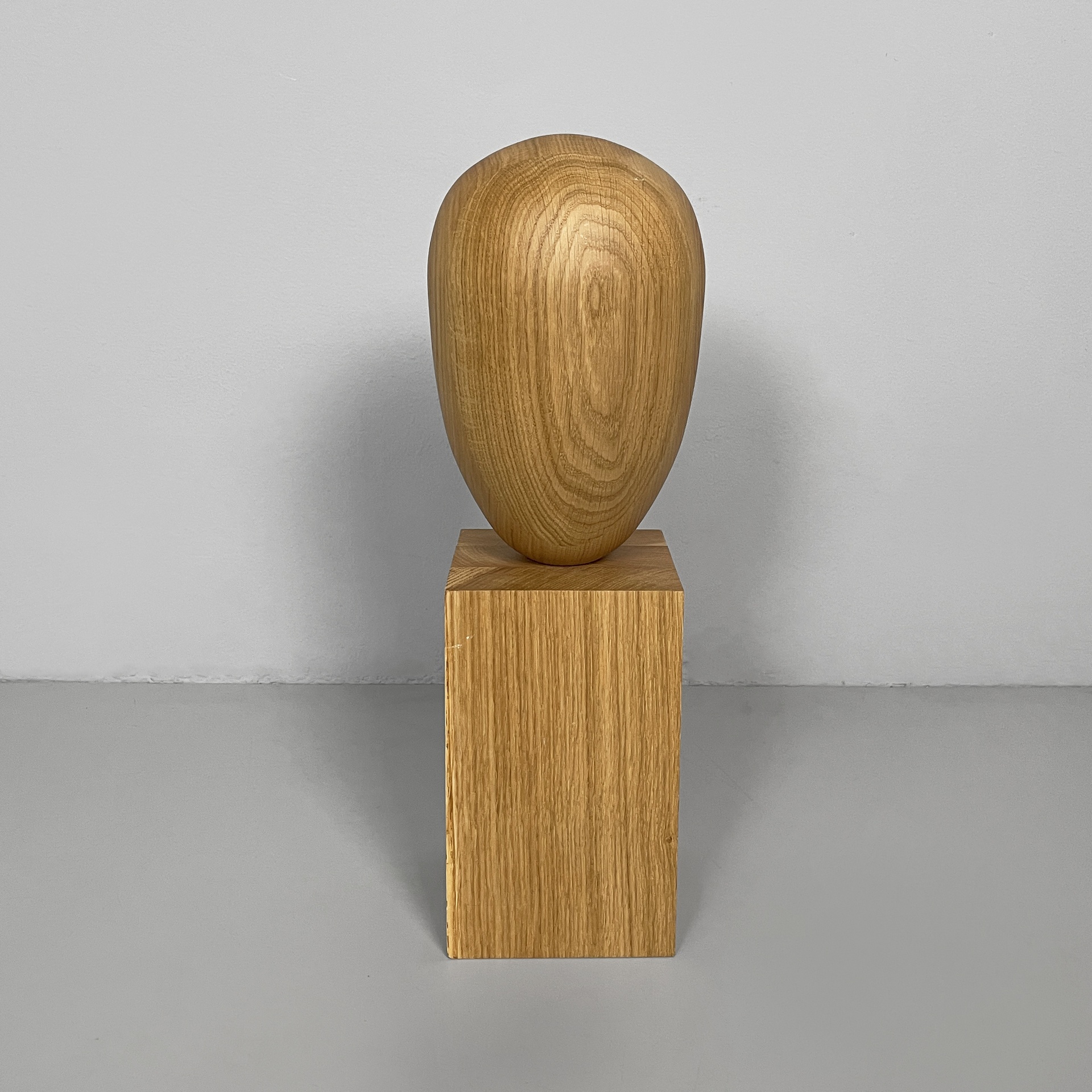 Scultura interamente in legno. La parte superiore è tondeggiante e ricorda una testa. La base è squadrata. Utilizzabile come espositore di cappelli.