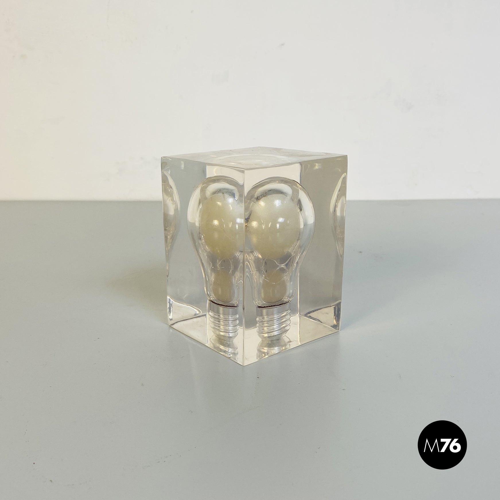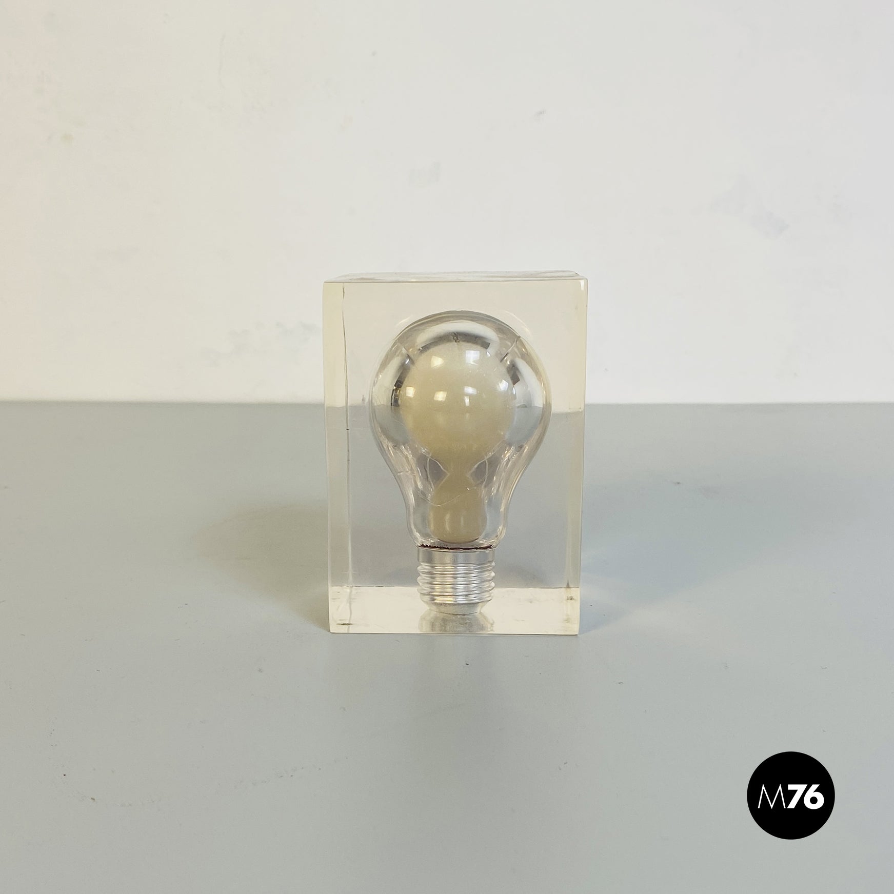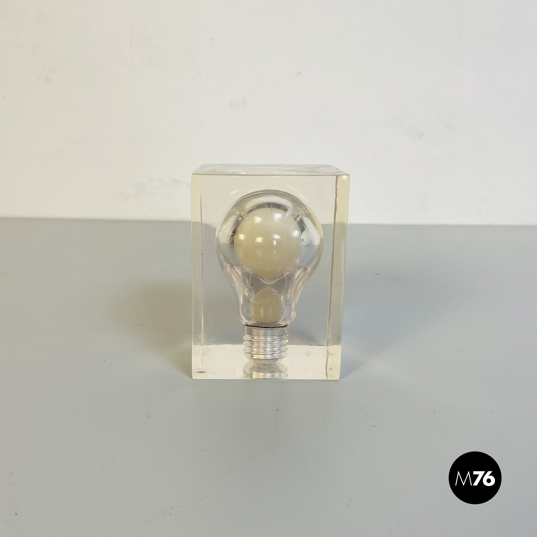 Scultura in lucite di una lampadina che si illumina di verde al buio. Il bulbo fosforescente è racchiuso in resina.
