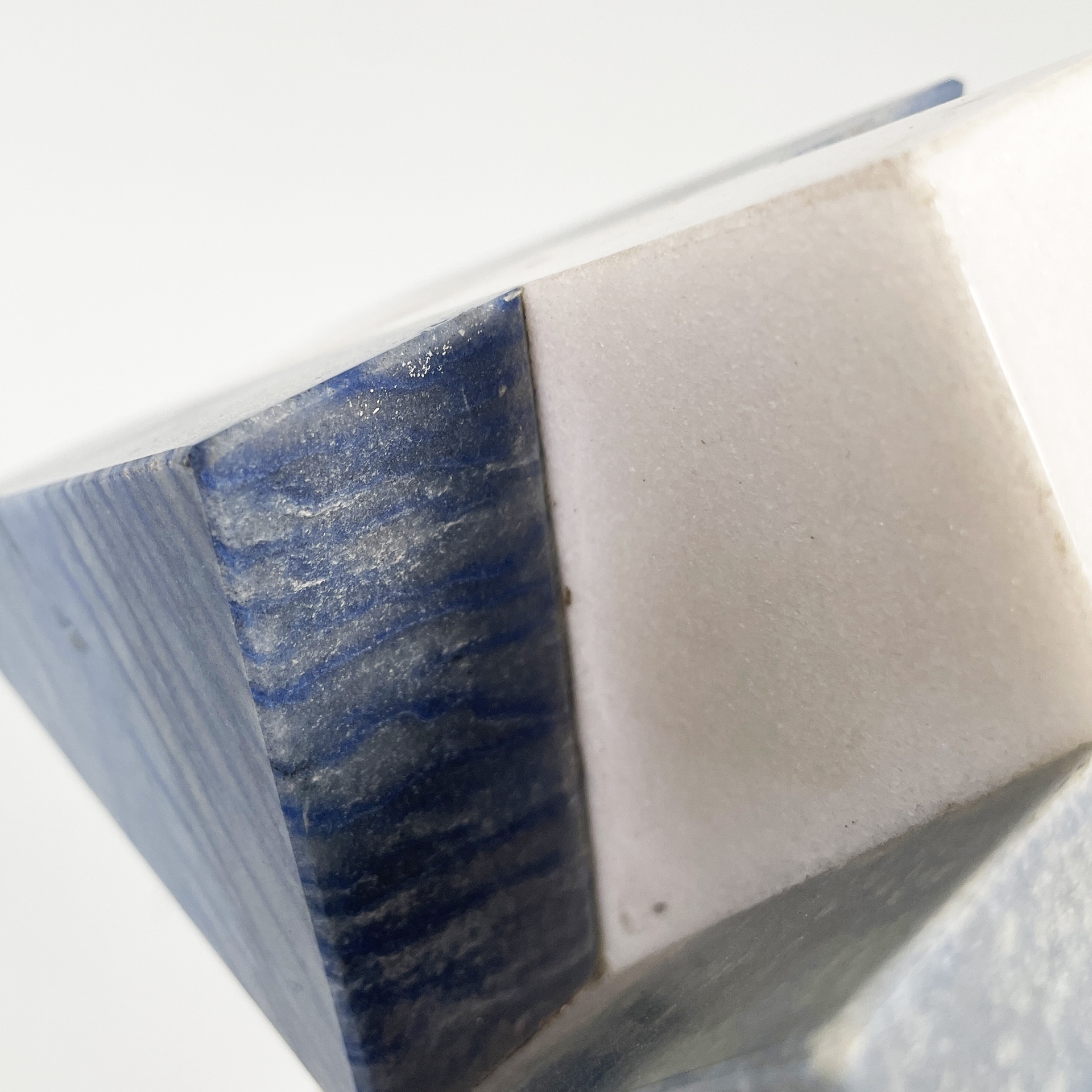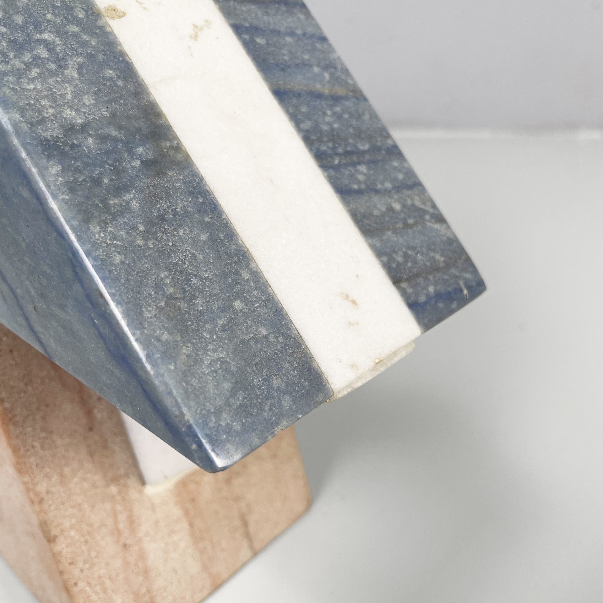 Coppia di sculture geometriche in marmo. La struttura è composta da un rombo in marmo bianco, su cui sono posti due triangoli per lato in marmo blu. La base su cui poggia la struttura è in marmo rosato. Utilizzabili come fermalibri.