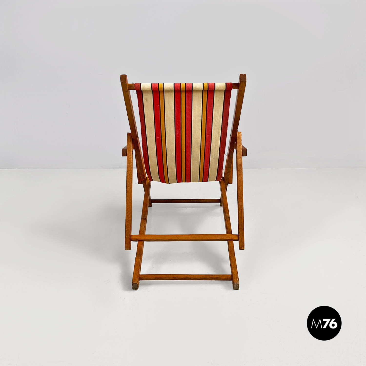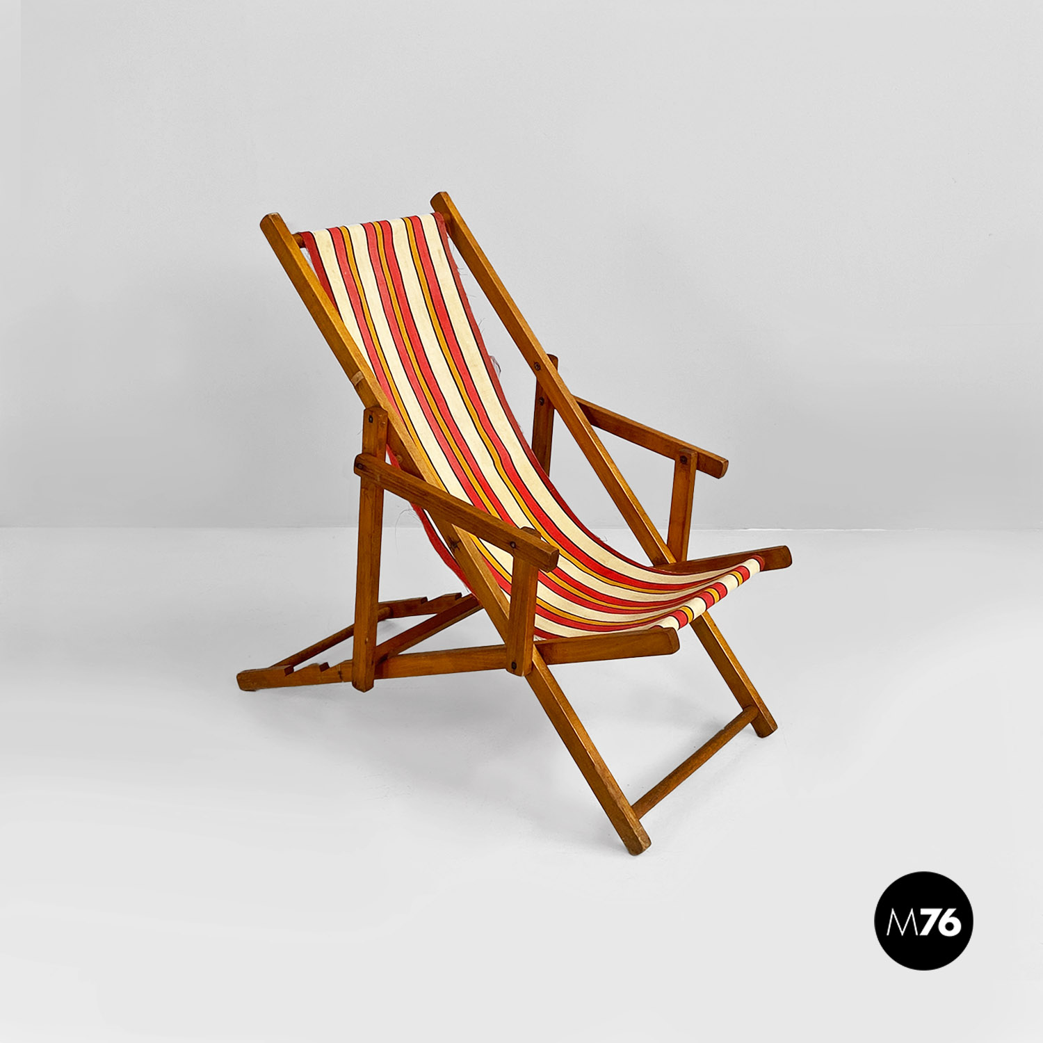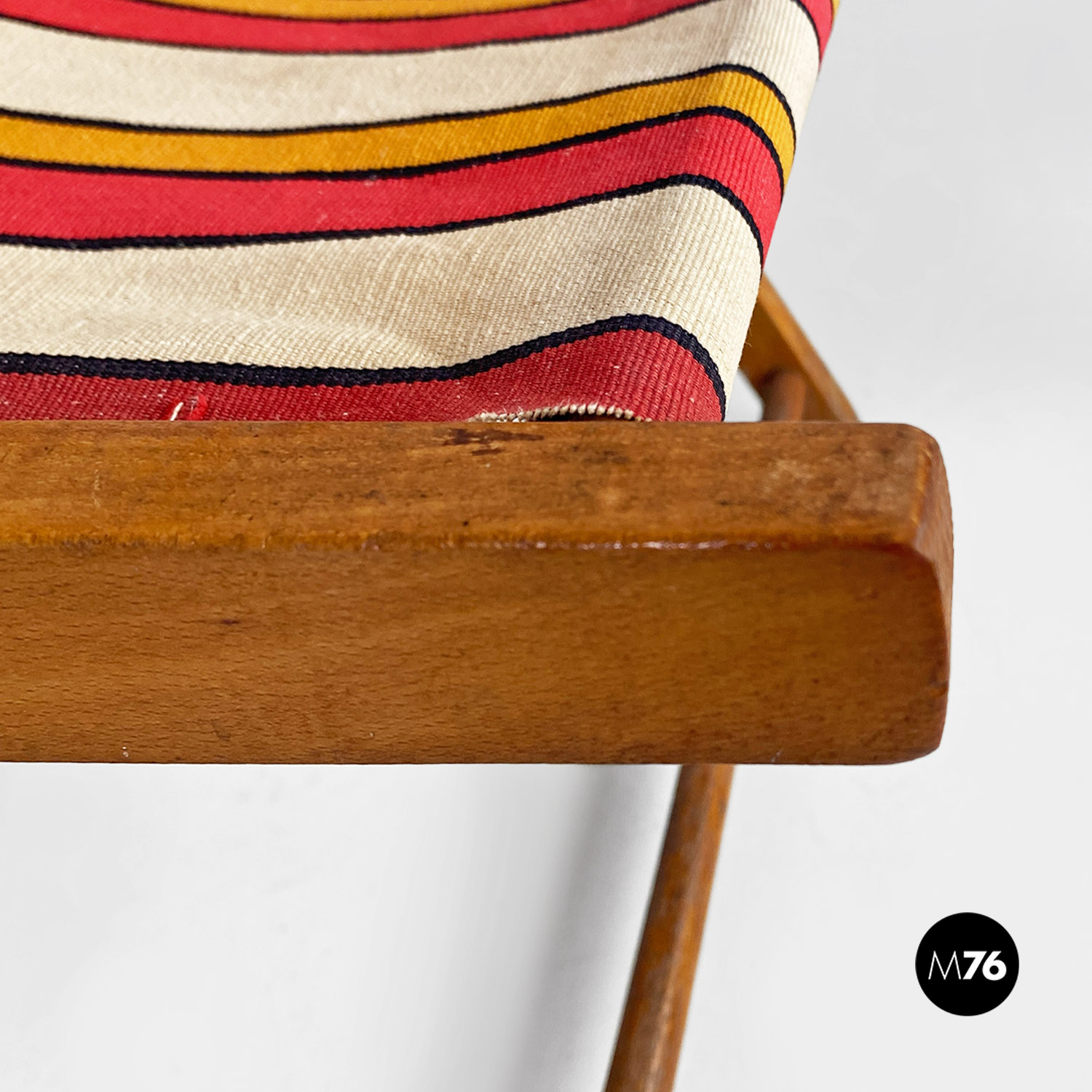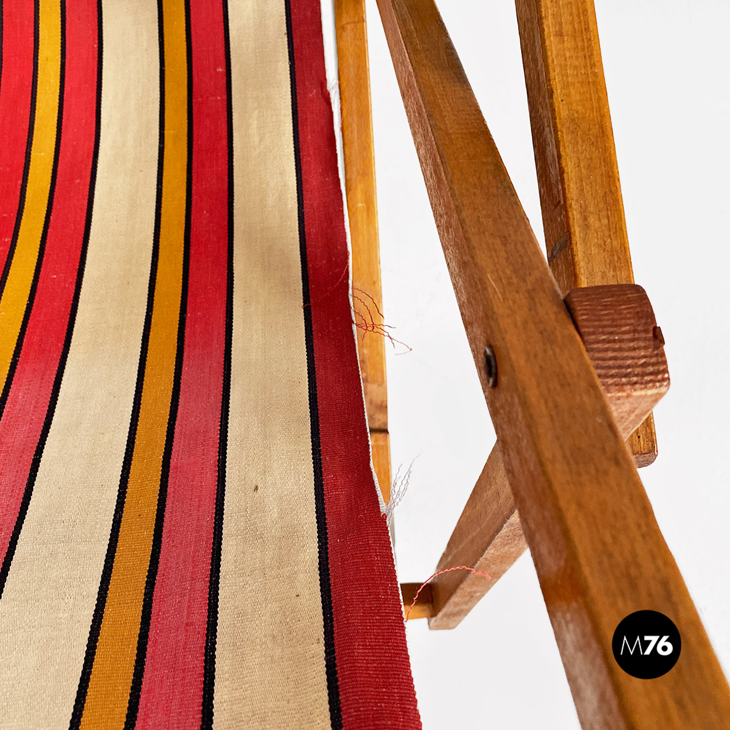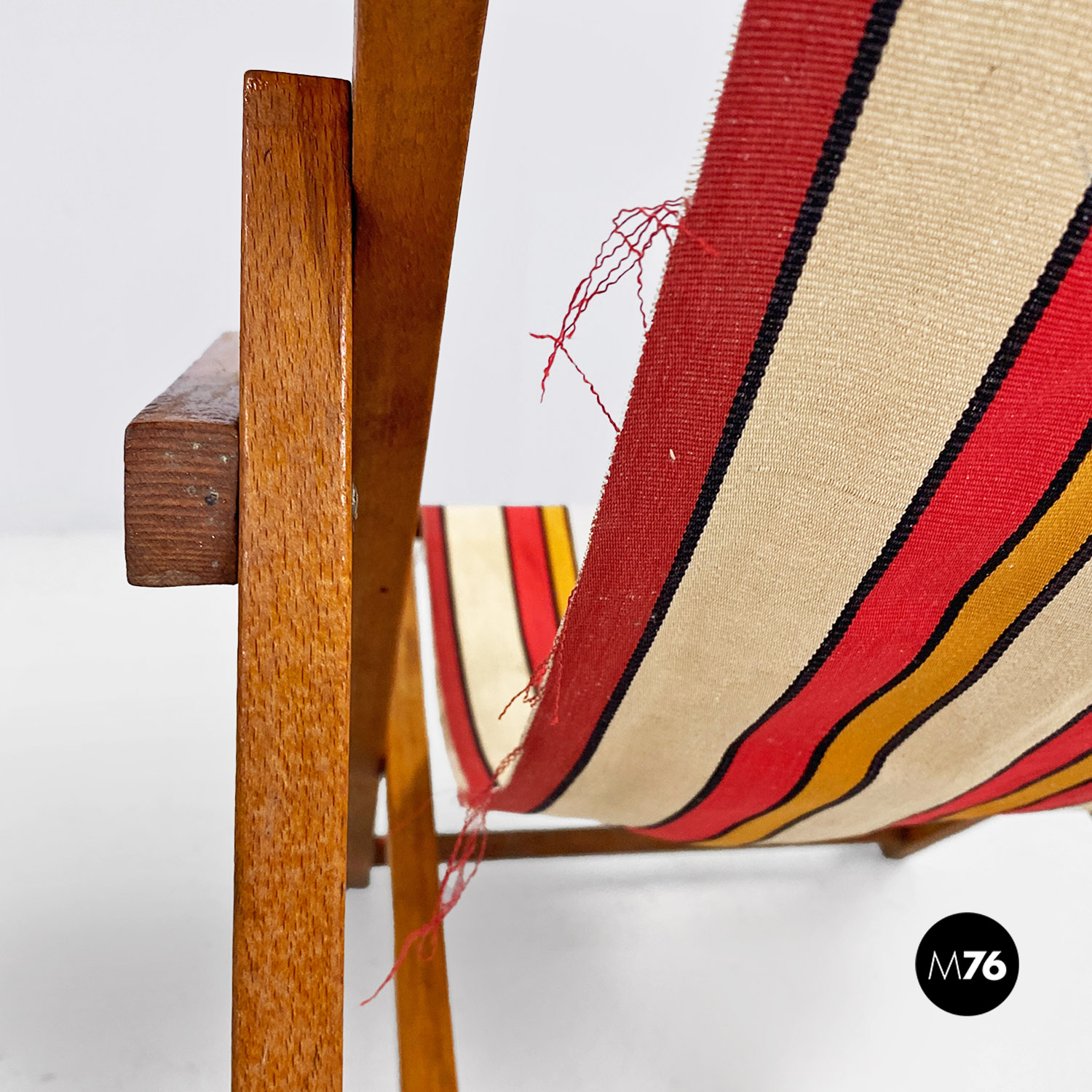 Sdraio da bambino con struttura in legno e seduta in tessuto a righe colorate rosse, gialle e beige.