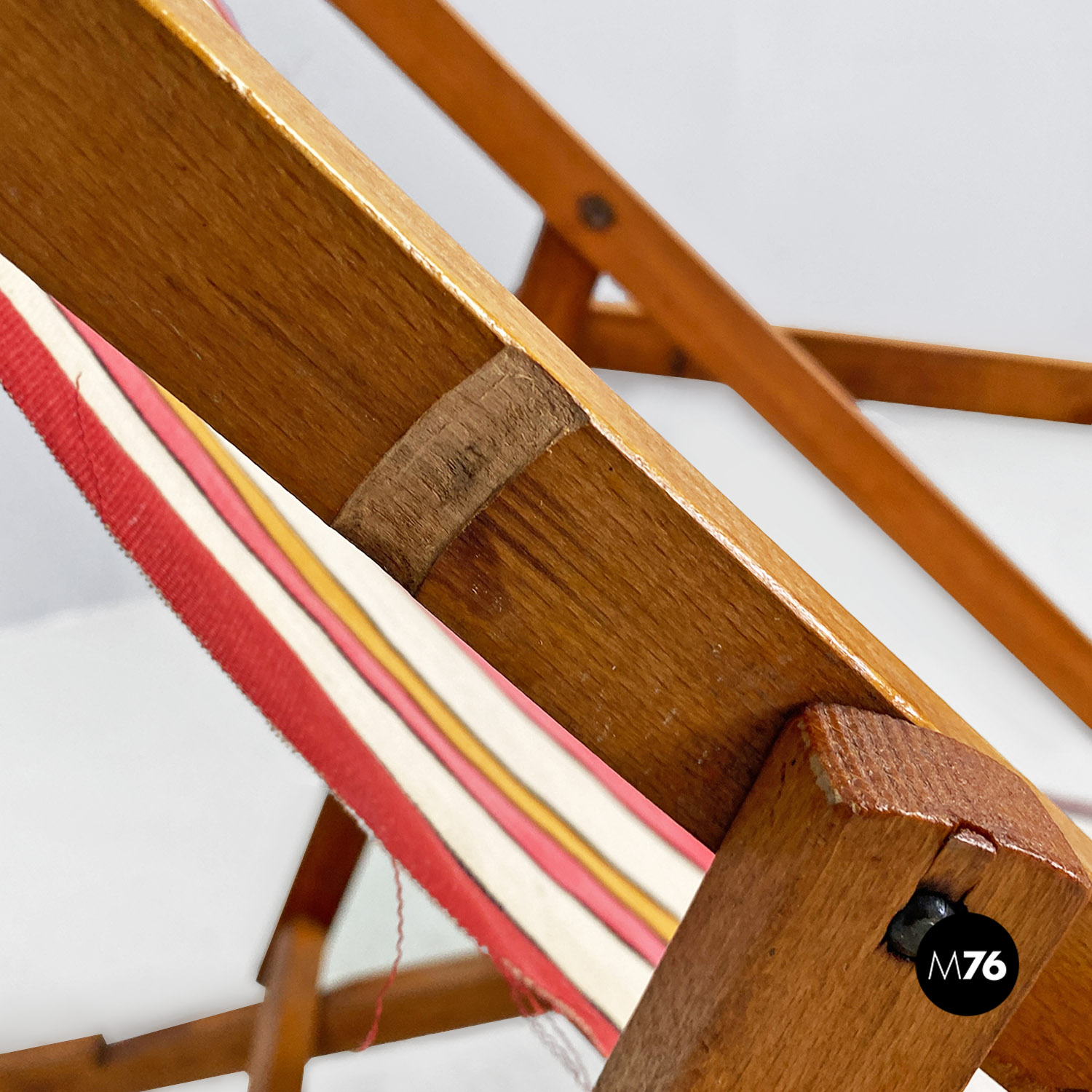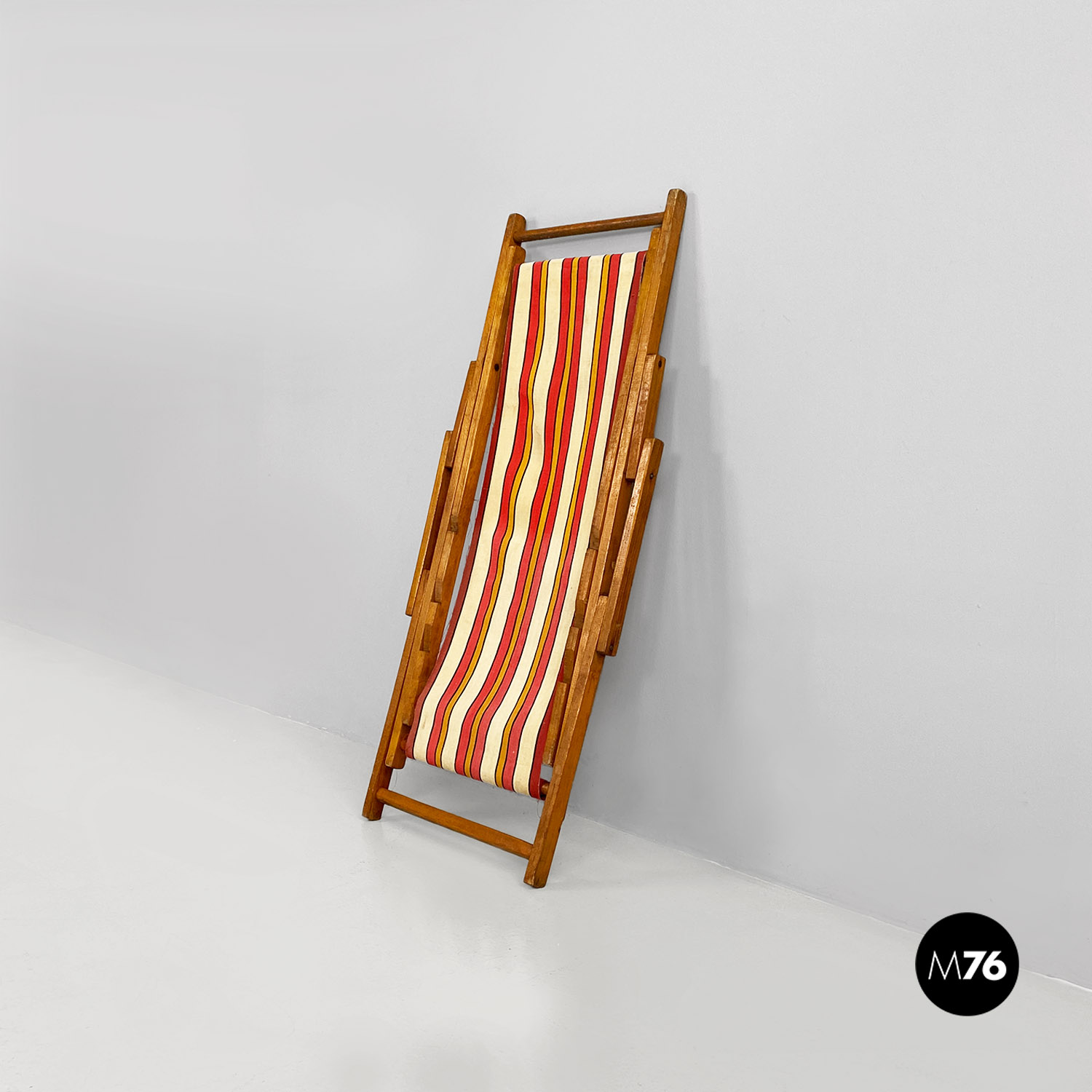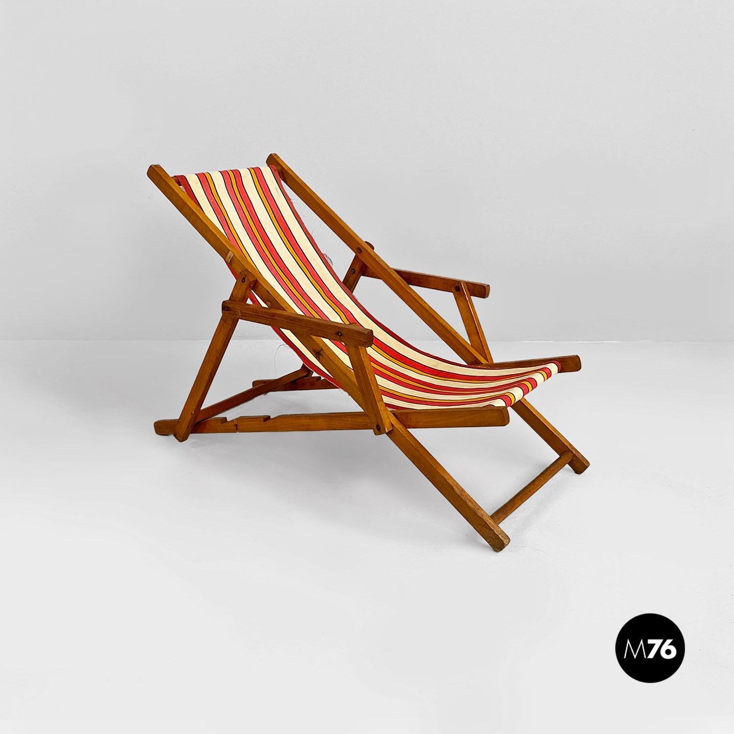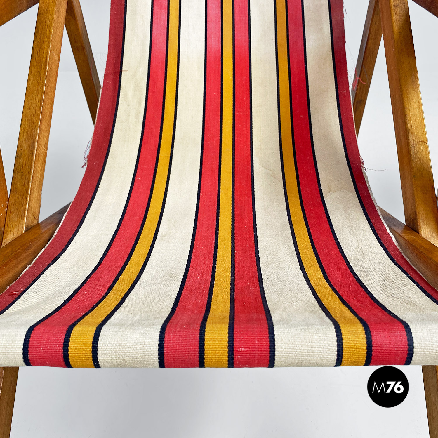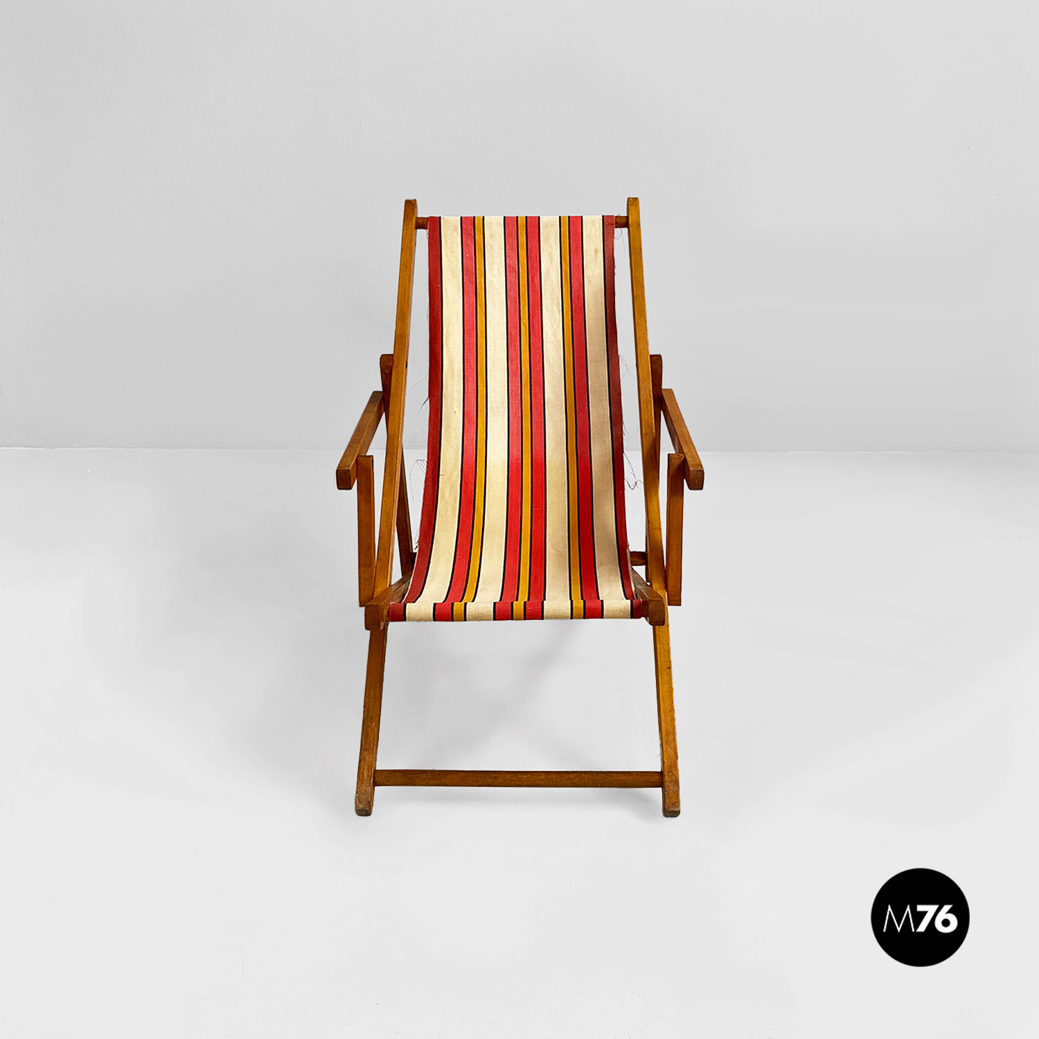 Sdraio da bambino con struttura in legno e seduta in tessuto a righe colorate rosse, gialle e beige.