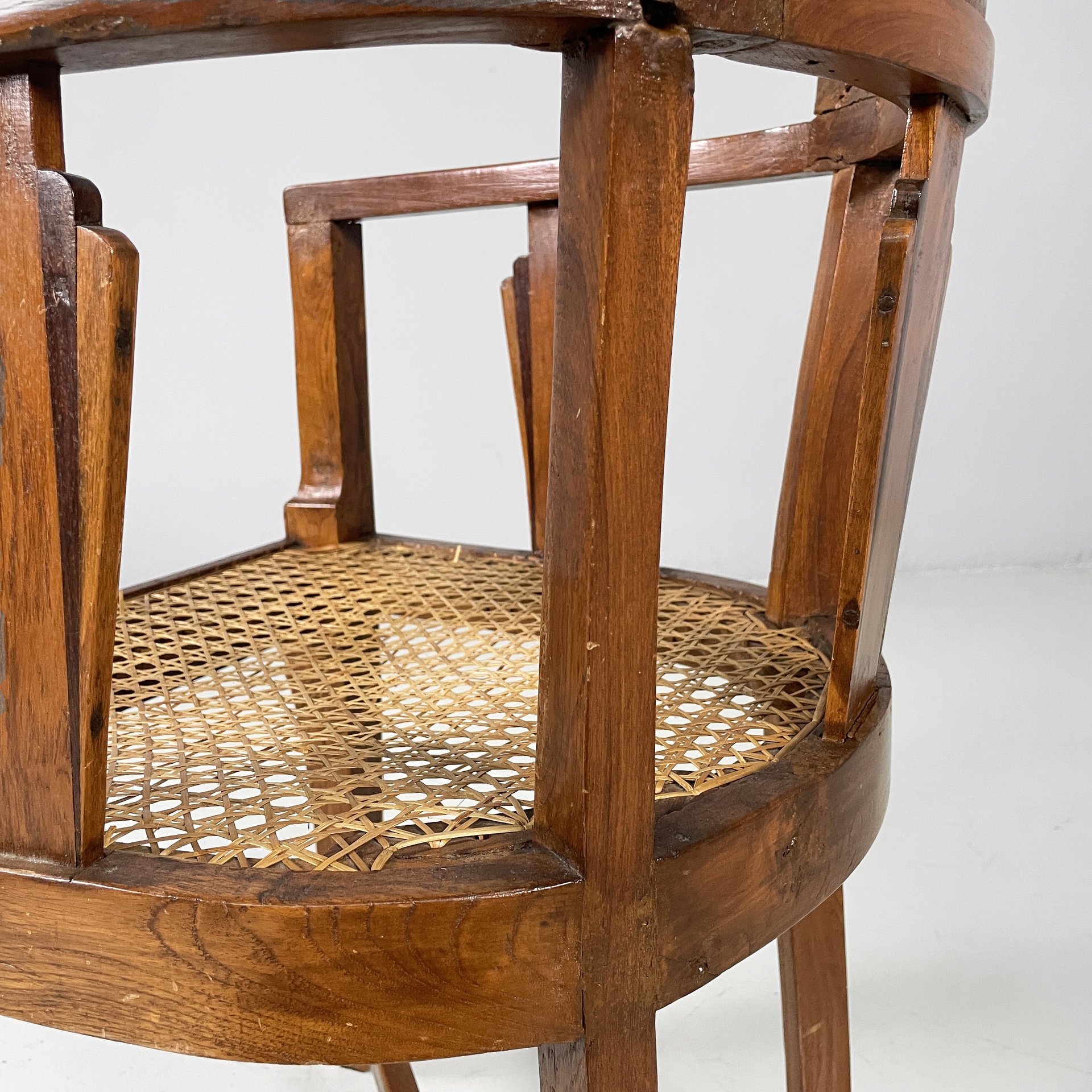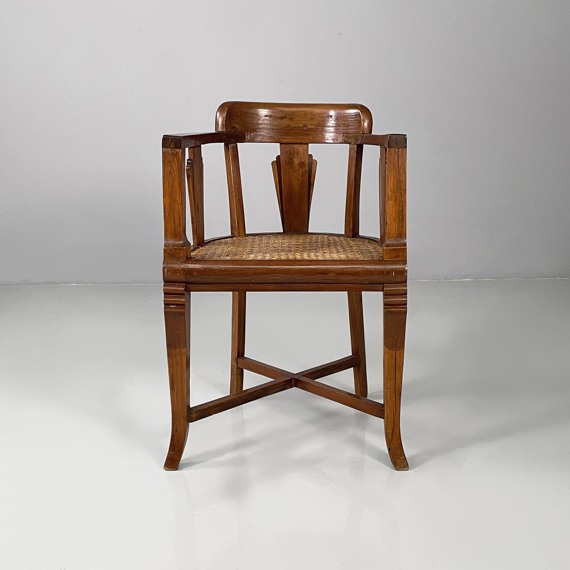 Sedia a pozzetto con seduta in paglia. Lo schienale, i braccioli e le zampe sono in legno. In stile Art Nouveau-Liberty.