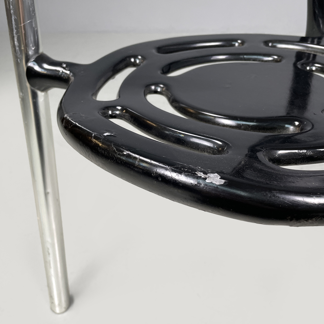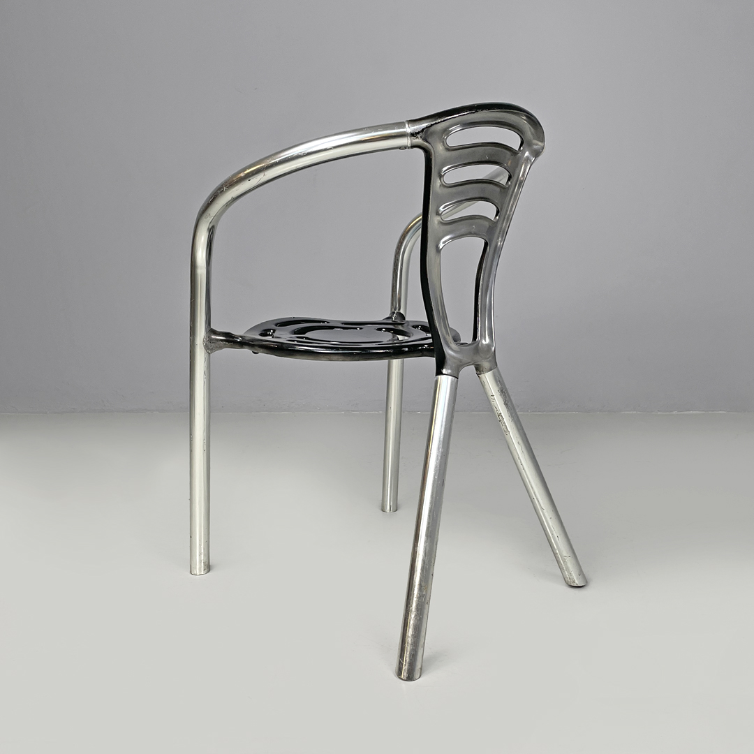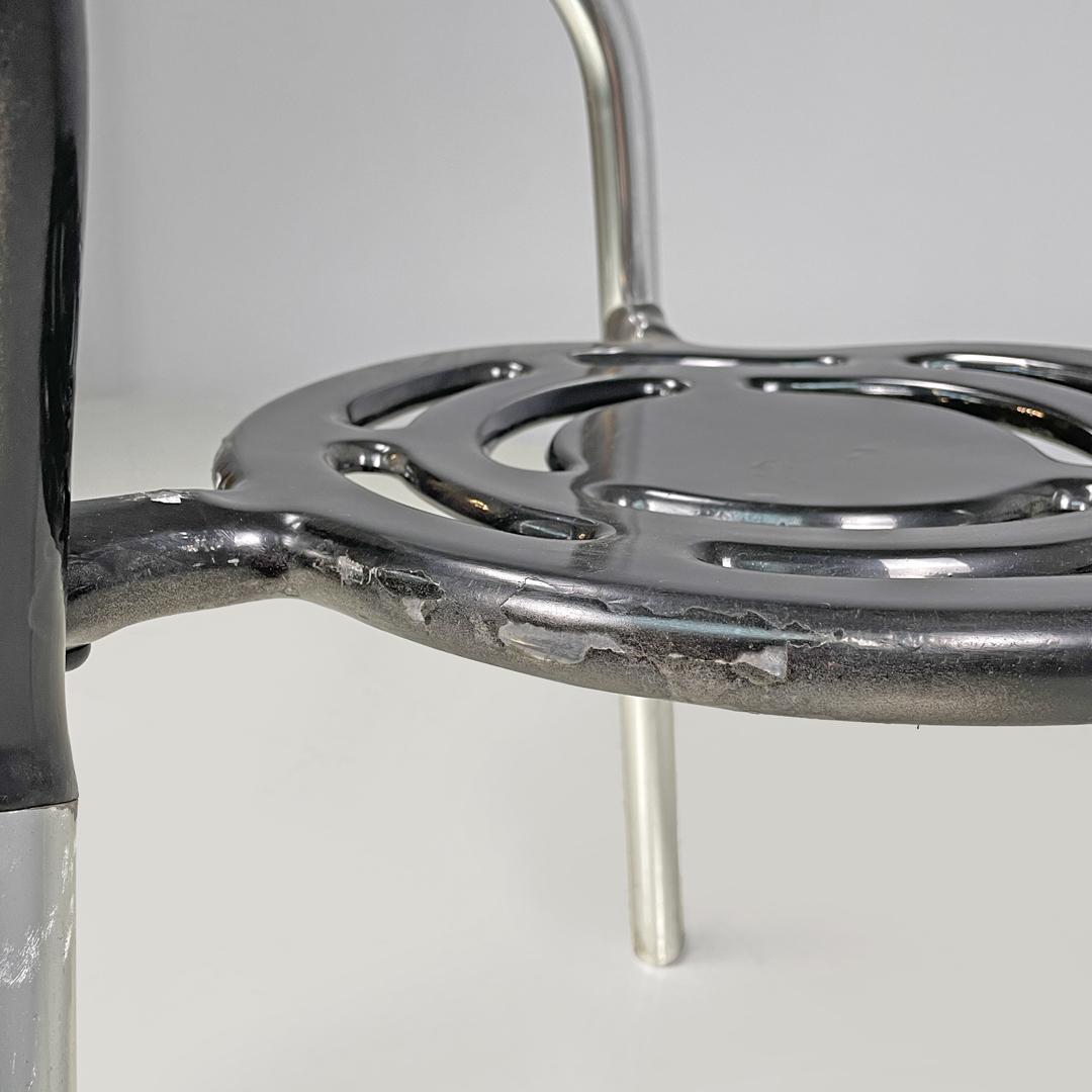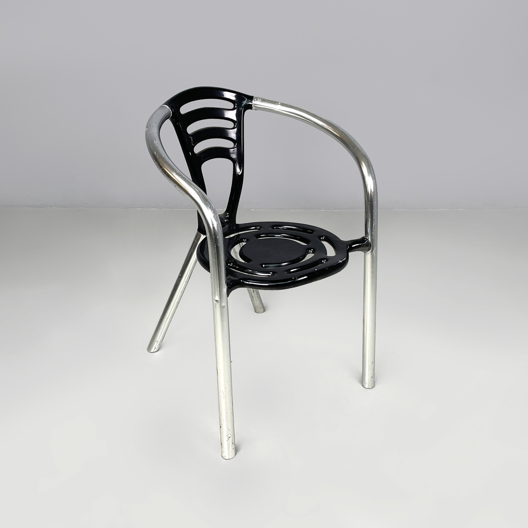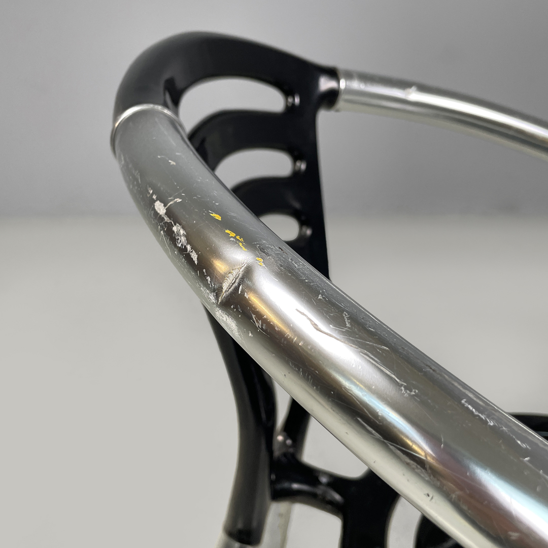 Sedia modello Boulevard con seduta tonda, interamente in alluminio. La seduta e lo schienale hanno delle forature decorative dalle linee curve e la struttura dei braccioli e delle gambe è composta da un tubolare in alluminio. La seduta è stata dipinta di nero. Utilizzabile anche in un ambiente esterno come un giardino o un terrazzo.