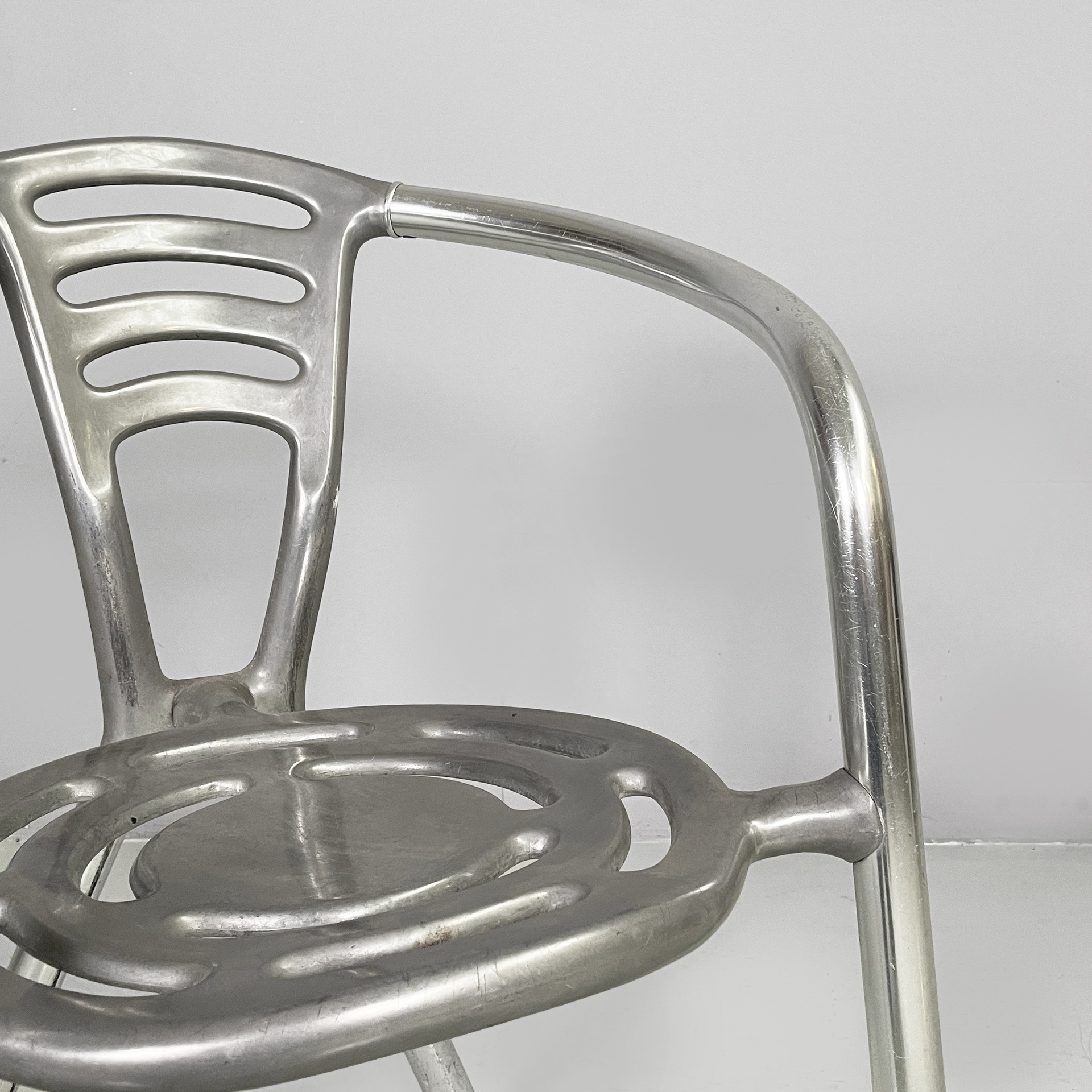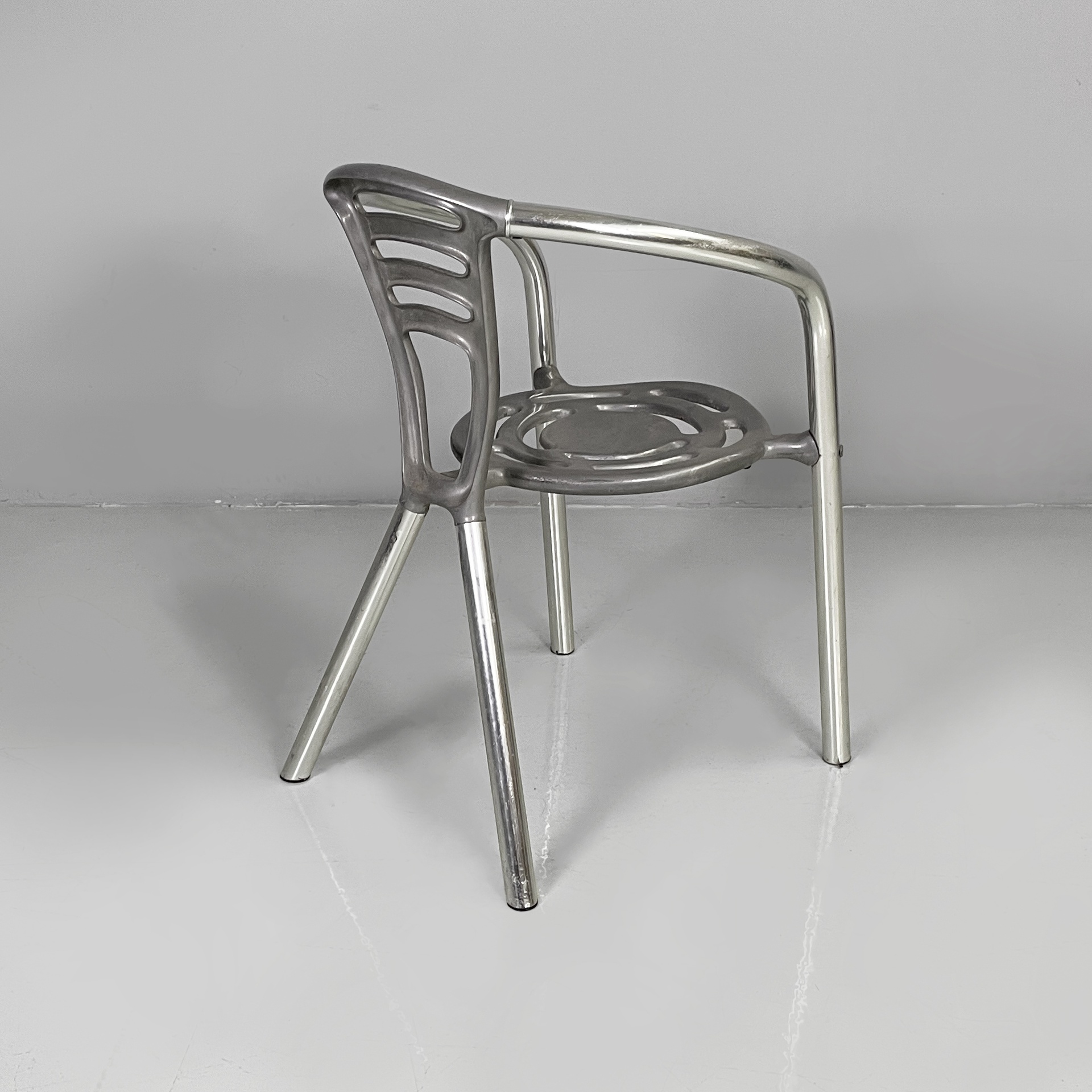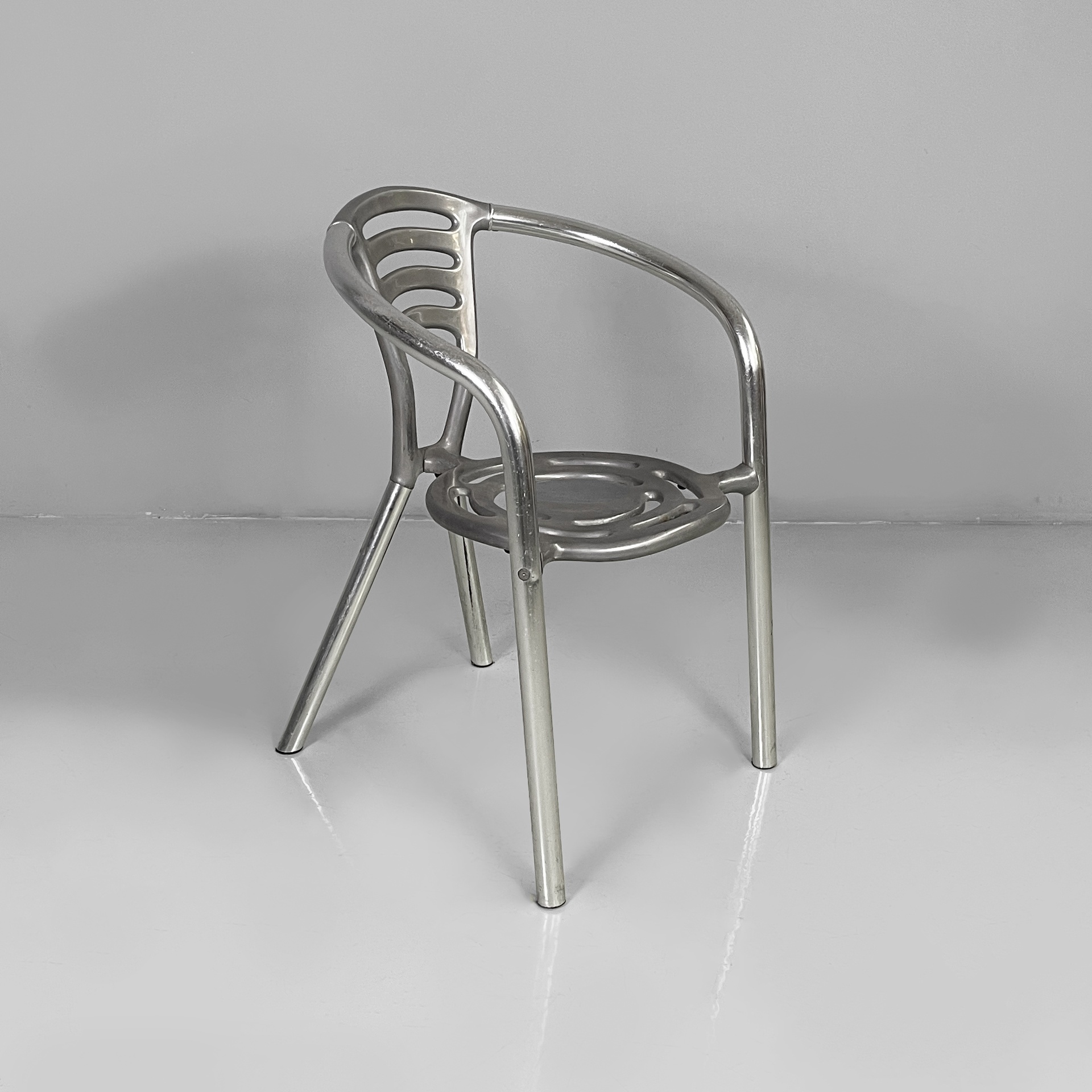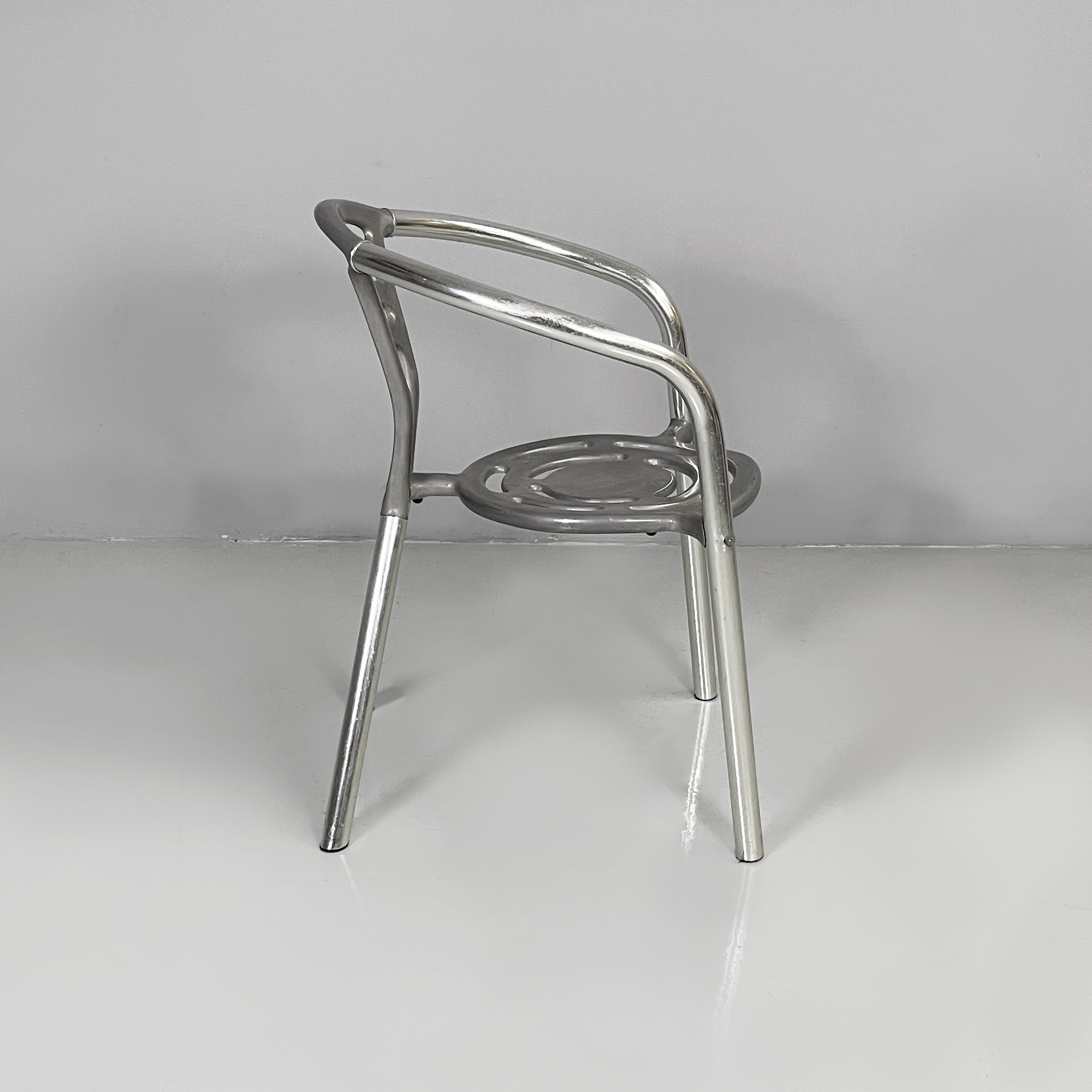 Sedia modello Boulevard con seduta tonda, interamente in alluminio. La seduta e lo schienale hanno delle forature decorative dalle linee curve. La struttura dei braccioli e delle gambe è composta da un tubolare in alluminio. Utilizzabile anche in un ambiente esterno come un giardino o un terrazzo.