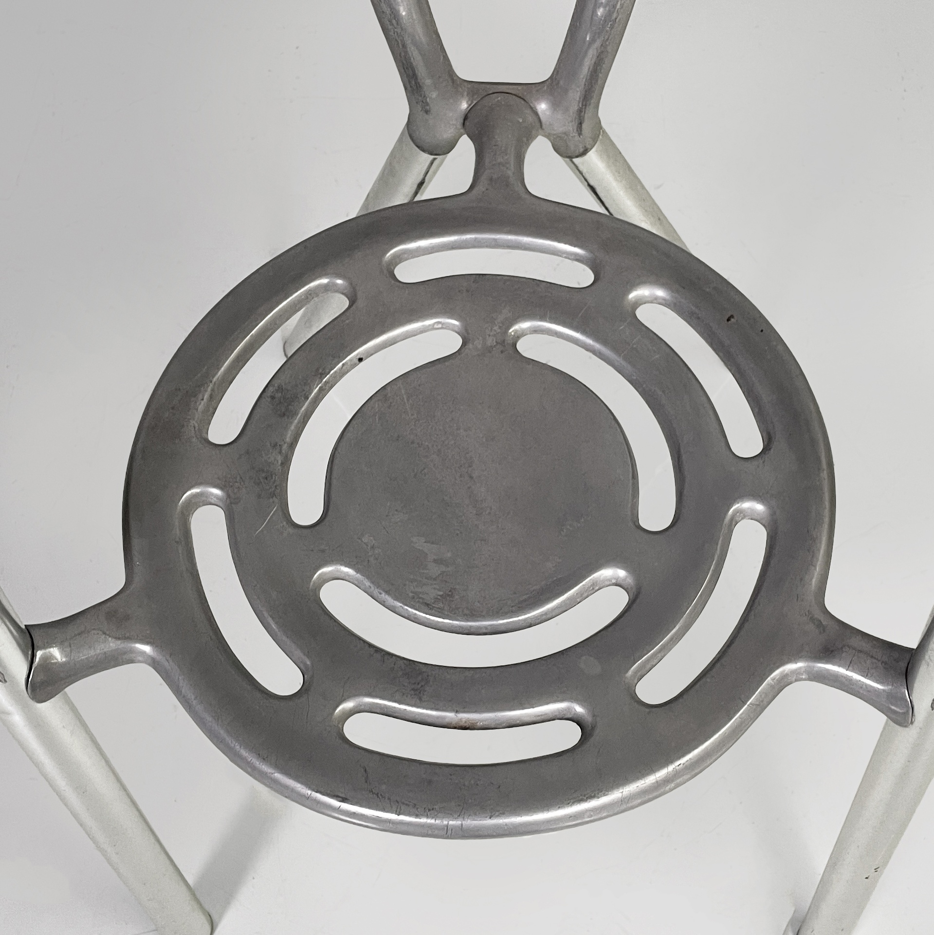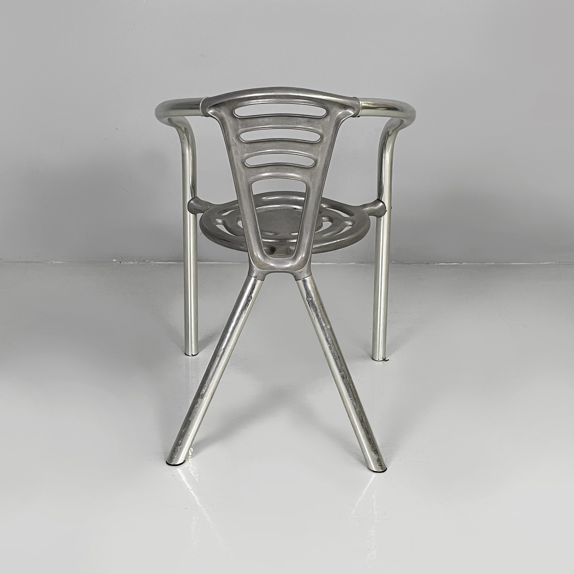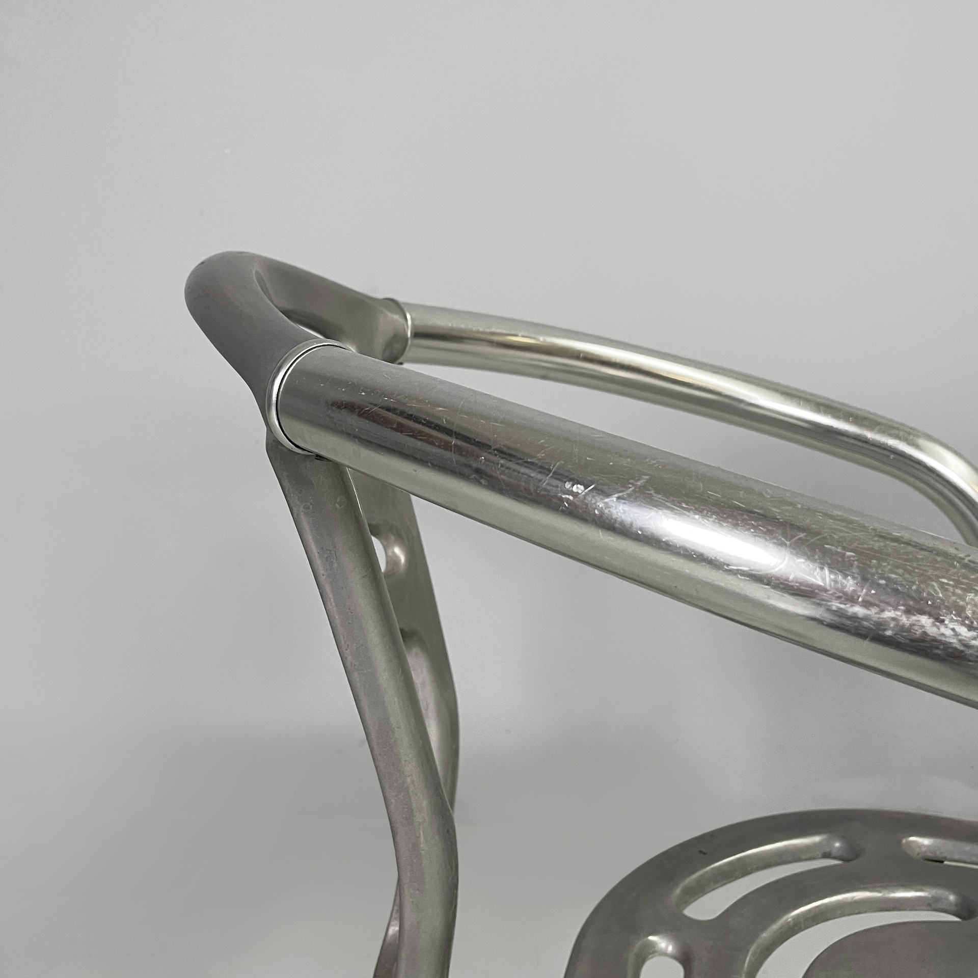 Sedia modello Boulevard con seduta tonda, interamente in alluminio. La seduta e lo schienale hanno delle forature decorative dalle linee curve. La struttura dei braccioli e delle gambe è composta da un tubolare in alluminio. Utilizzabile anche in un ambiente esterno come un giardino o un terrazzo.