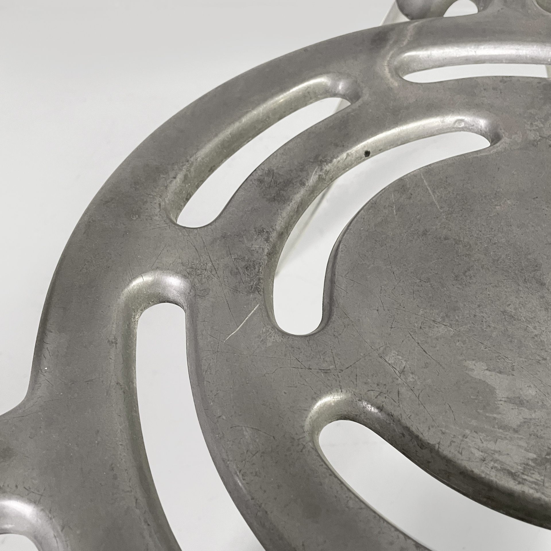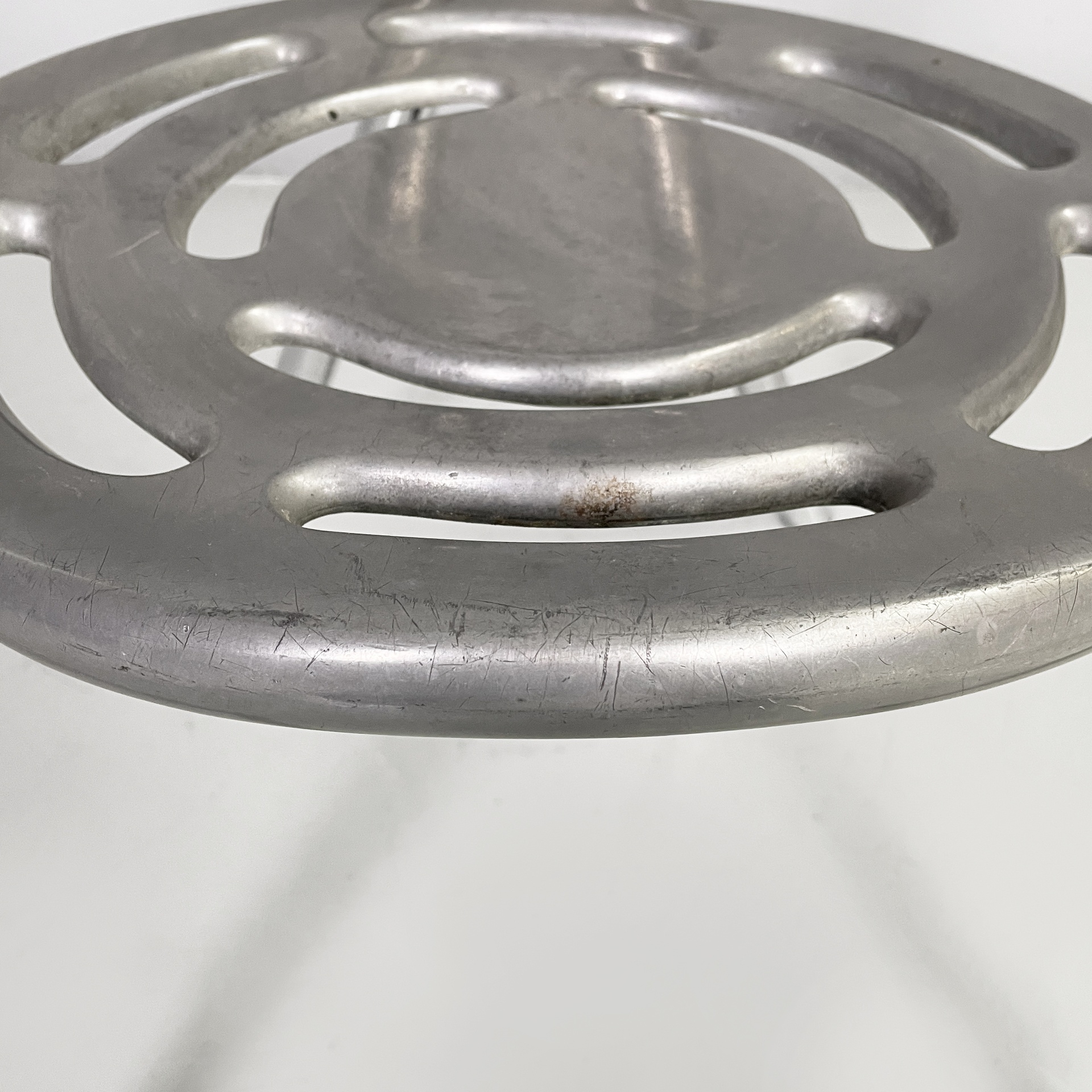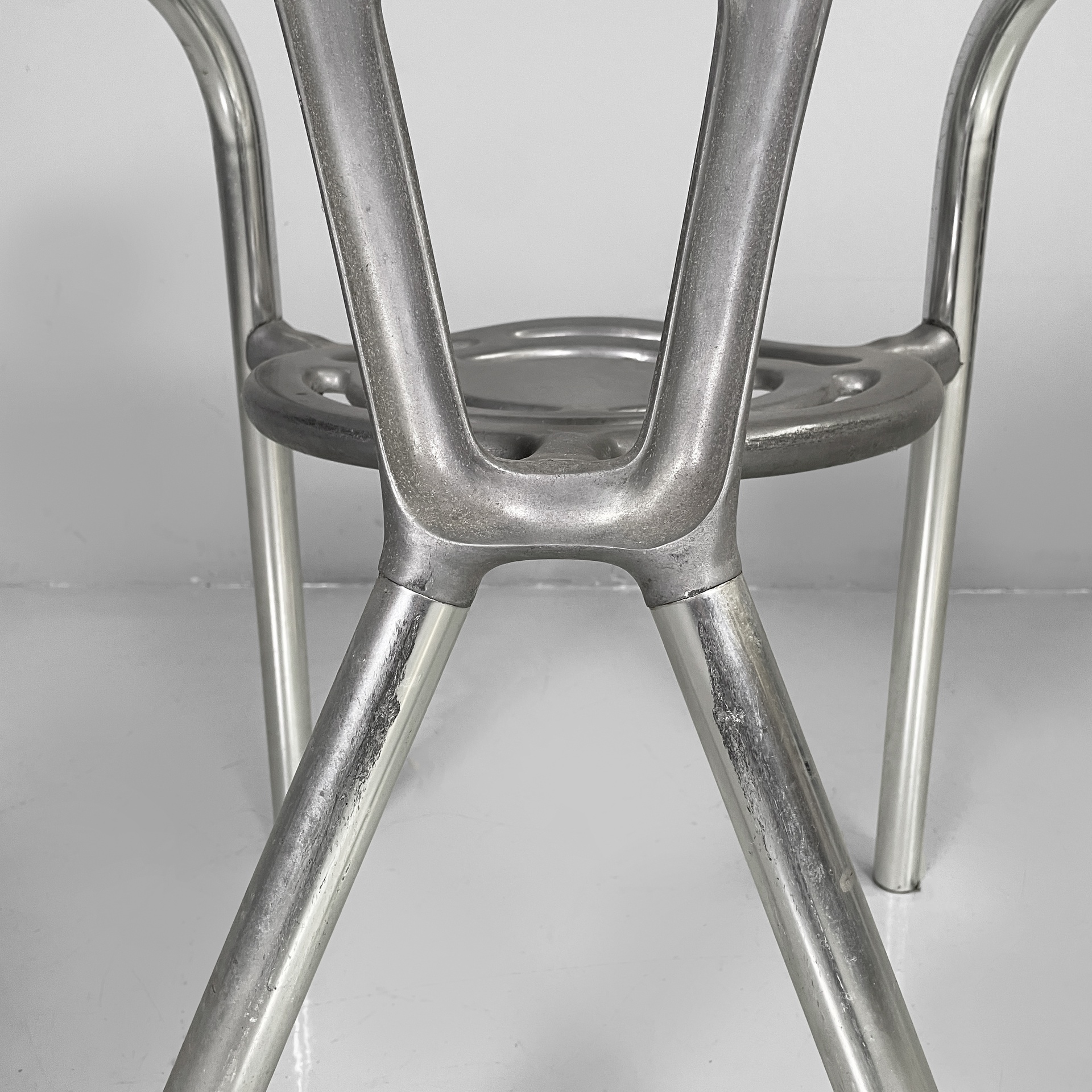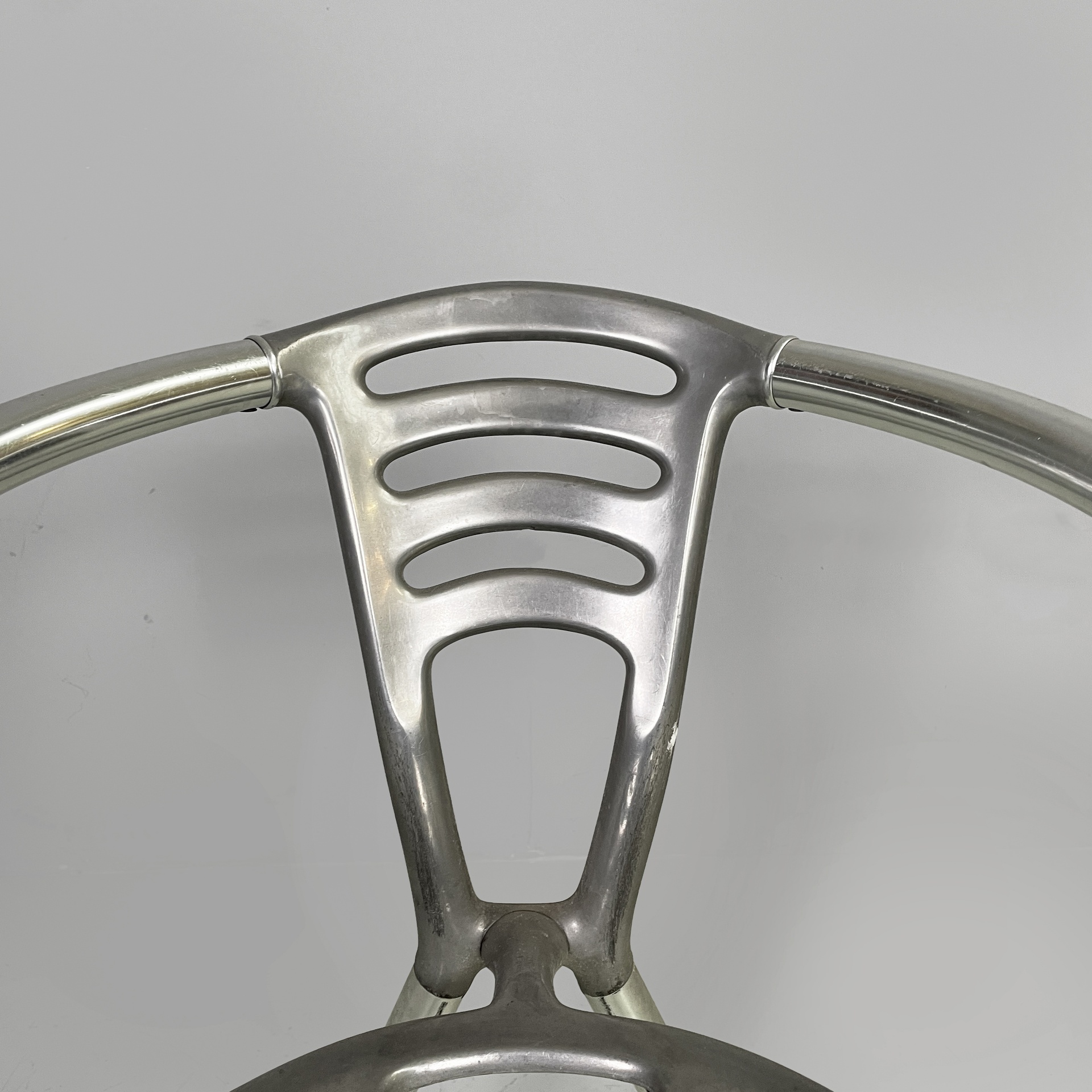 Sedia modello Boulevard con seduta tonda, interamente in alluminio. La seduta e lo schienale hanno delle forature decorative dalle linee curve. La struttura dei braccioli e delle gambe è composta da un tubolare in alluminio. Utilizzabile anche in un ambiente esterno come un giardino o un terrazzo.