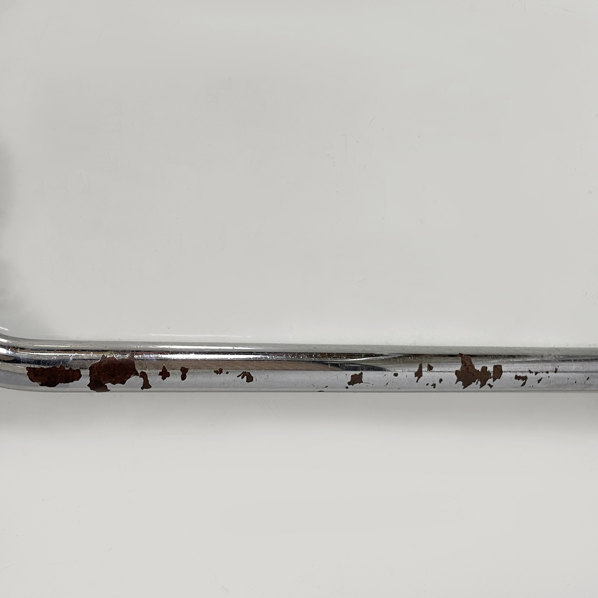 Condizioni discrete, leggeri segni del tempo sul legno. L’acciaio presenta segni e mancanze date dal tempo e dall’utilizzo. Paglia rifatta a nuovo a mano.