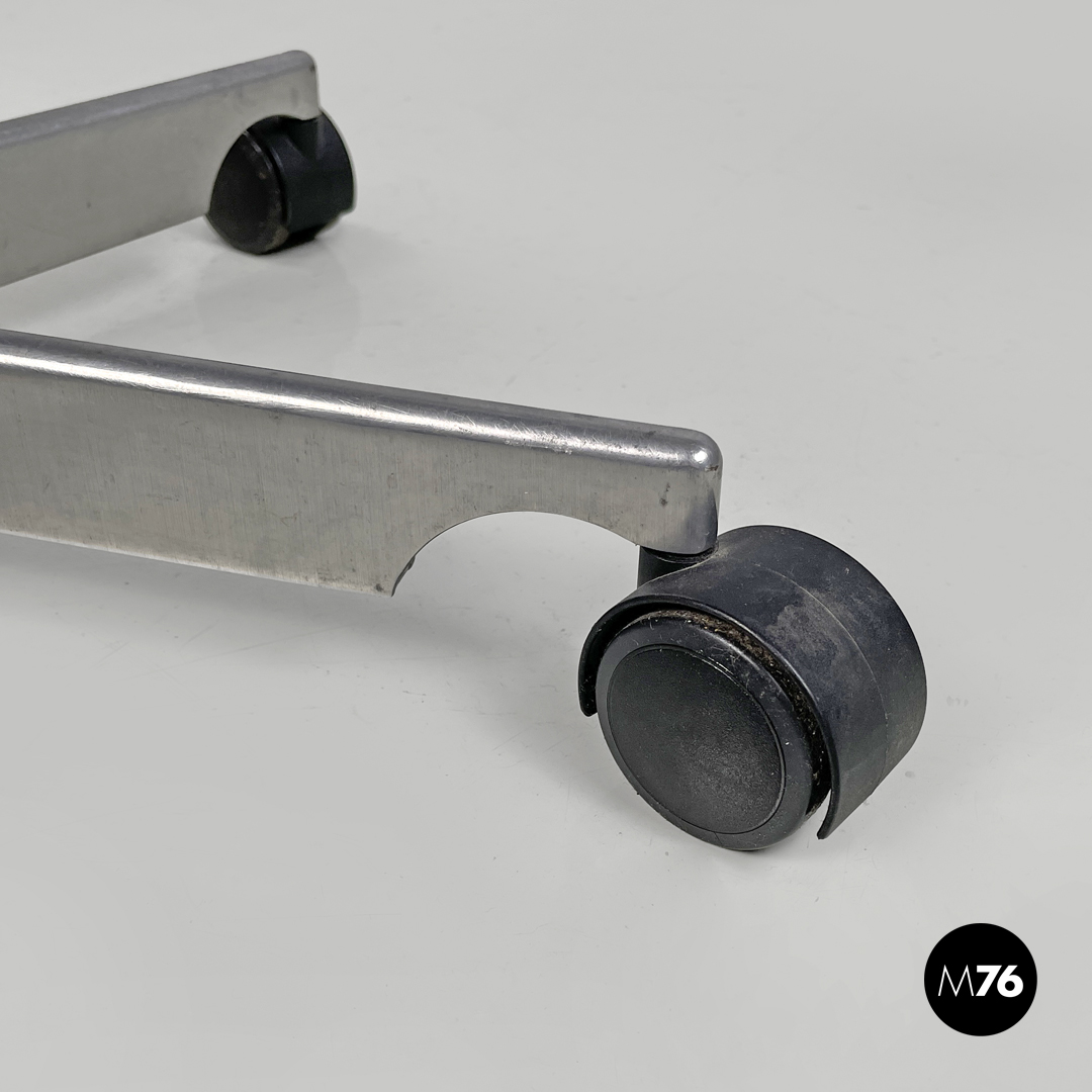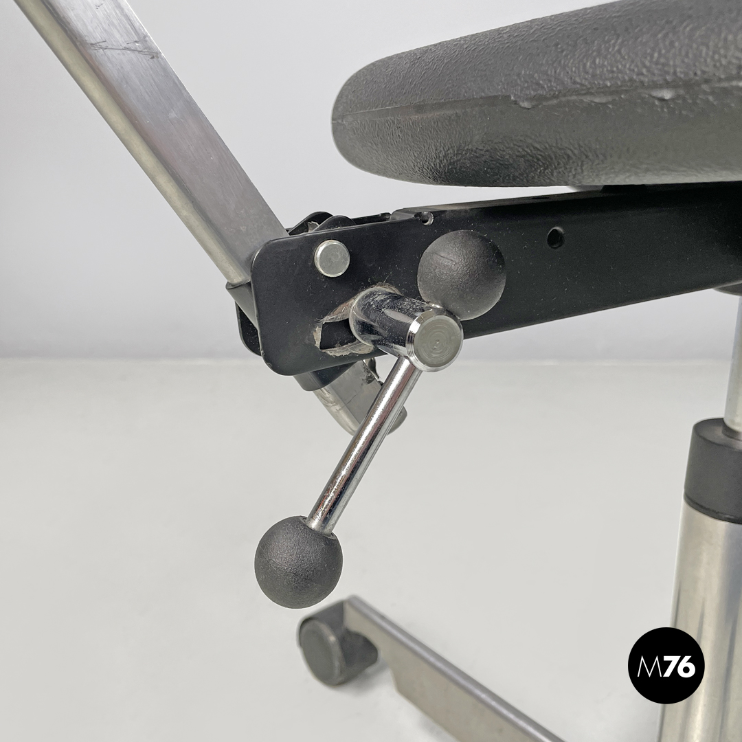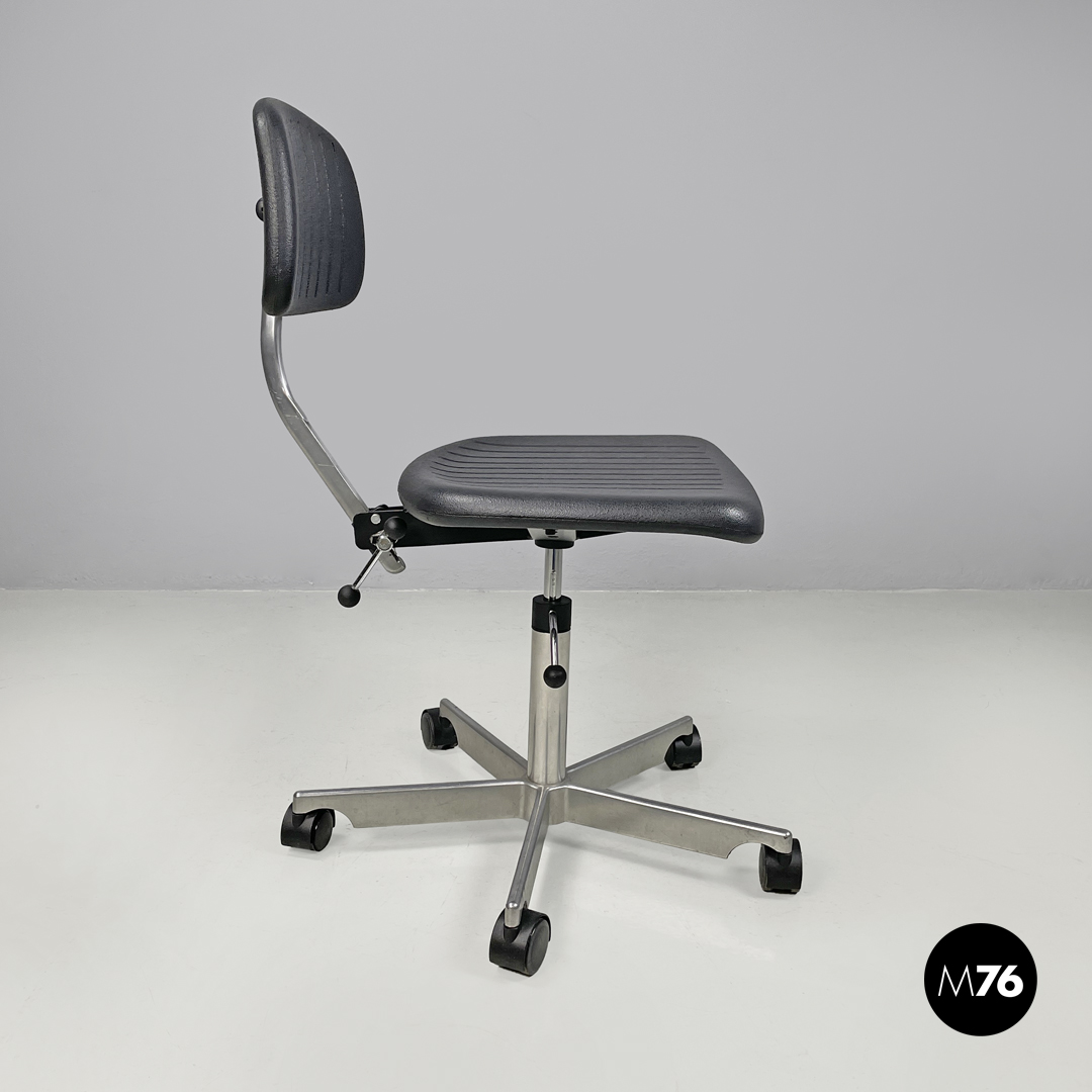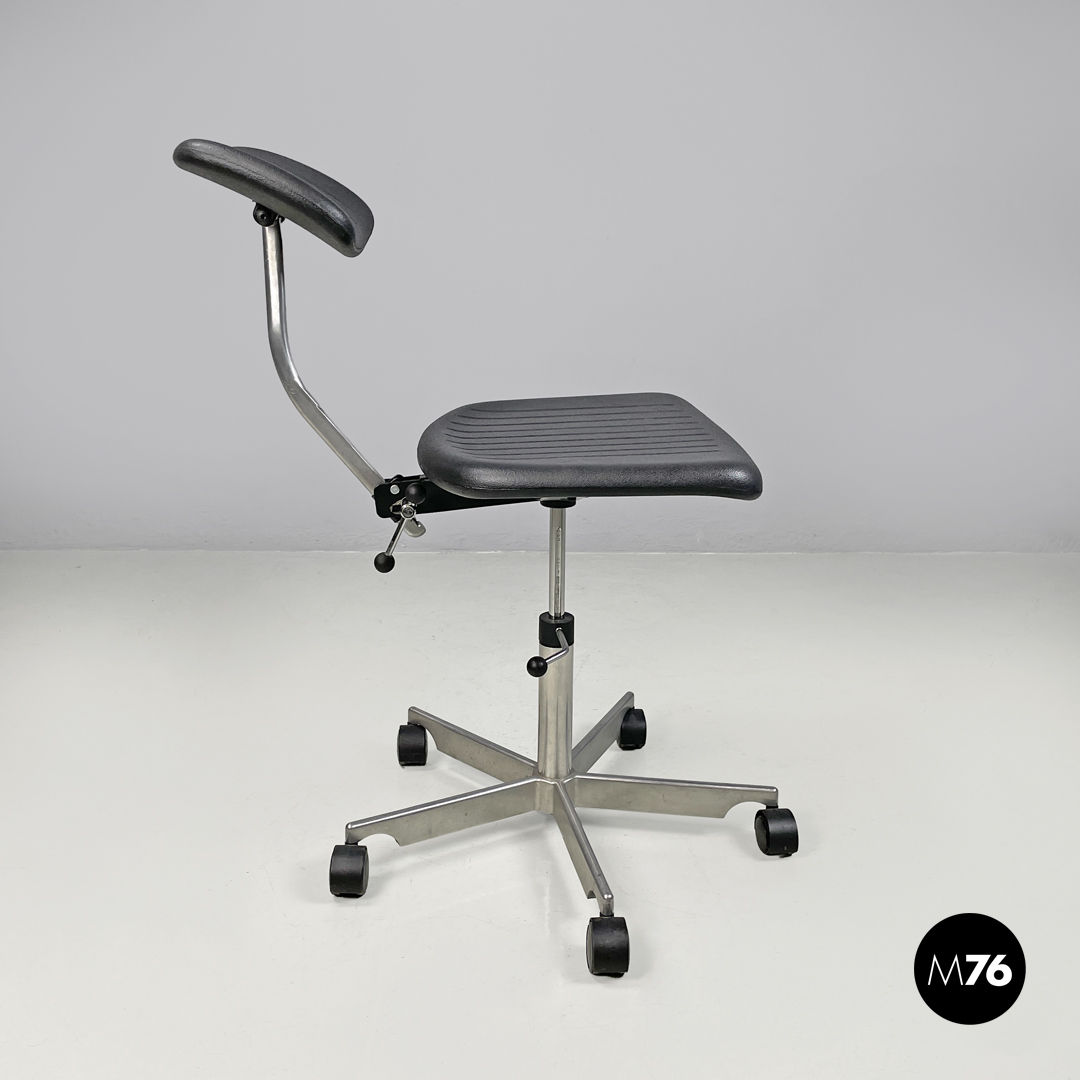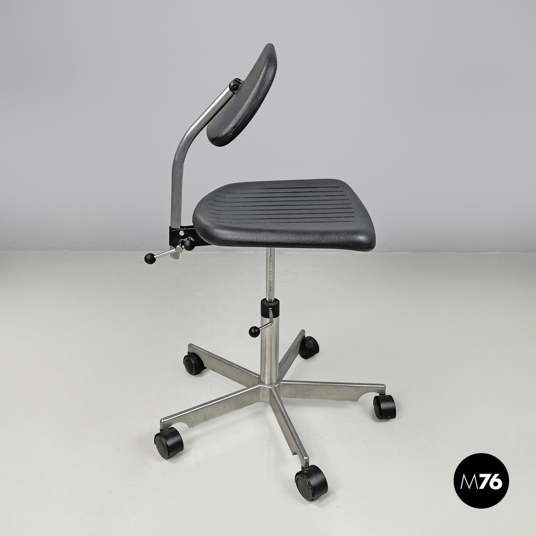 Sedia da ufficio con ruote e struttura in metallo. La seduta e lo schienali tondeggianti sono in gomma nera con scanalature verticali e texture “a puntini”. Lo schienale è modulabile grazie ad un meccanismo sotto la seduta, è modificabile anche l’altezza sempre tramite un meccanismo sullo stelo centrale. Con cinque razze che terminano con ruote in plastica nera.