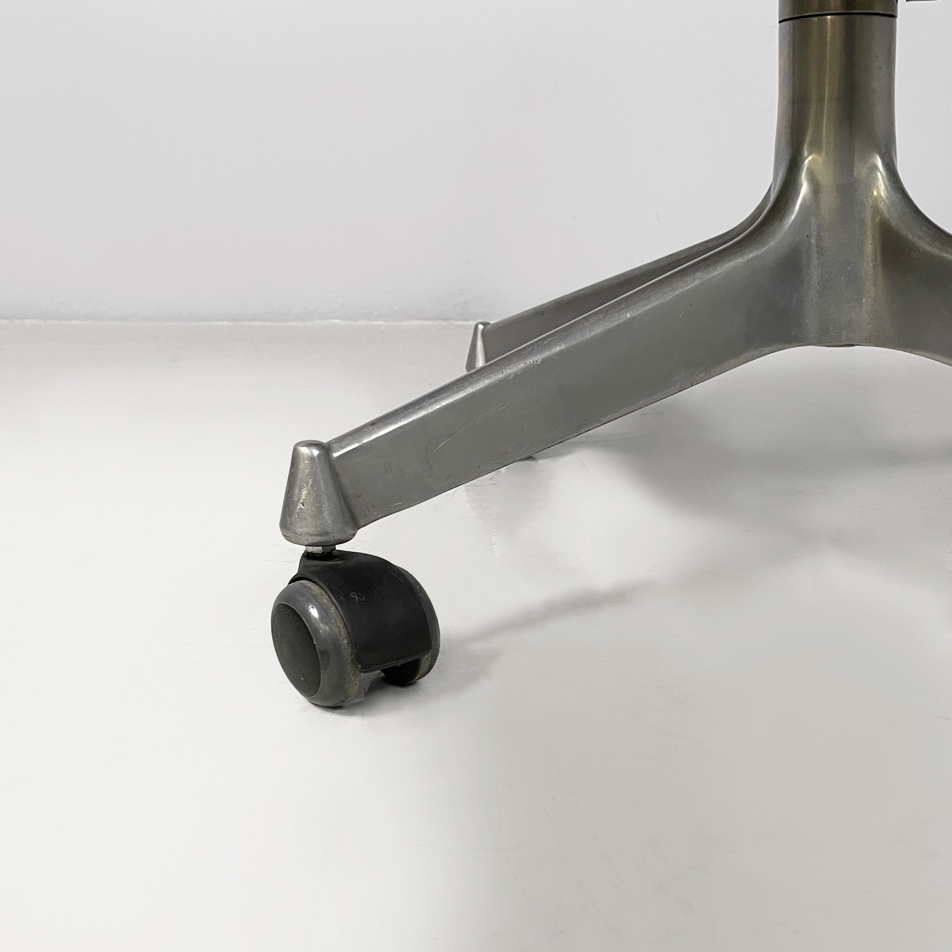 Sedia o poltrona da ufficio con seduta e schienale imbottiti e rivestiti in pelle marrone, con scocca in legno. La base a quattro razze è in metallo con rotelle nere.