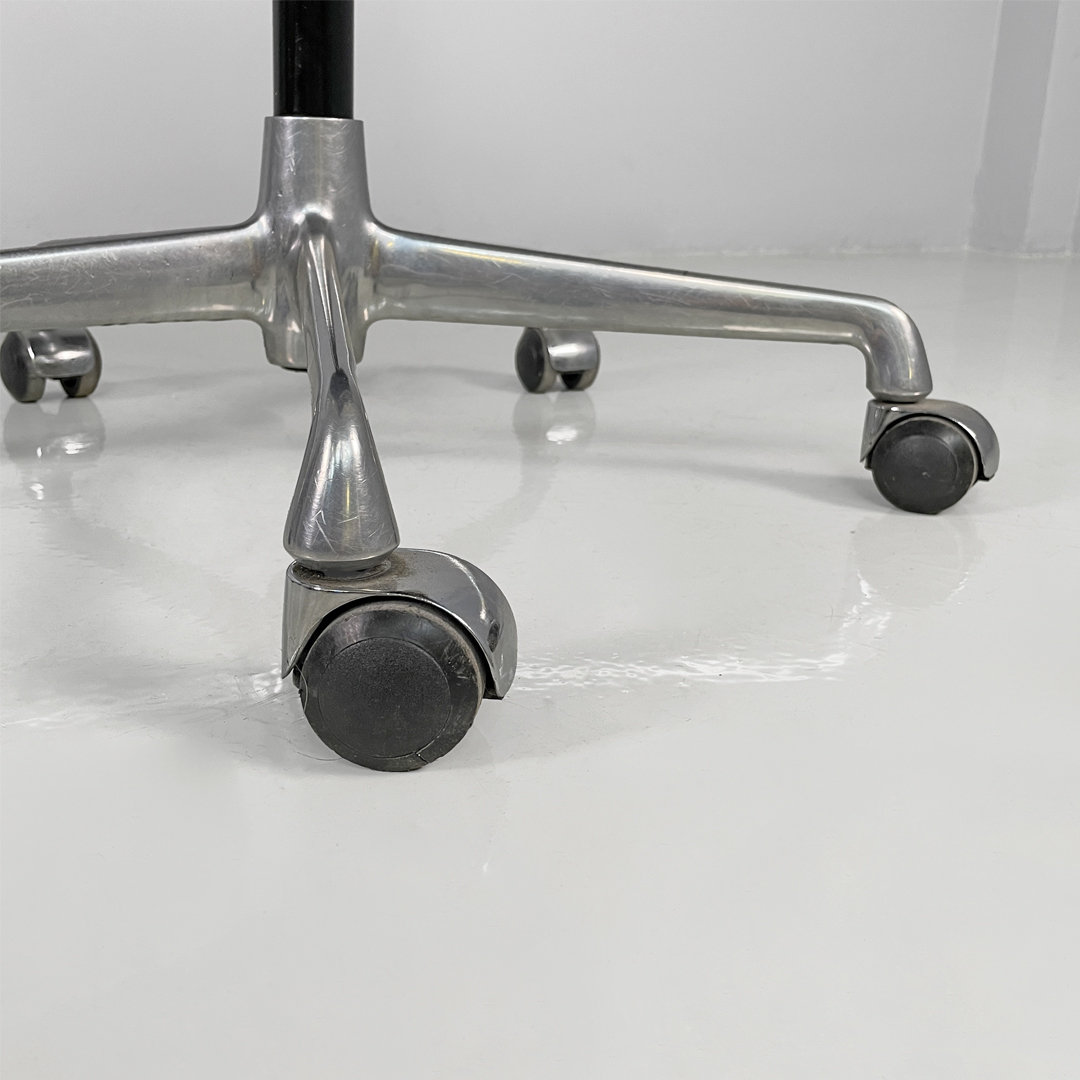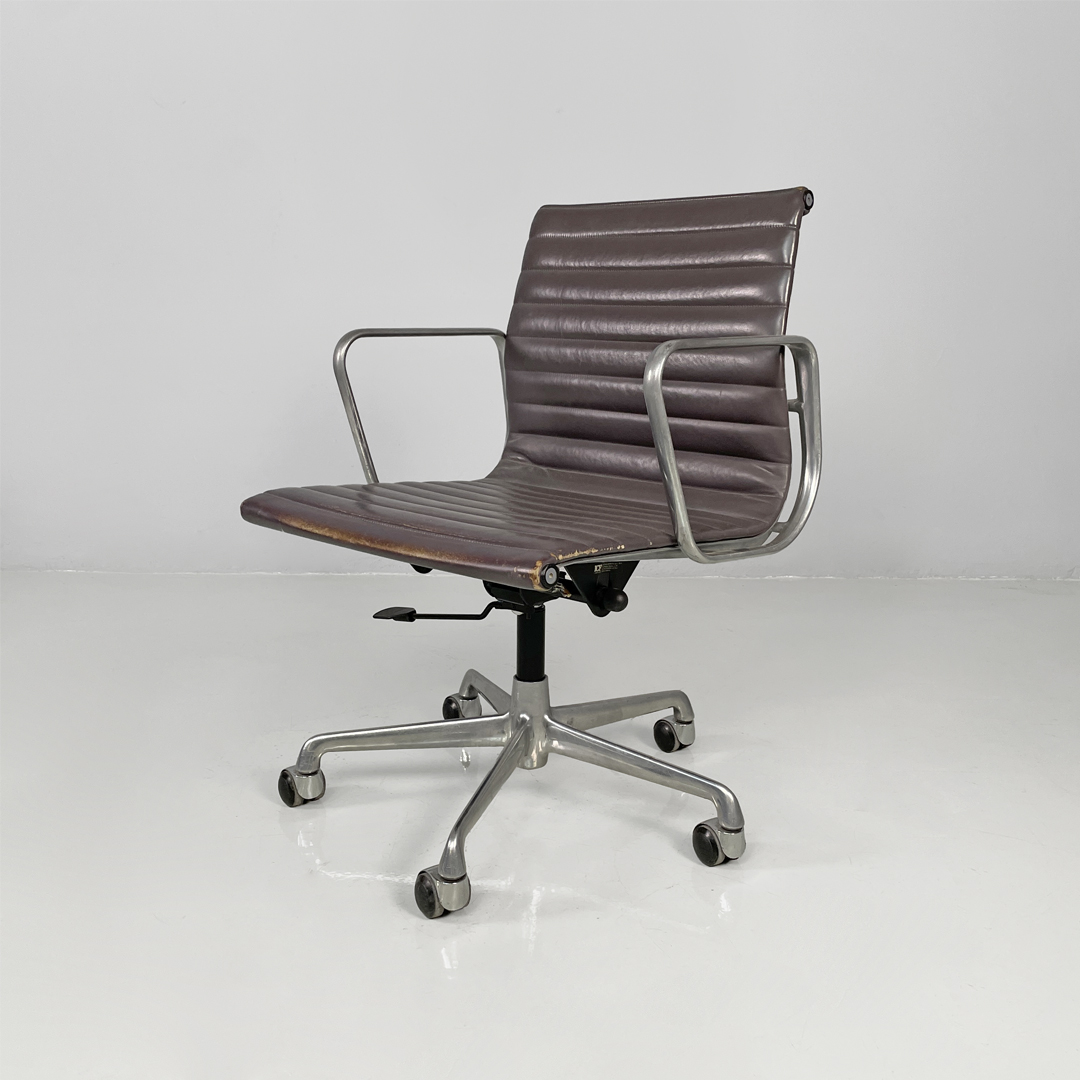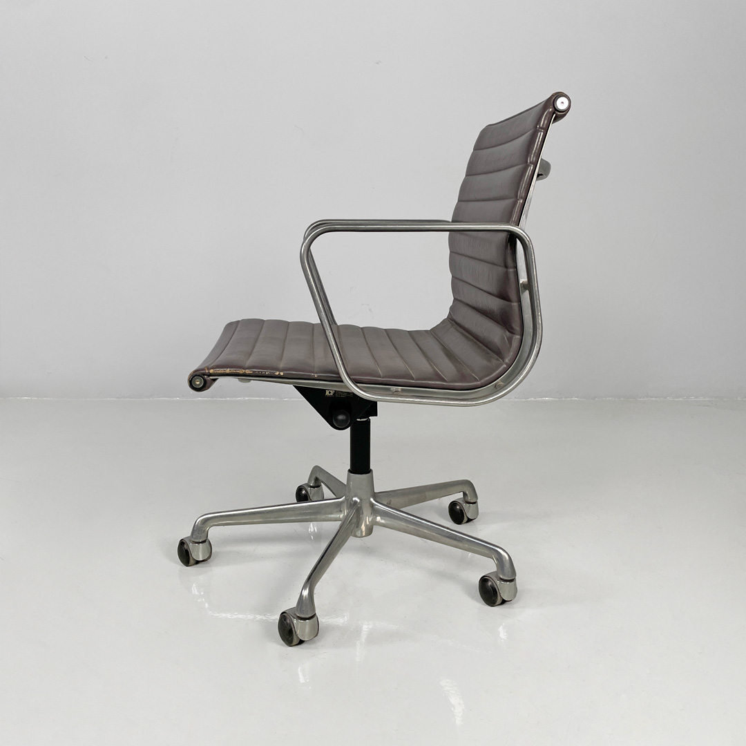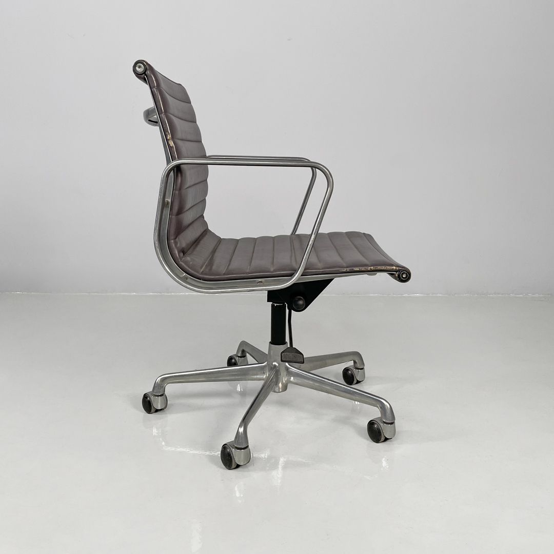 Sedia da ufficio modello EA108 su ruote. La seduta e lo schienale sono rivestite in pelle grigio scuro con cuciture orizzontali. La struttura è in metallo argentato e presenta cinque razze a cui corrispondono altrettante ruote. La sedia presenta una levetta con cui è possibile modificarne l’altezza.