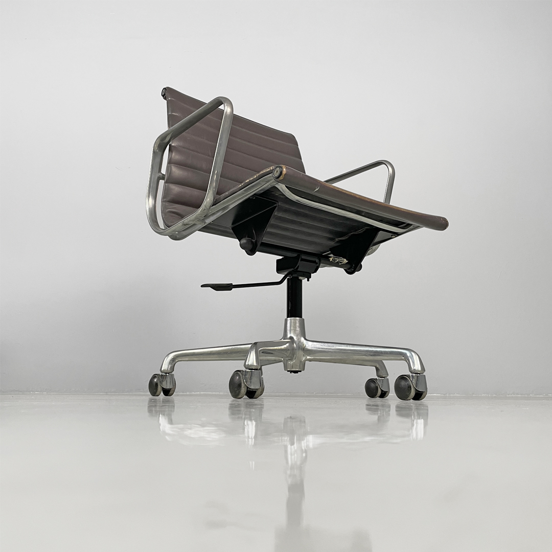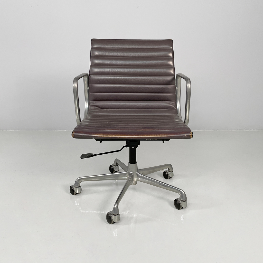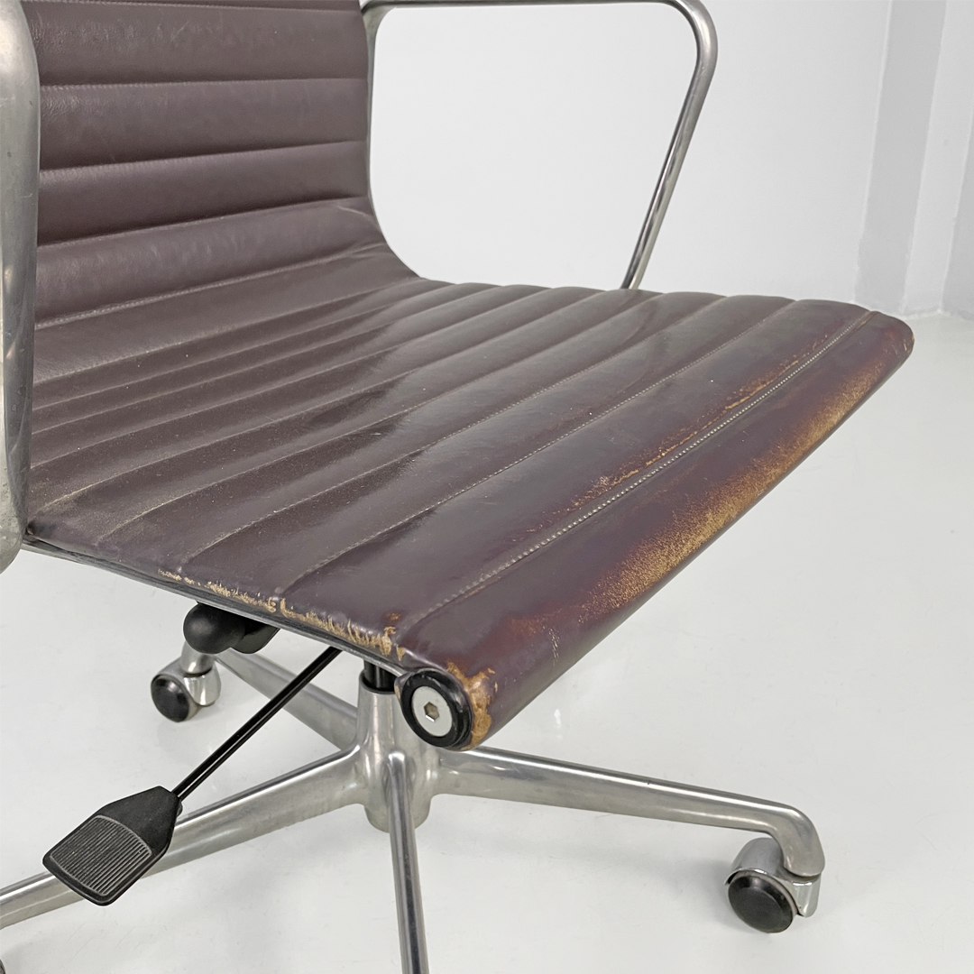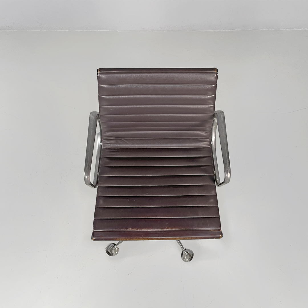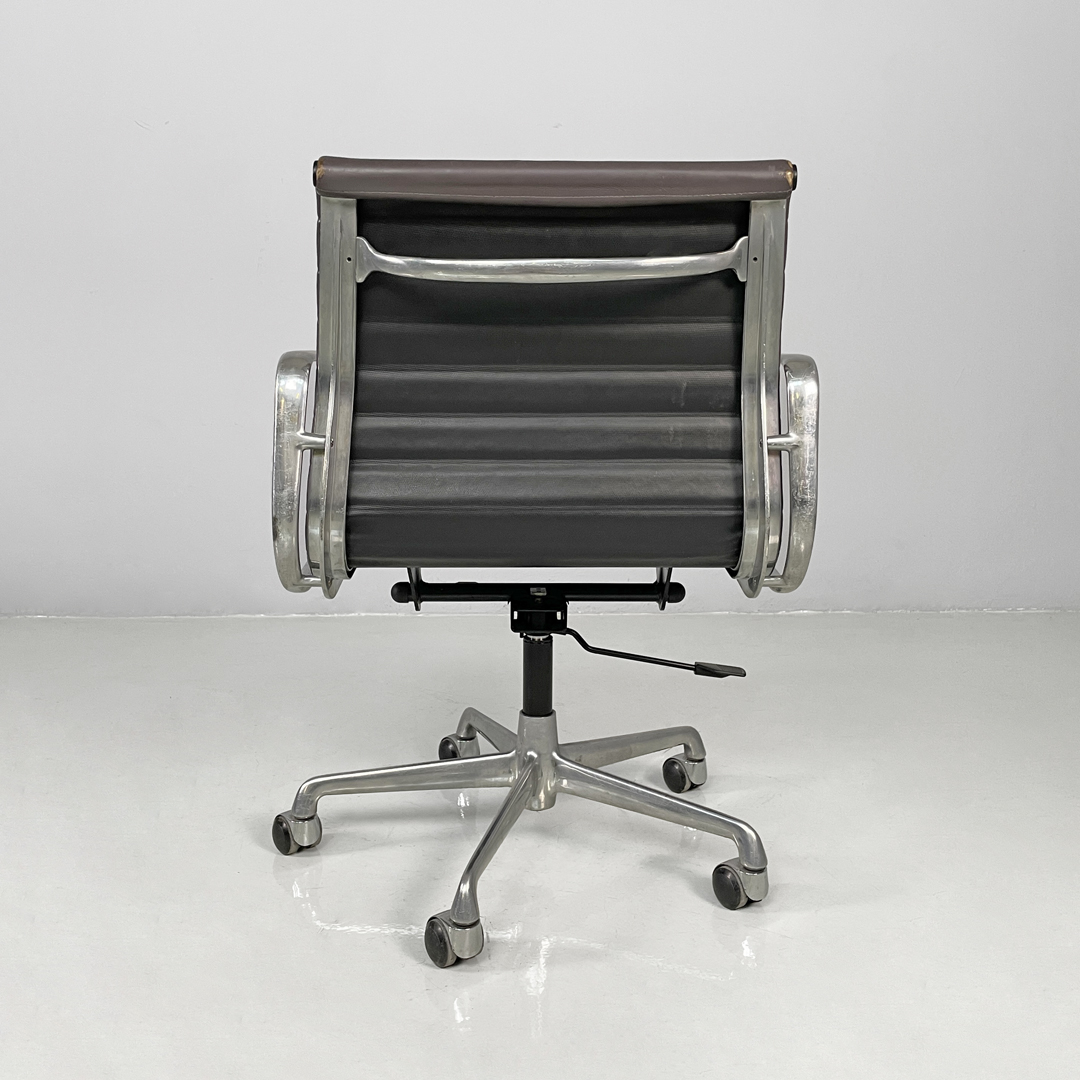 Sedia da ufficio modello EA108 su ruote. La seduta e lo schienale sono rivestite in pelle grigio scuro con cuciture orizzontali. La struttura è in metallo argentato e presenta cinque razze a cui corrispondono altrettante ruote. La sedia presenta una levetta con cui è possibile modificarne l’altezza.