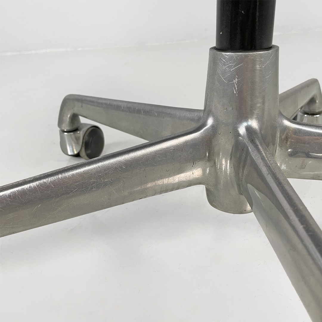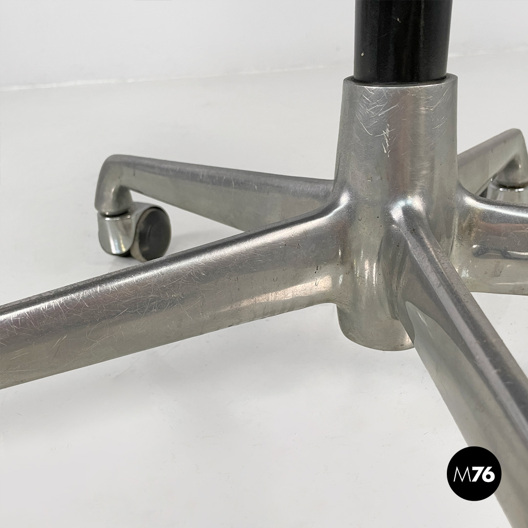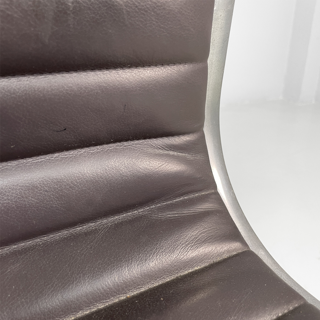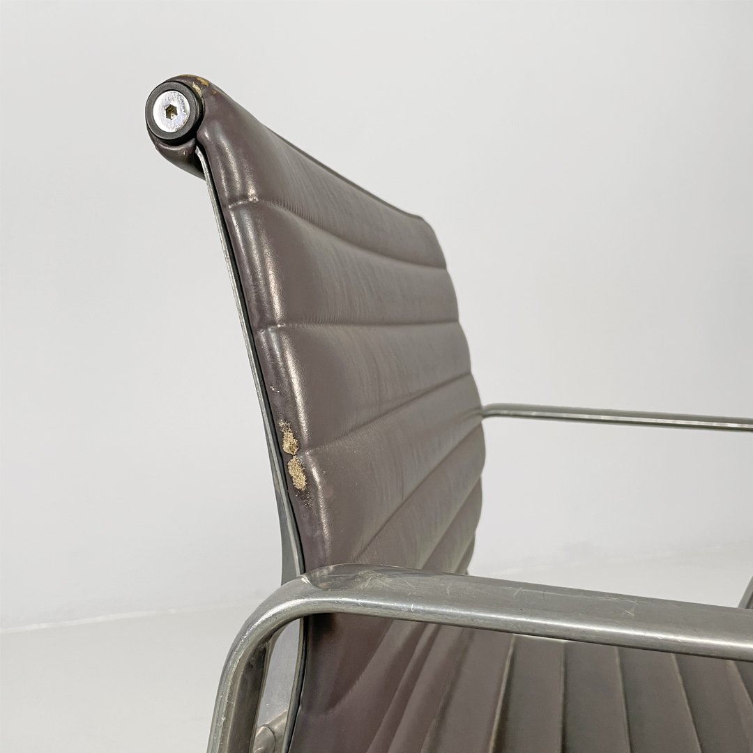 Sedia da ufficio modello EA108 su ruote. La seduta e lo schienale sono rivestite in pelle grigio scuro con cuciture orizzontali. La struttura è in metallo argentato e presenta cinque razze a cui corrispondono altrettante ruote. La sedia presenta una levetta con cui è possibile modificarne l’altezza.