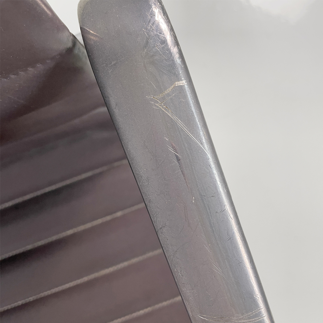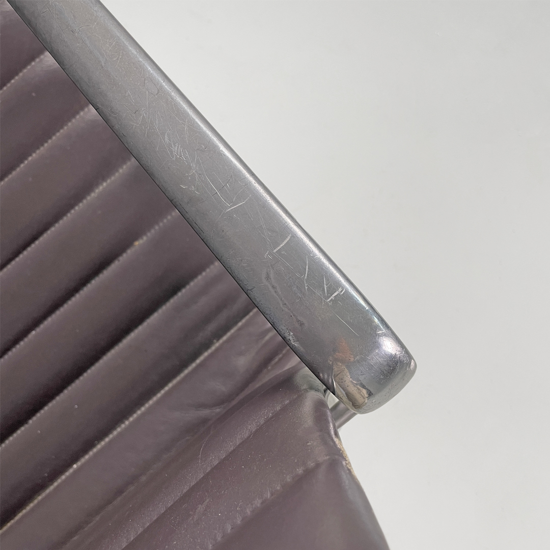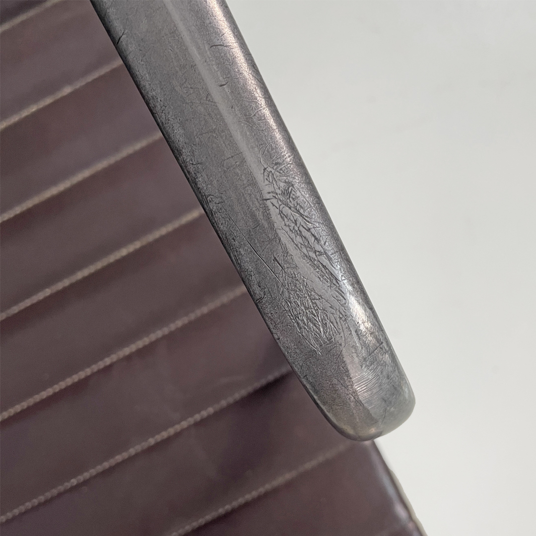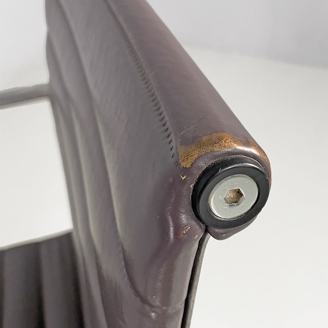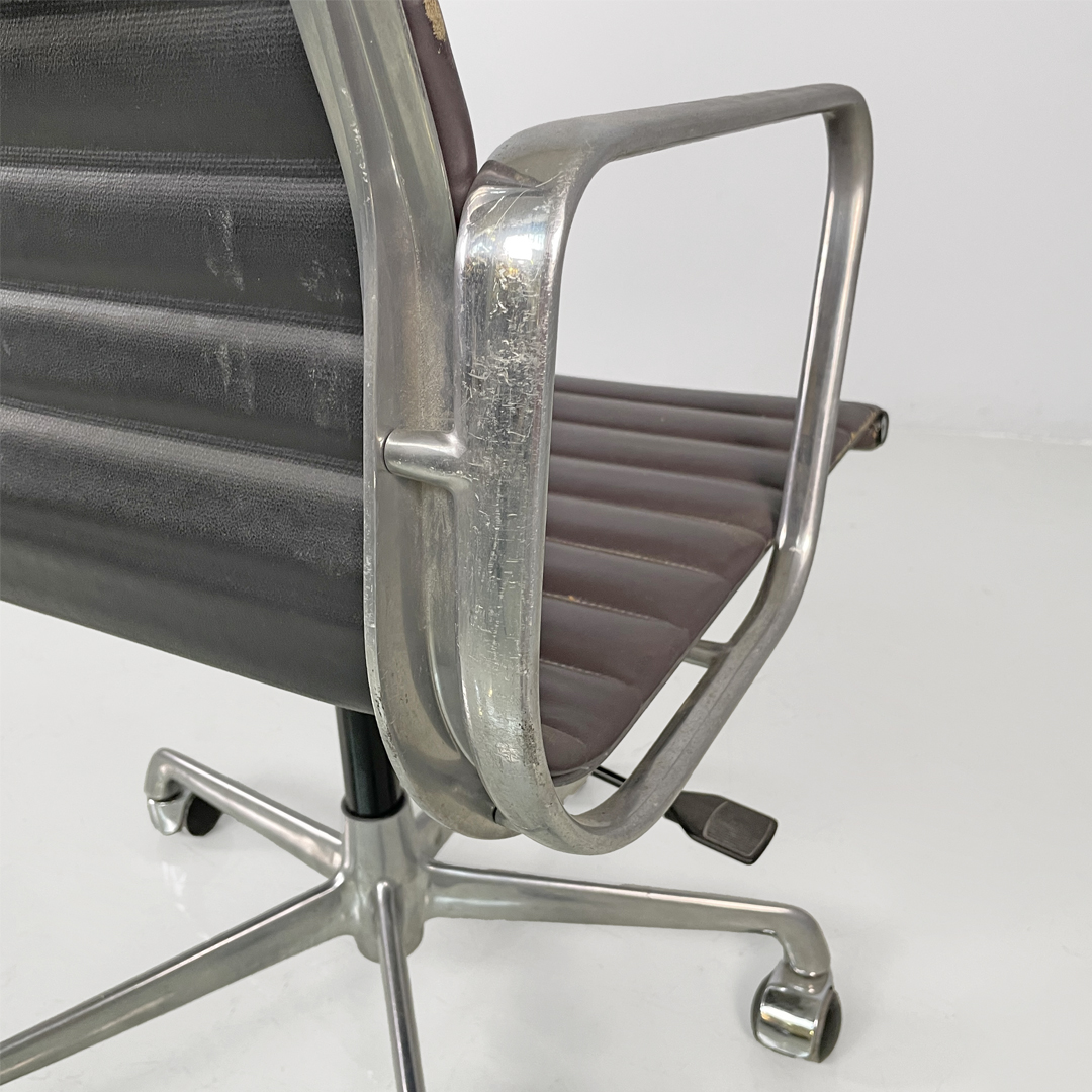 Sedia da ufficio modello EA108 su ruote. La seduta e lo schienale sono rivestite in pelle grigio scuro con cuciture orizzontali. La struttura è in metallo argentato e presenta cinque razze a cui corrispondono altrettante ruote. La sedia presenta una levetta con cui è possibile modificarne l’altezza.