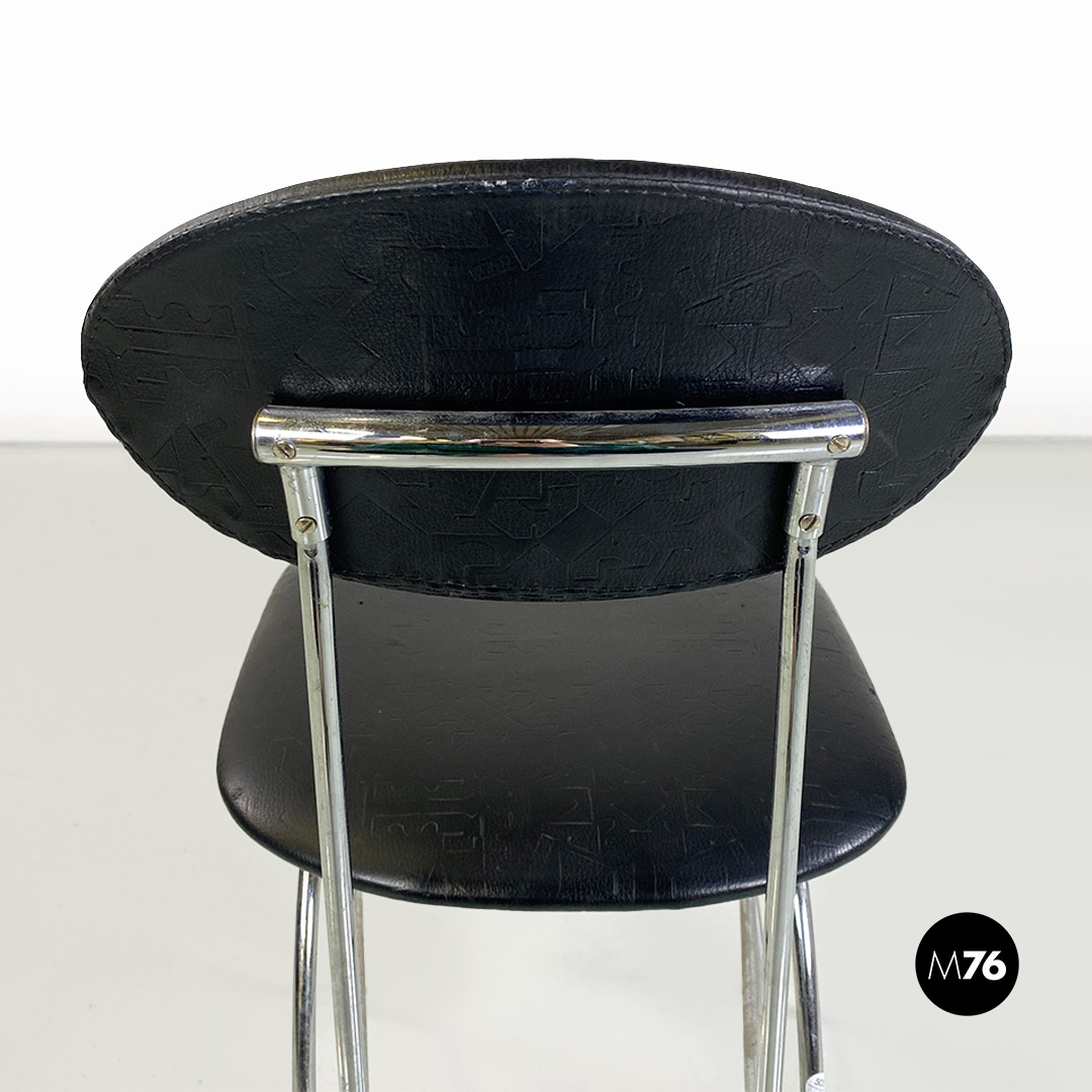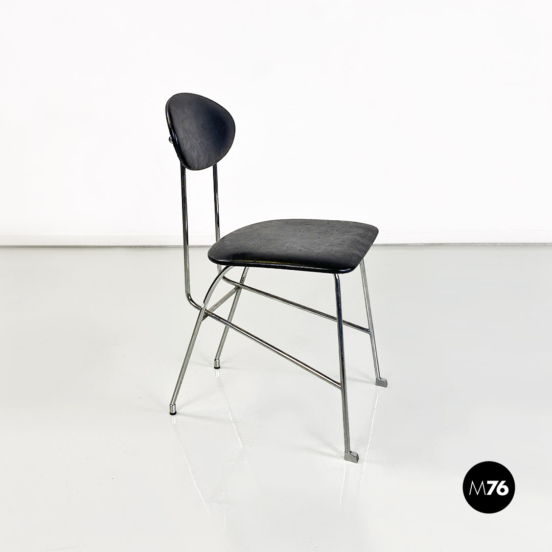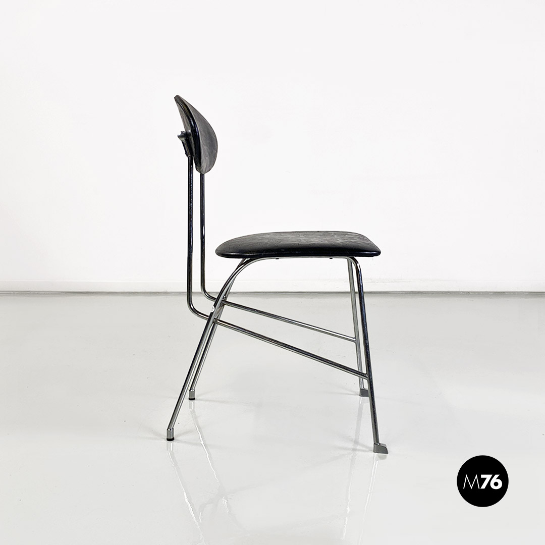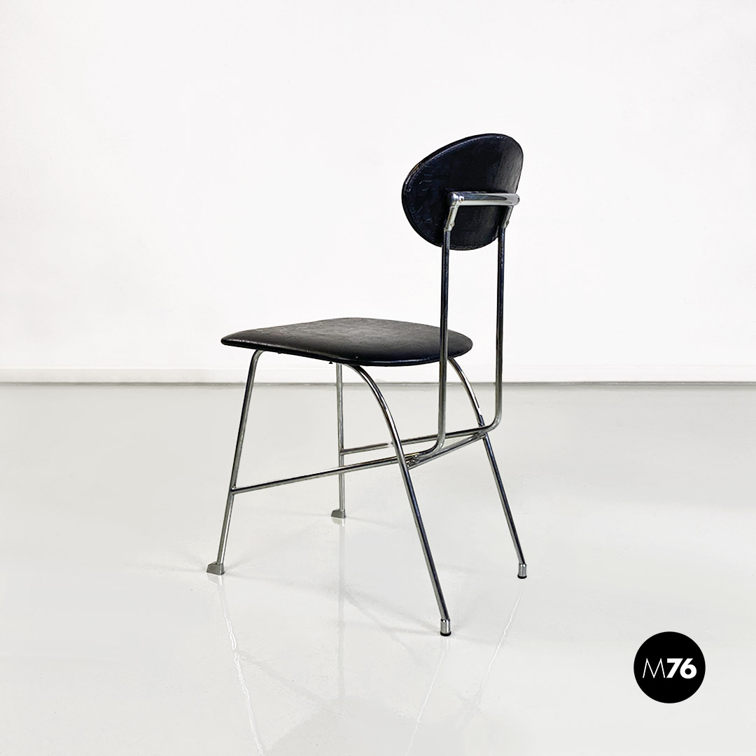 Sedia con seduta e schienale in pelle nera. La struttura è in tondino di metallo cromato.