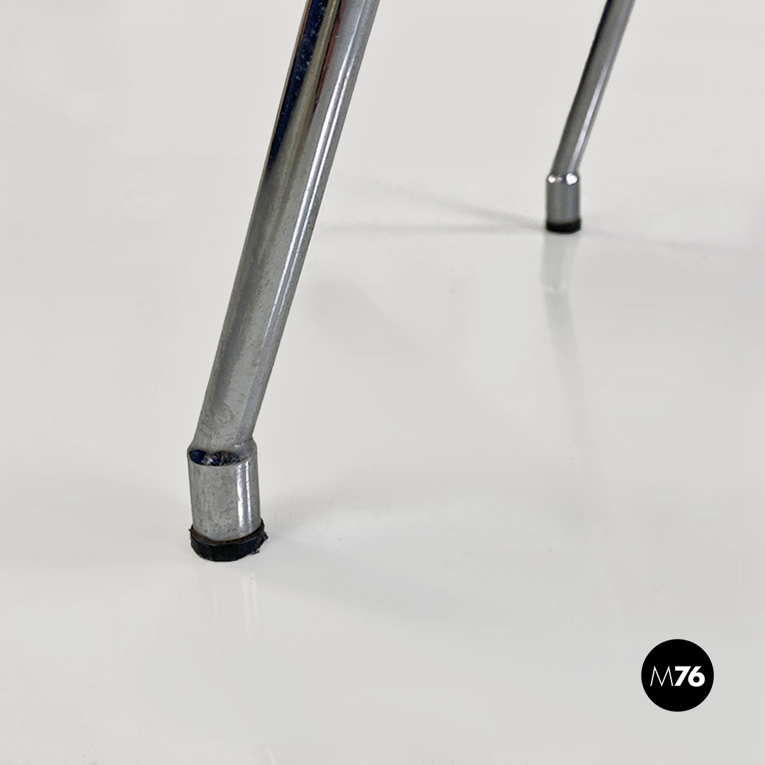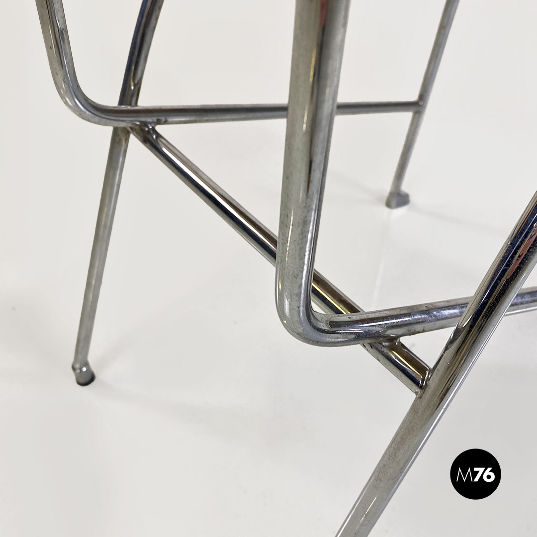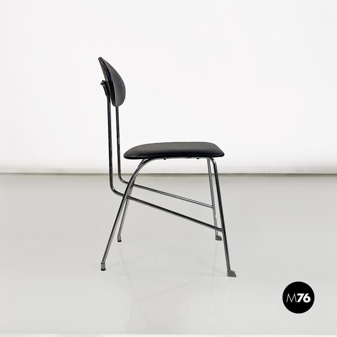 Sedia con struttura in tondino di metallo cromato, rivestimento in pelle nera ed eleganti puntali anteriori e puntali posteriori più semplici a sezione cilindrica.