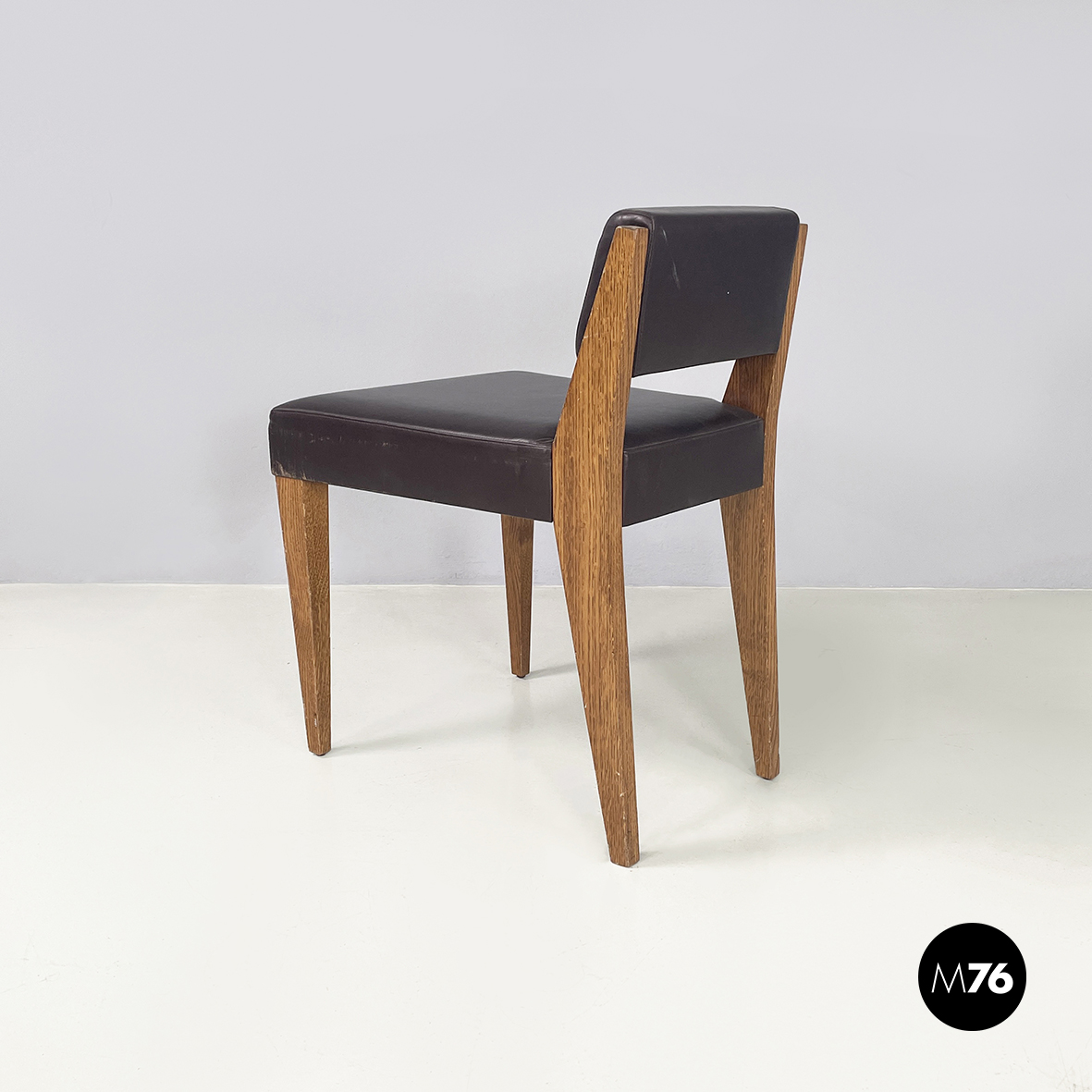 Sedia con seduta e schienale squadrati imbottiti e rivestiti in pelle marrone scuro. La struttura a sezione quadrata è in legno.