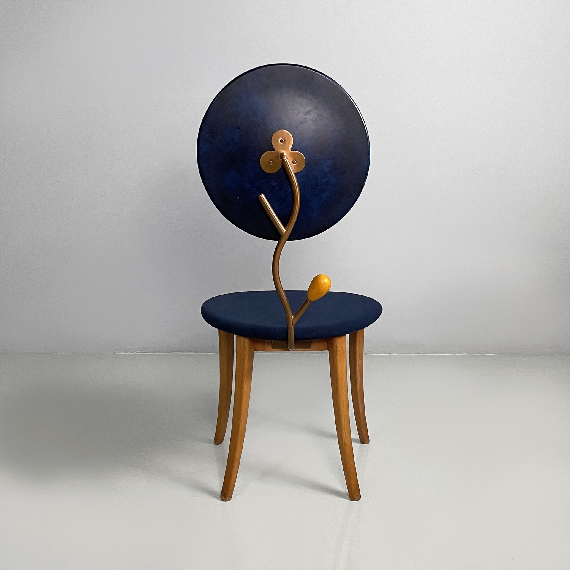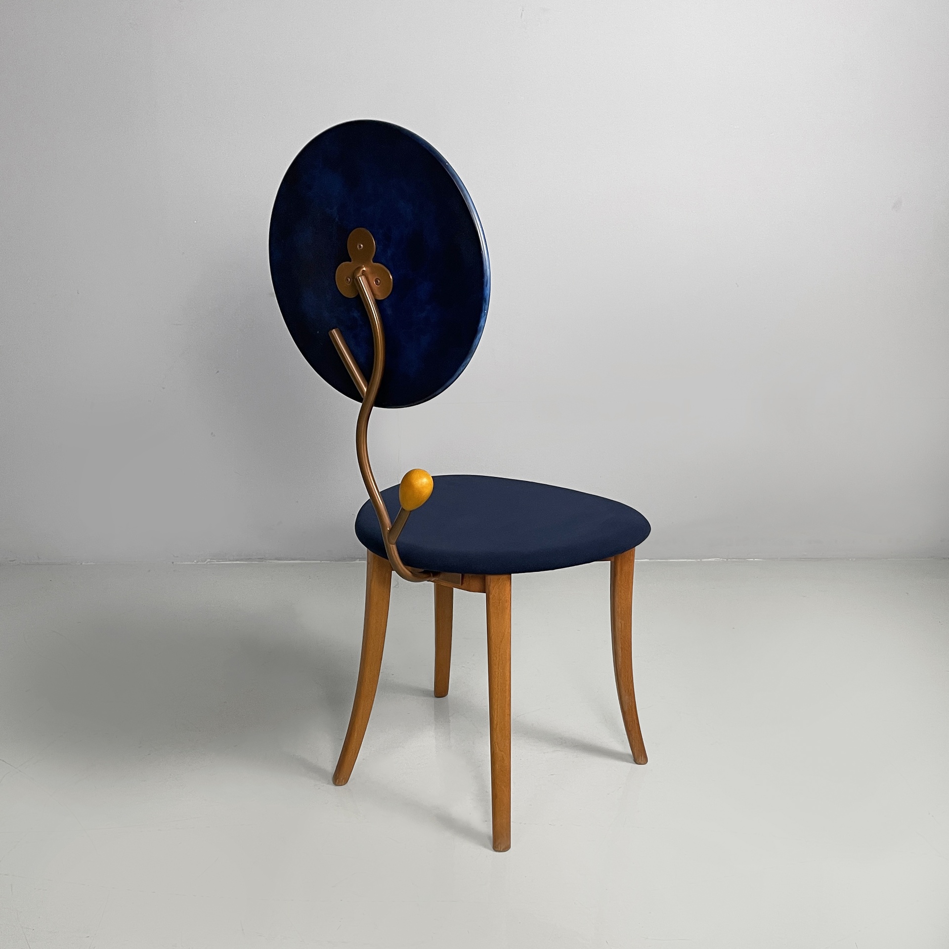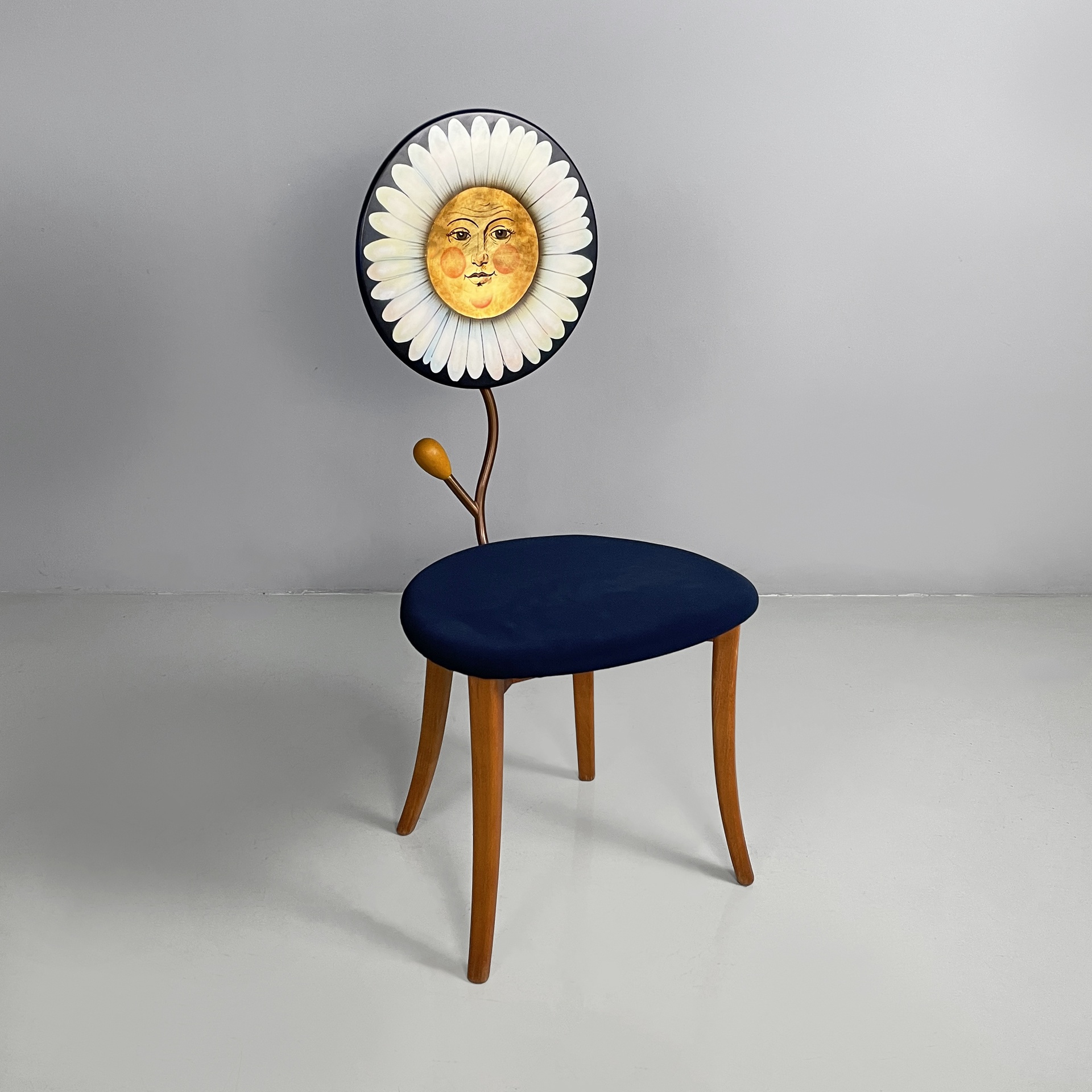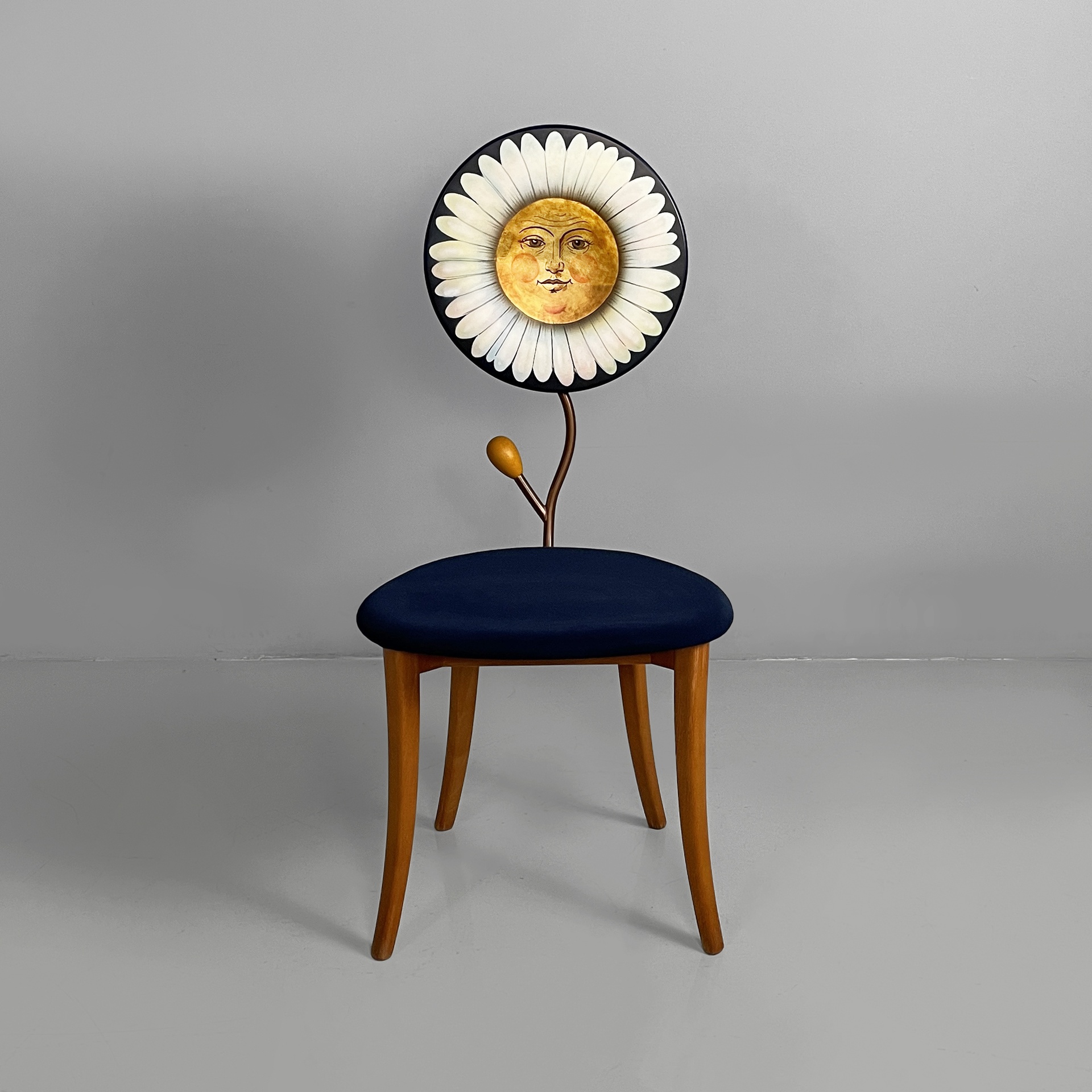 Sedia in legno, metallo e tessuto blu. Lo schienale tondo è in legno verniciato blu con disegno di margherita con al centro un volto sorridente, con finitura dorata. La struttura dello schienale è in tondino di metallo curvato con elemento in legno decorativo. La seduta è imbottita e rivestita in tessuto blu. Le zampe a sezione squadrata sono in legno.