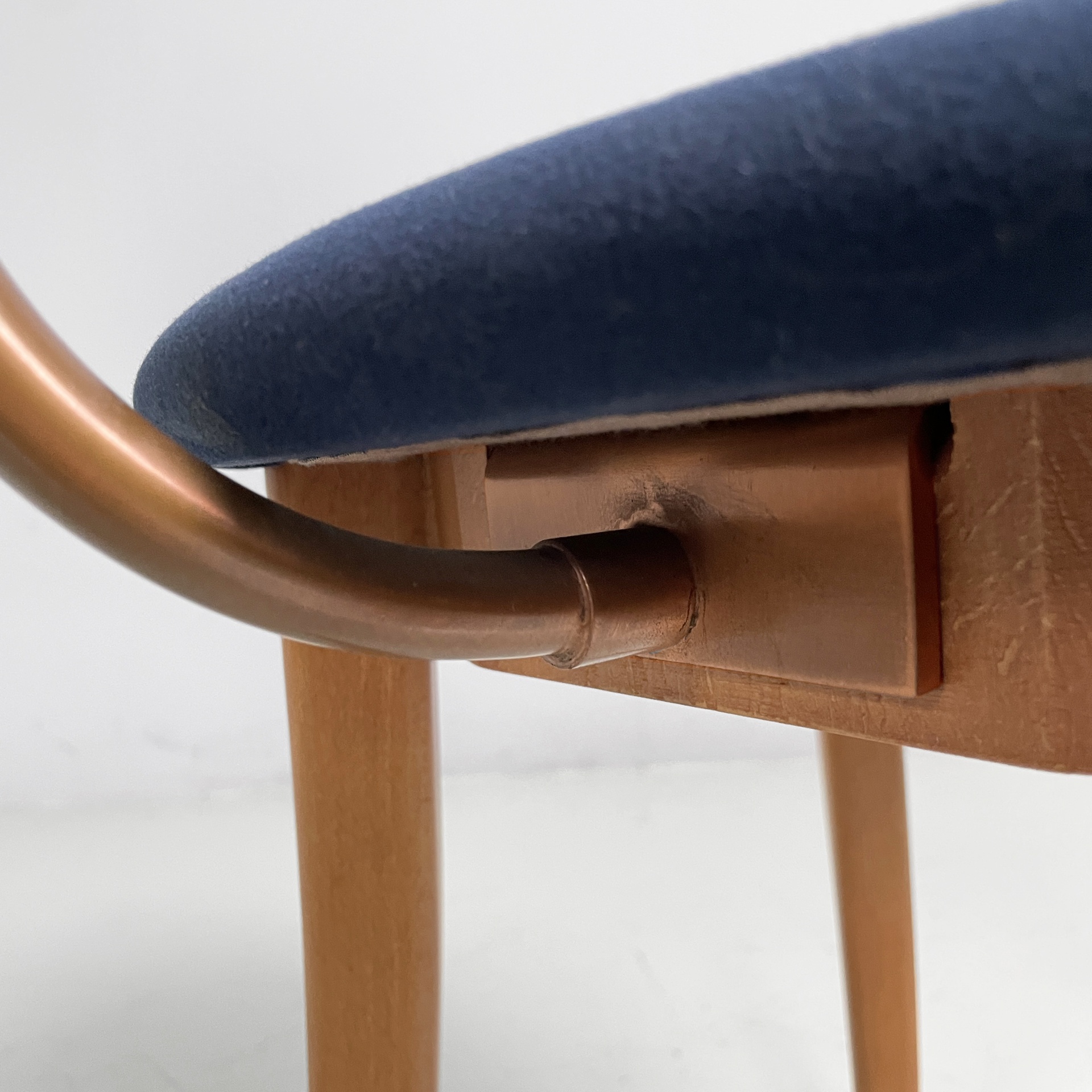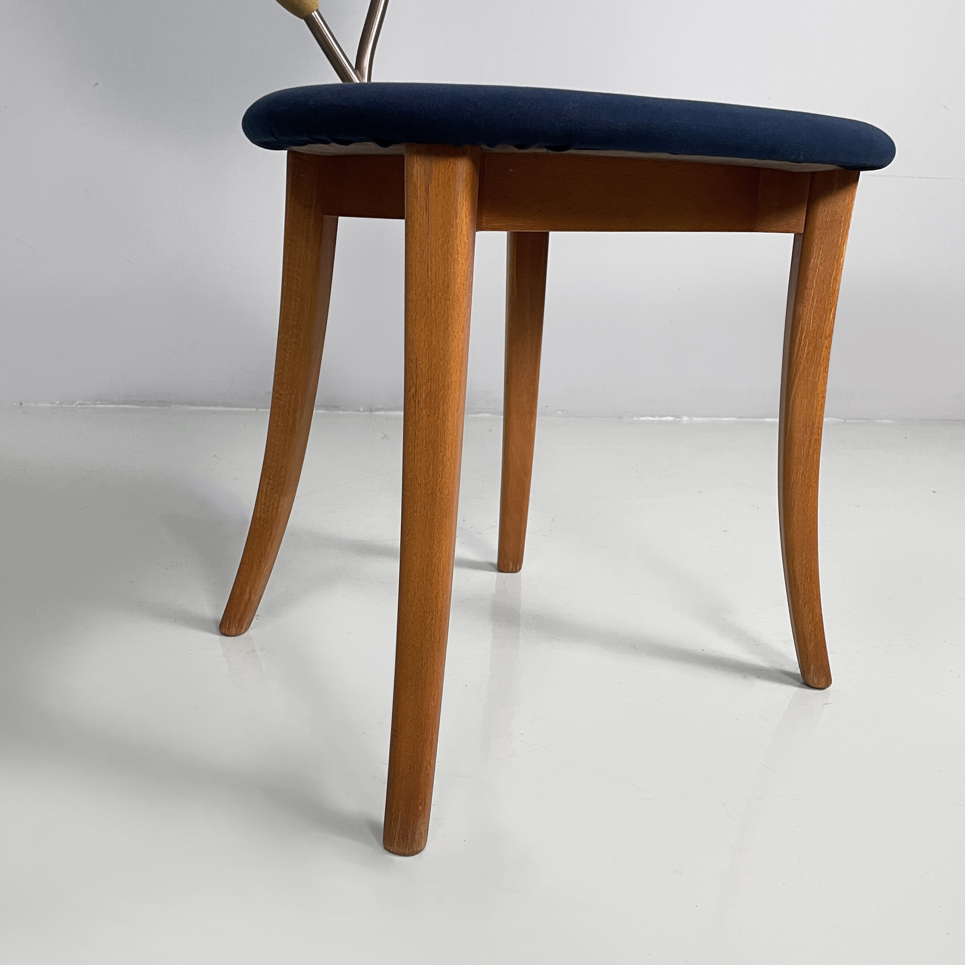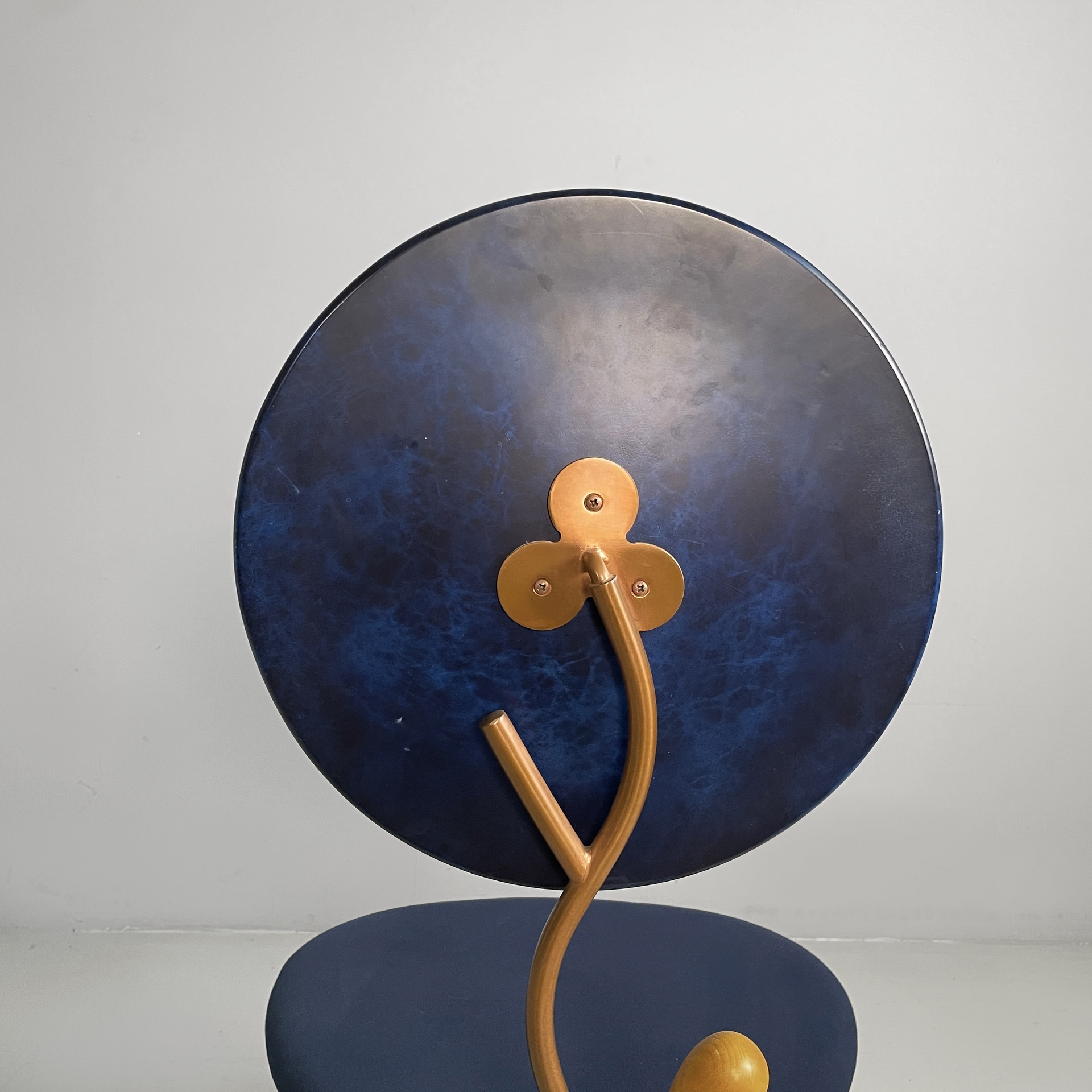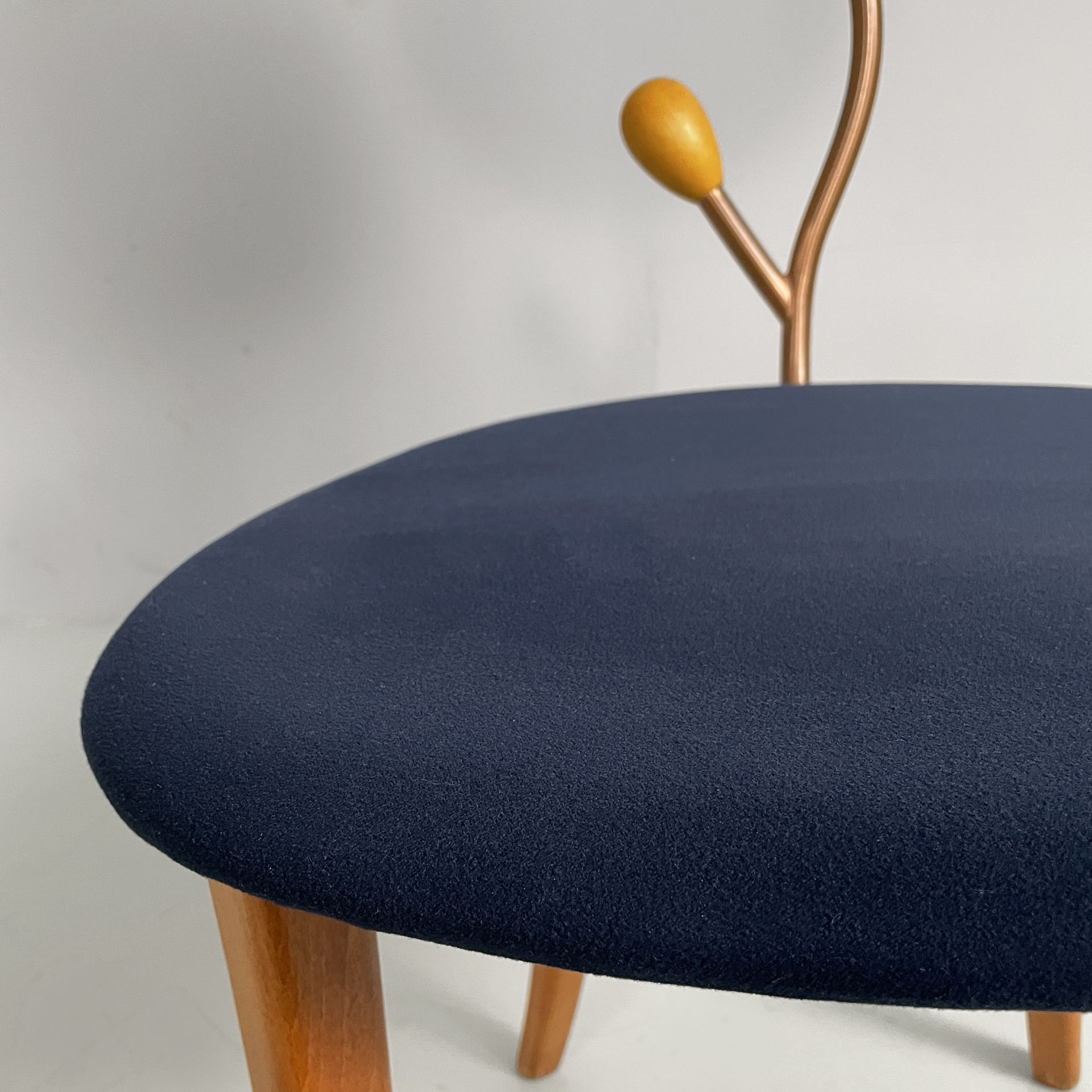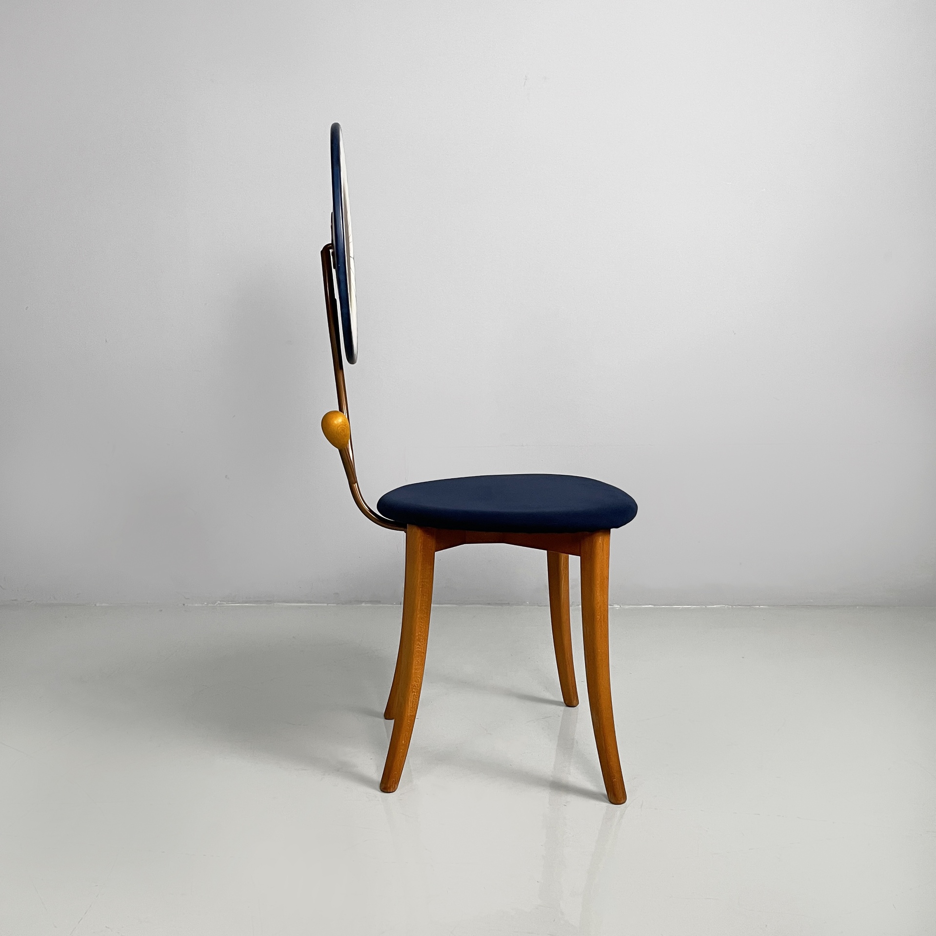 Sedia in legno, metallo e tessuto blu. Lo schienale tondo è in legno verniciato blu con disegno di margherita con al centro un volto sorridente, con finitura dorata. La struttura dello schienale è in tondino di metallo curvato con elemento in legno decorativo. La seduta è imbottita e rivestita in tessuto blu. Le zampe a sezione squadrata sono in legno.