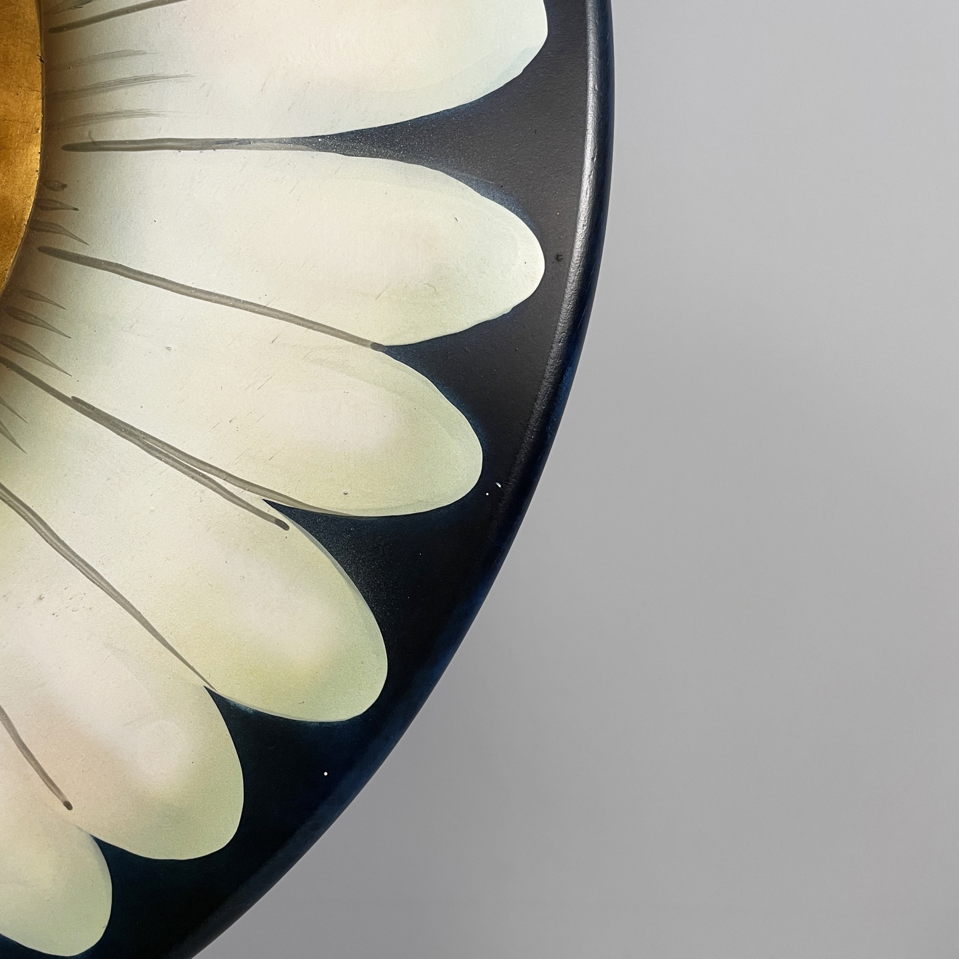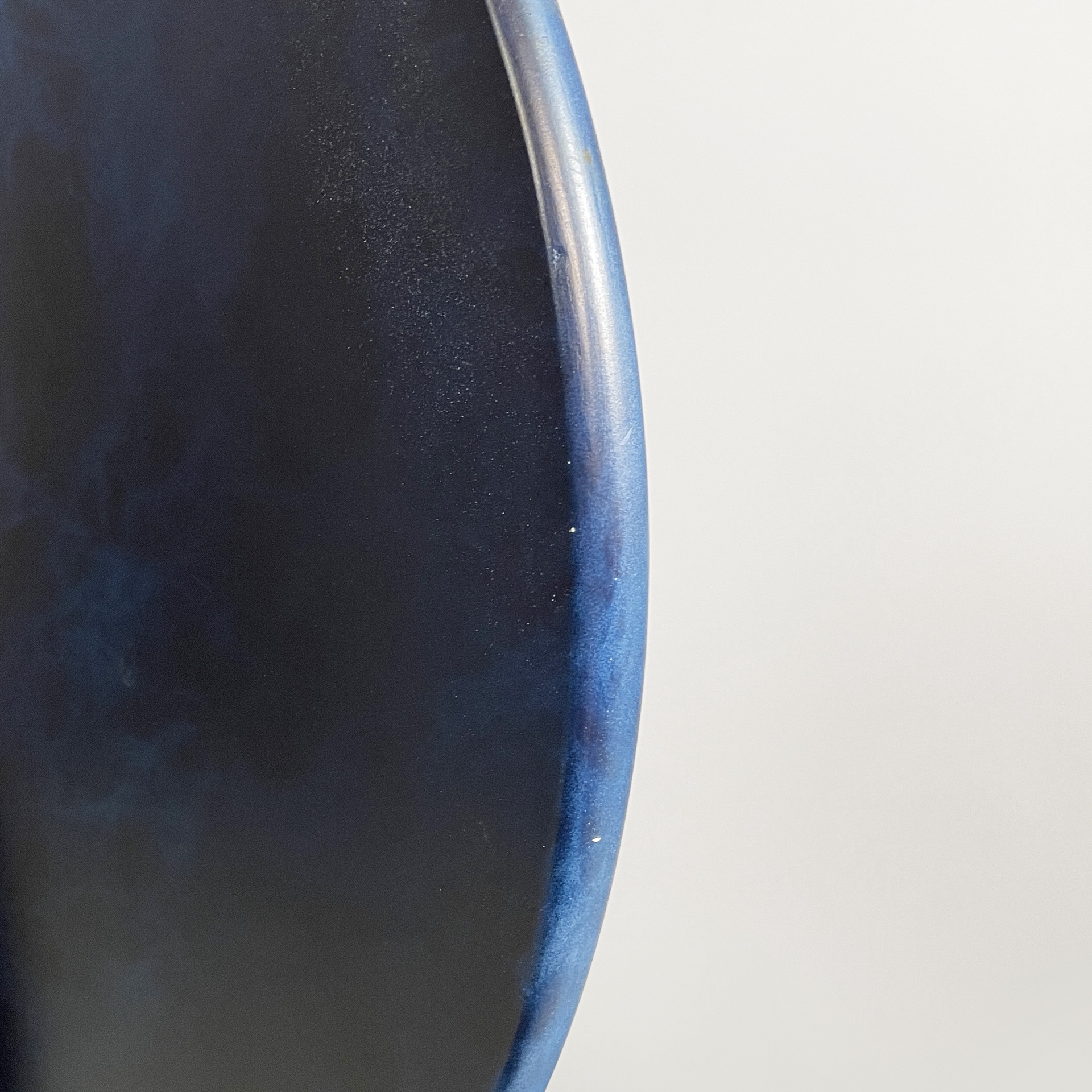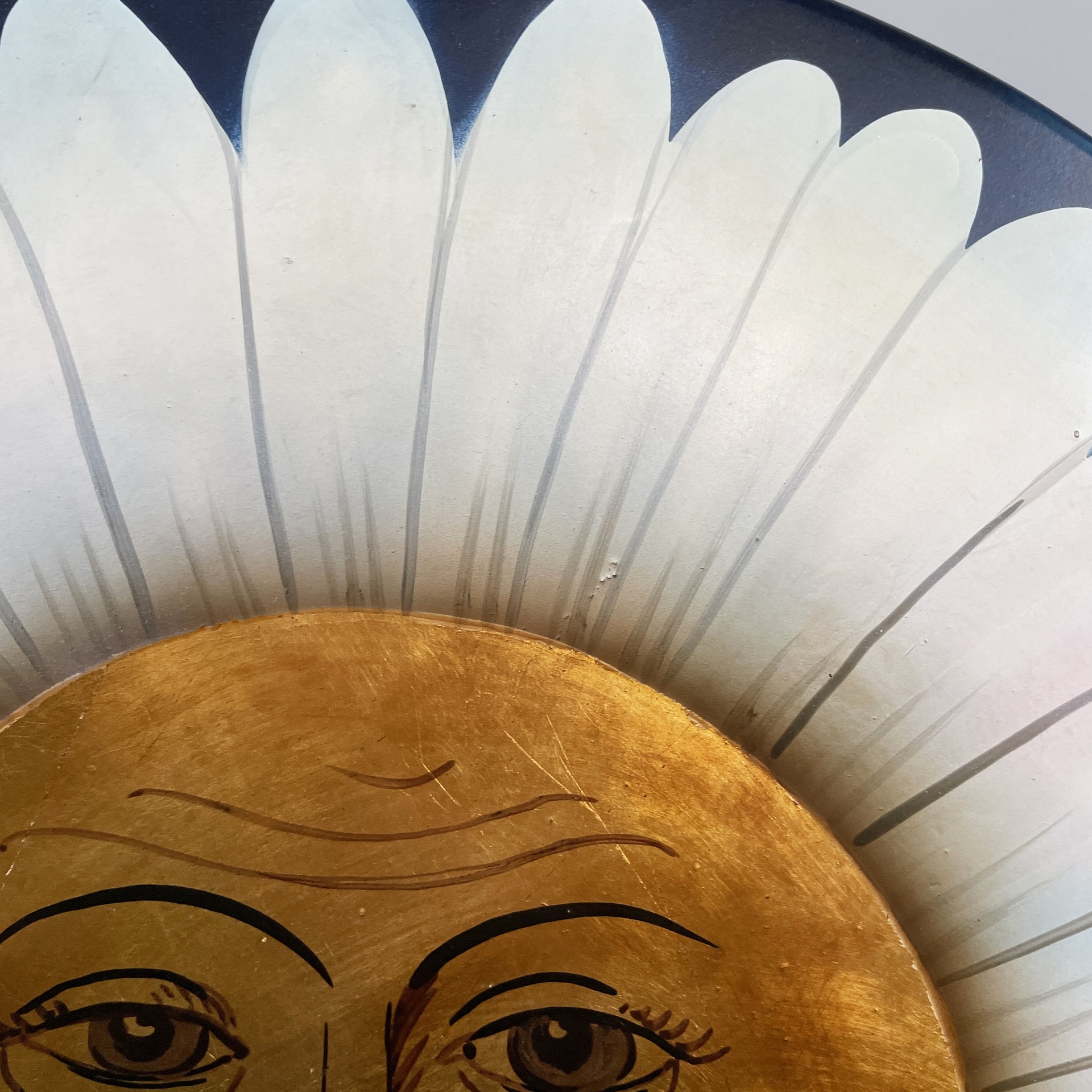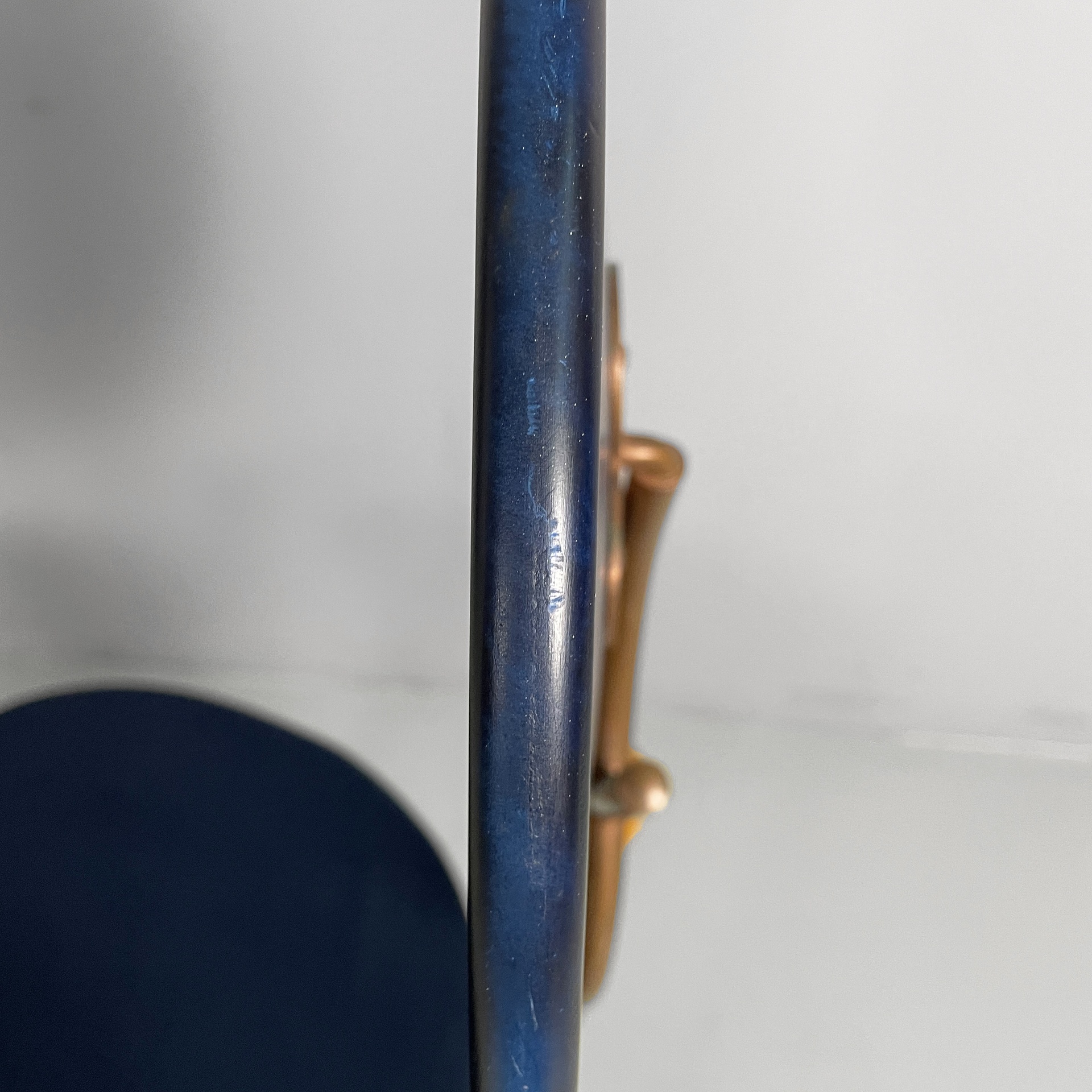 Sedia in legno, metallo e tessuto blu. Lo schienale tondo è in legno verniciato blu con disegno di margherita con al centro un volto sorridente, con finitura dorata. La struttura dello schienale è in tondino di metallo curvato con elemento in legno decorativo. La seduta è imbottita e rivestita in tessuto blu. Le zampe a sezione squadrata sono in legno.