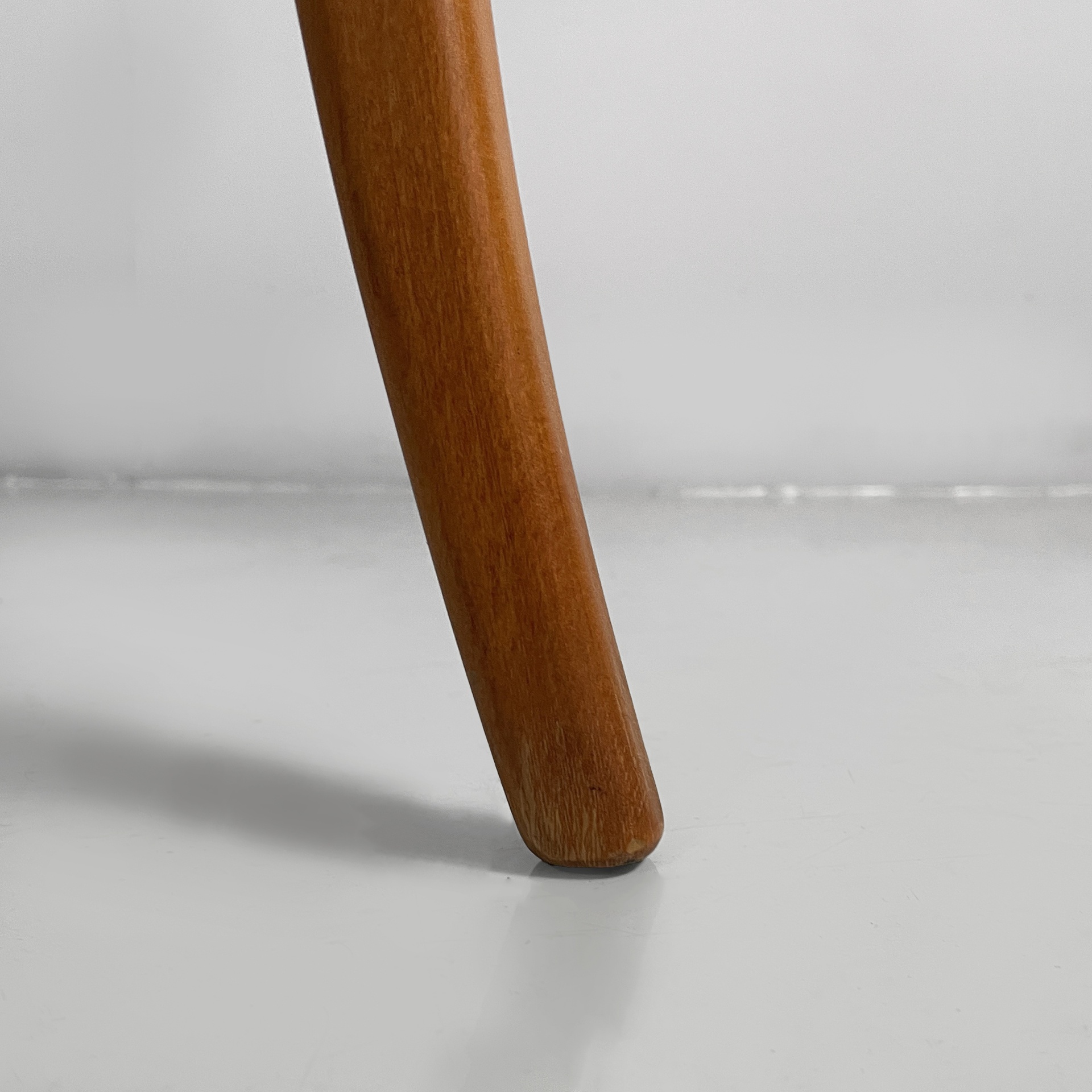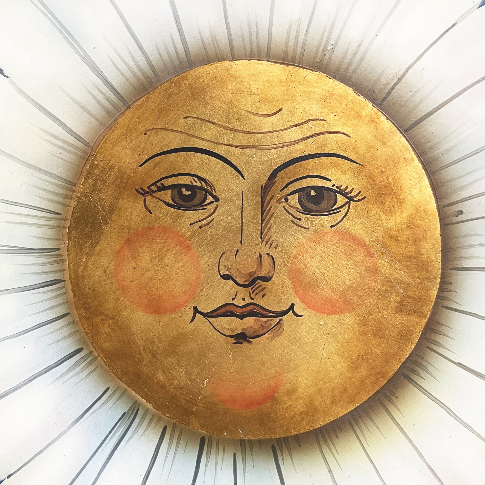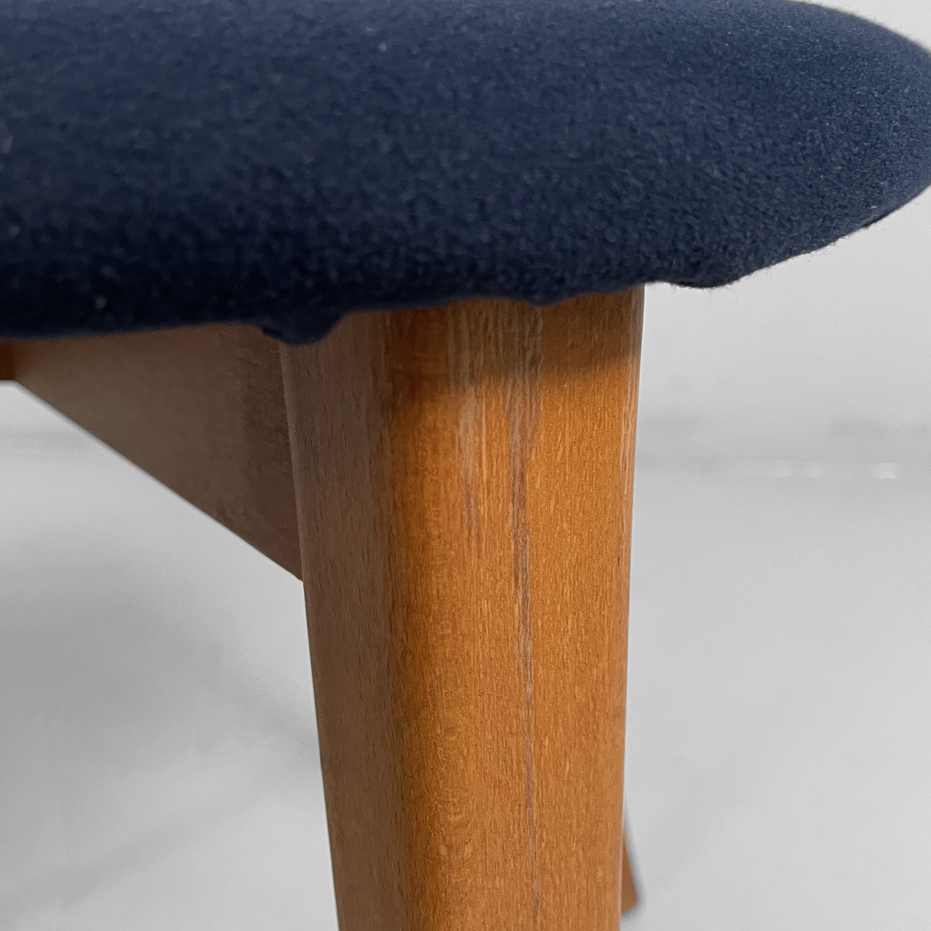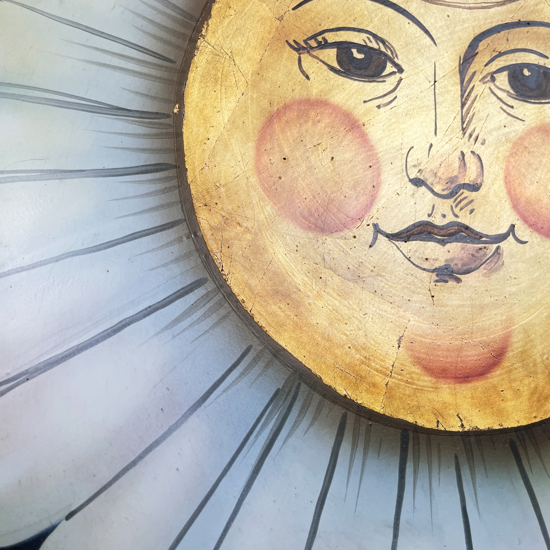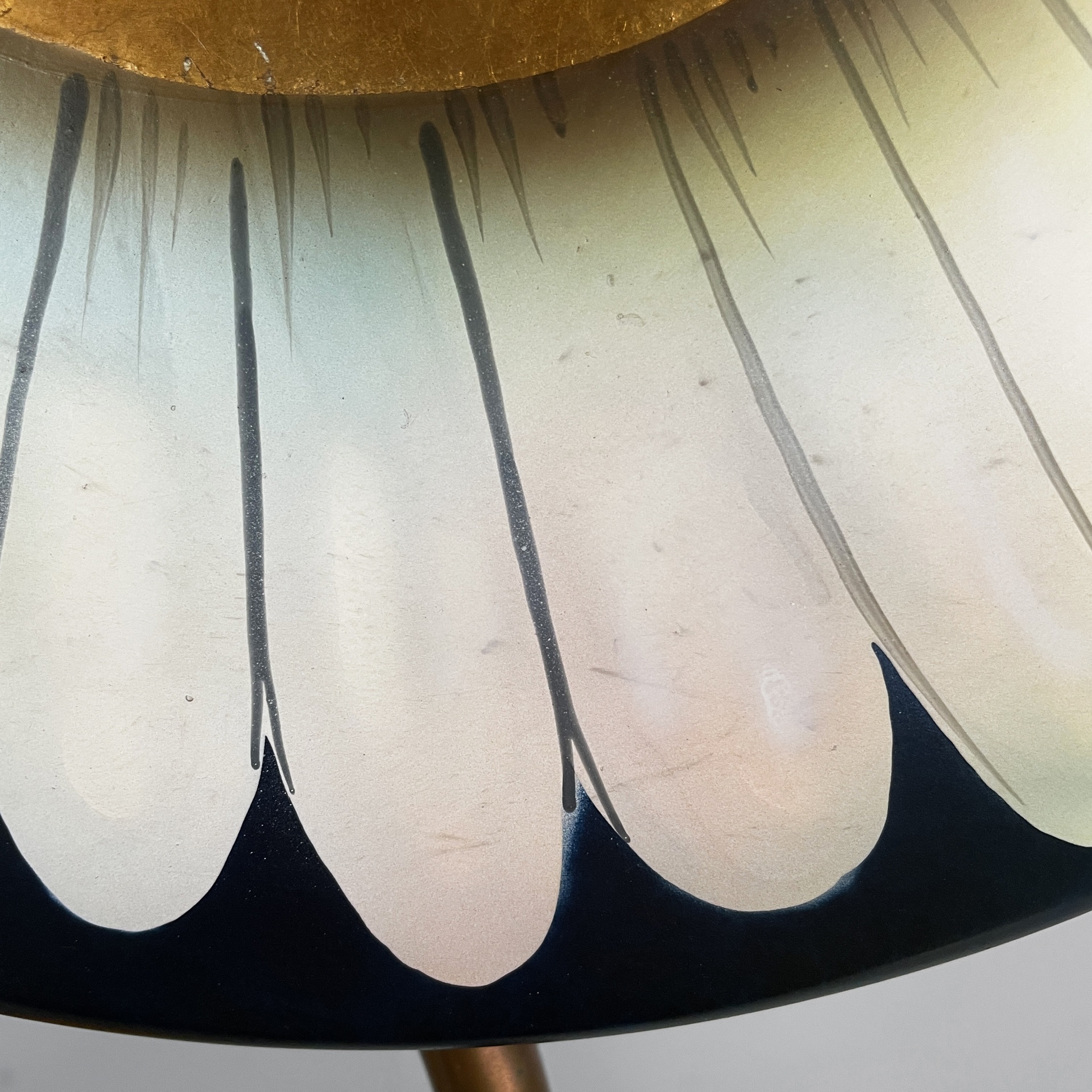 Sedia in legno, metallo e tessuto blu. Lo schienale tondo è in legno verniciato blu con disegno di margherita con al centro un volto sorridente, con finitura dorata. La struttura dello schienale è in tondino di metallo curvato con elemento in legno decorativo. La seduta è imbottita e rivestita in tessuto blu. Le zampe a sezione squadrata sono in legno.
